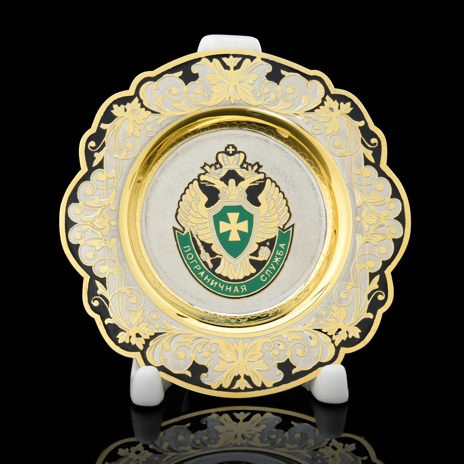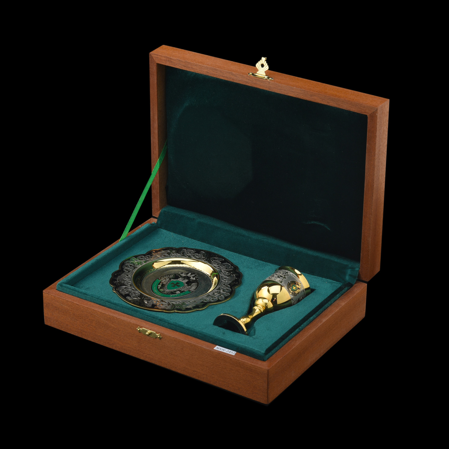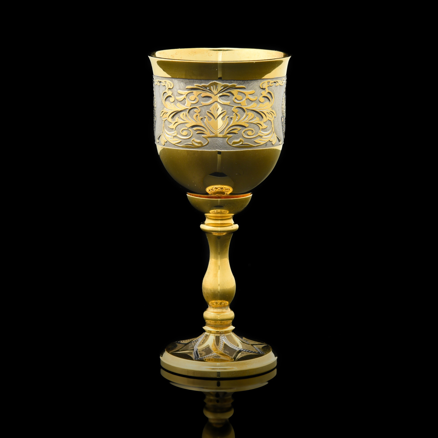 Золотая композиция для интерьера в стиле ампир с рюмками из металла, искусно декорированными гравюрами и золотом, с гербом РФ, создает в интерьере притягательный акцент. Изготовлена для любителей интерьерных аксессуаров класса люкс. Распитие алкоголя с набором превращается в торжественный ритуал. Корпуса рюмок отлиты из латуни с использованием форм Императорского фарфорового завода, украшены выгравированным композициями, при создании которых традиционно применяются техники Златоустовской гравюры на металле. Златоустовская гравюра на металле - самобытный русский народный промысел, зародившийся в начале 19 века как способ украшения холодного оружия, производимого на Оружейном заводе, который был построен по указу русского царя Александра I в городке Златоуст. Техника исполнения: токарные работы, рисовка кистью, гравировка иглой по лаку, травление, гравировка резцом, полировка, никелирование, золочение. В изделии использовались традиционные методы обработки и украшения Златоустовской гравюры на металле.