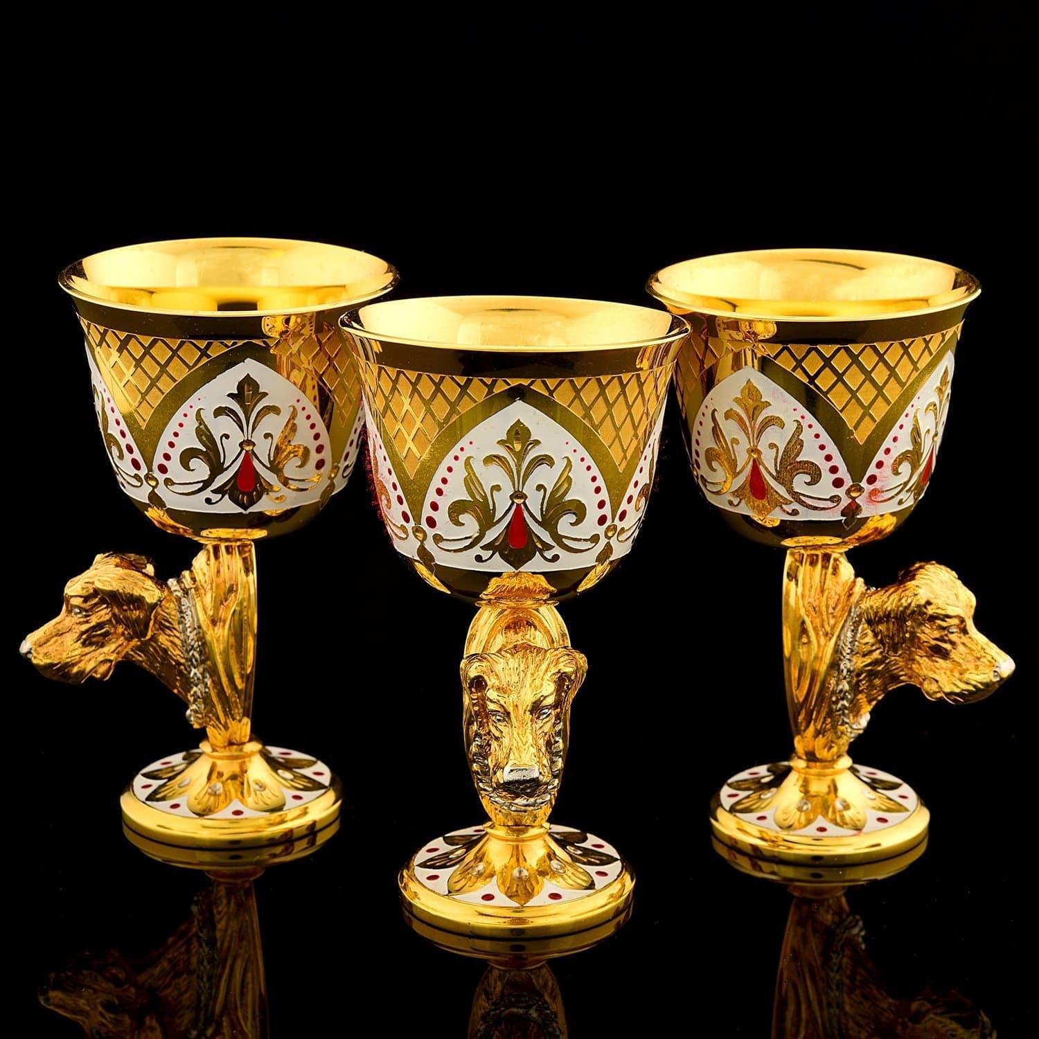 Каждое изделие набора воспевает образ собаки - символа 2018 года, друга человека. Собачья морда, изображенная в технике художественного литья на ножке каждого фужера, 100% радует глаз, поднимает настроение и составляет компанию во время церемонии. Три фужера изготовлены вручную мастерами Златоуста - поставщиками посуды, холодного оружия и элементов декора ручной работы для главной резиденции президента России, Московского Кремля.Как полагал русский царь Иван Васильевич, из дорогого сосуда можно пить не пьянея.