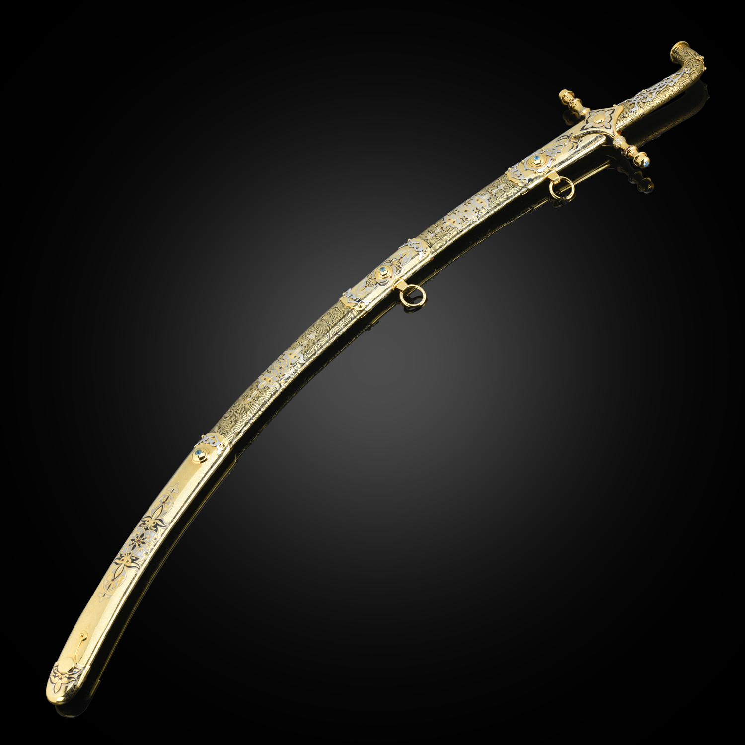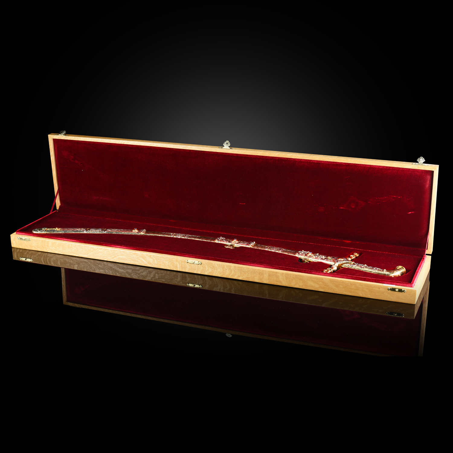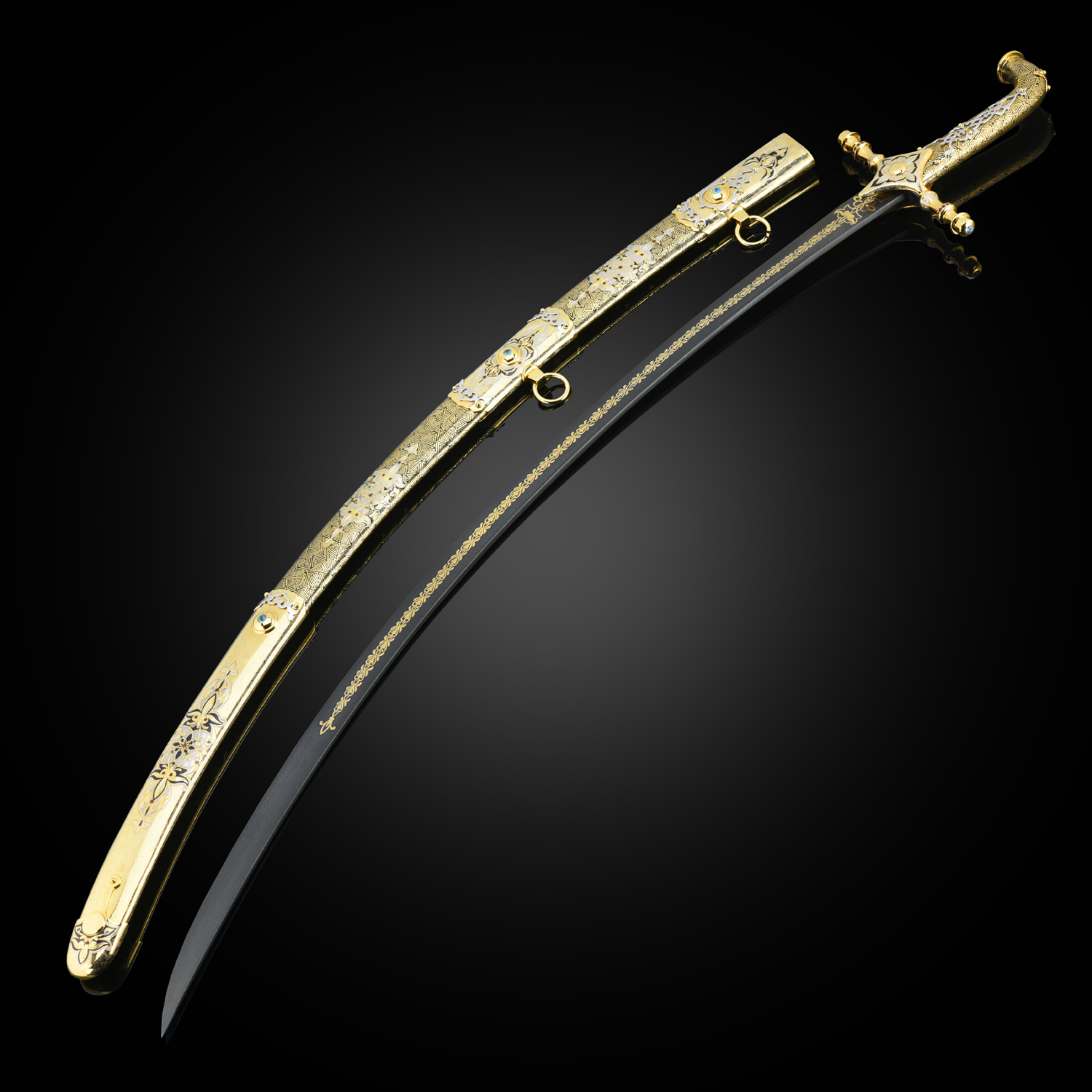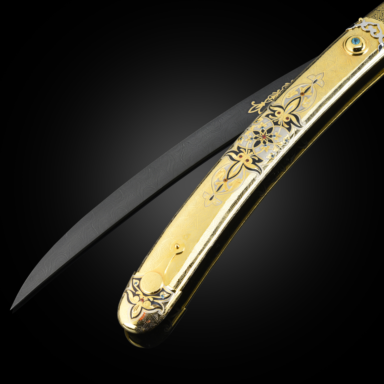 Материалы: дамасская сталь, латунь, никель, золото 999,9*, эмаль, фианиты.