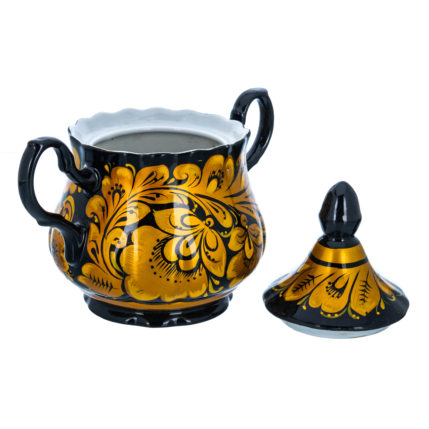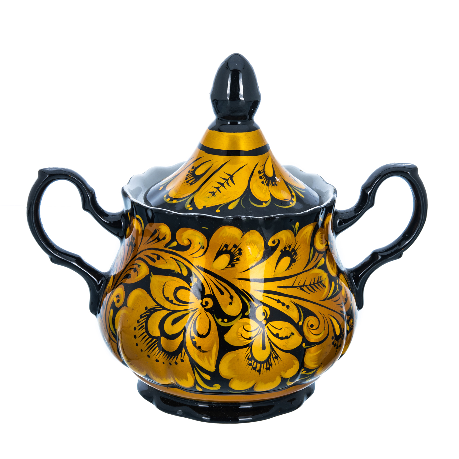 0070026 Хохлома Сахарница КУДРИНА на черном фоне ручки