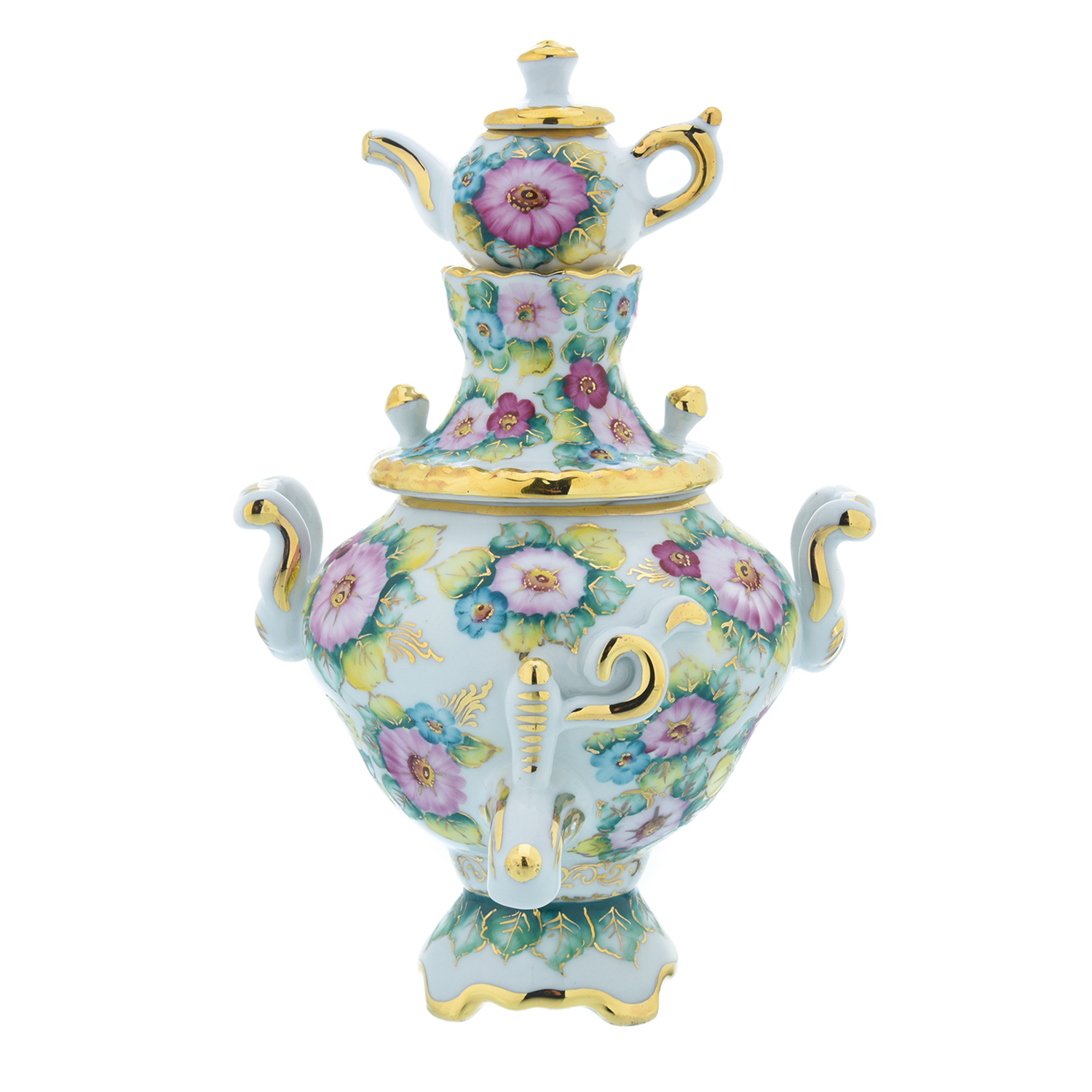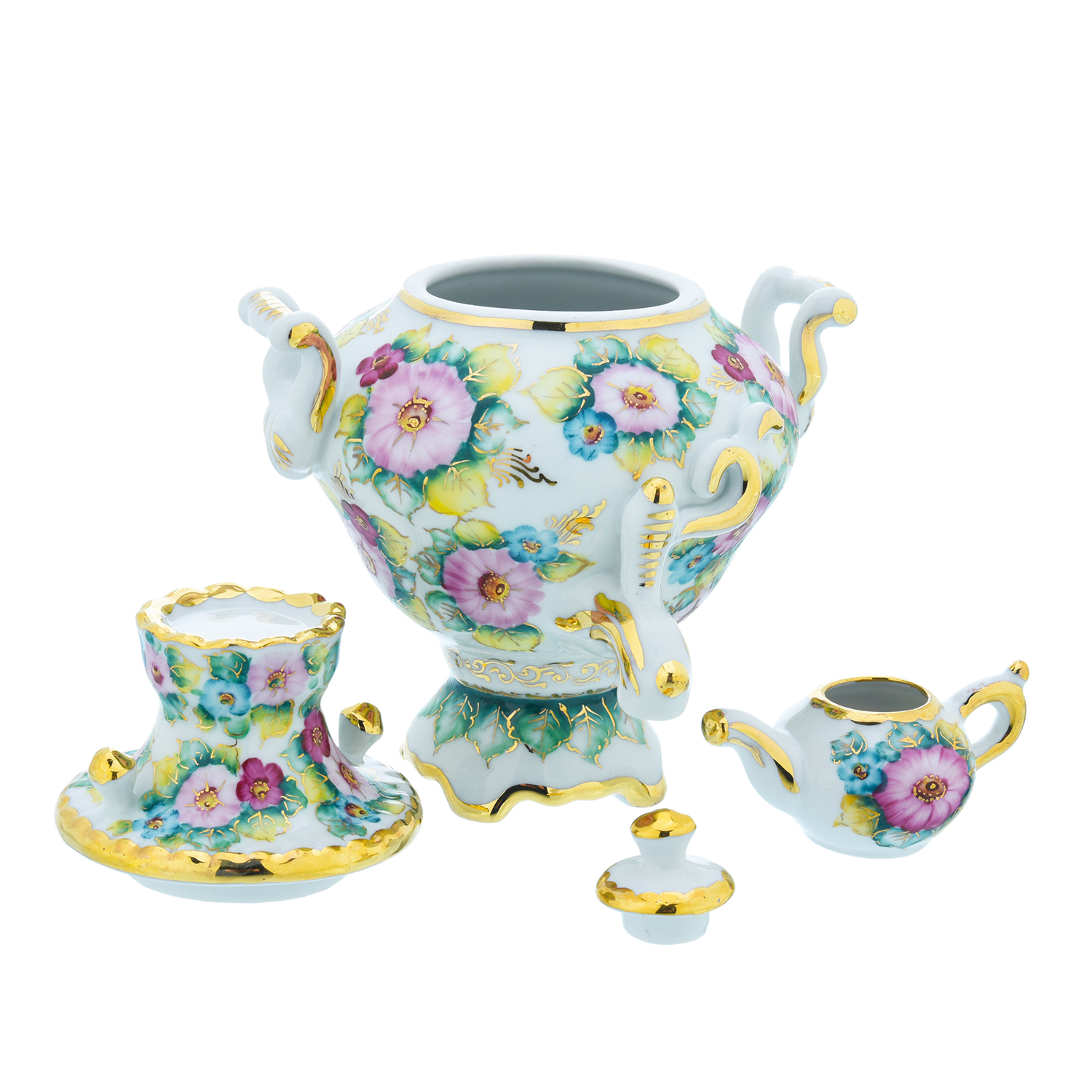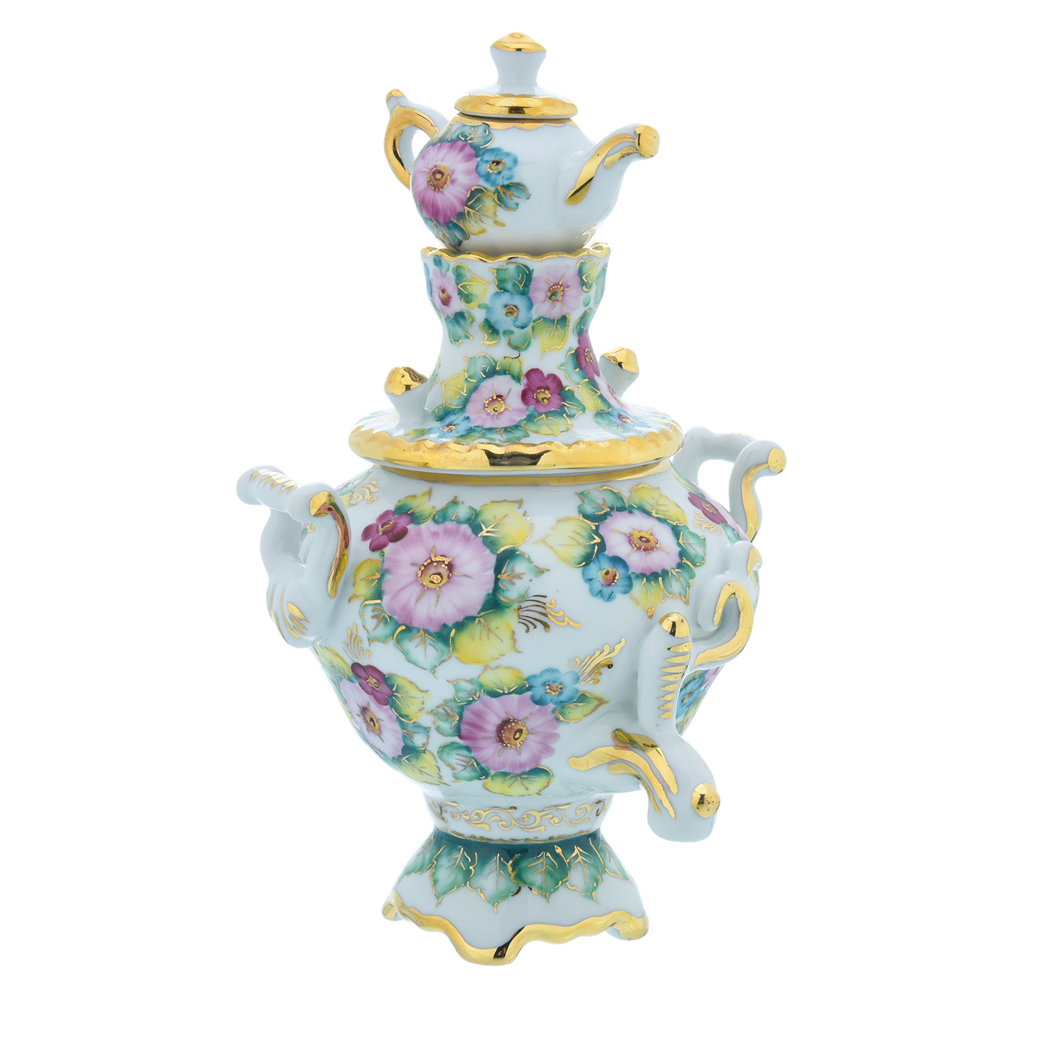 Сувенирный самовар-шкатулка "Цветы". Гжель в цвете и золоте