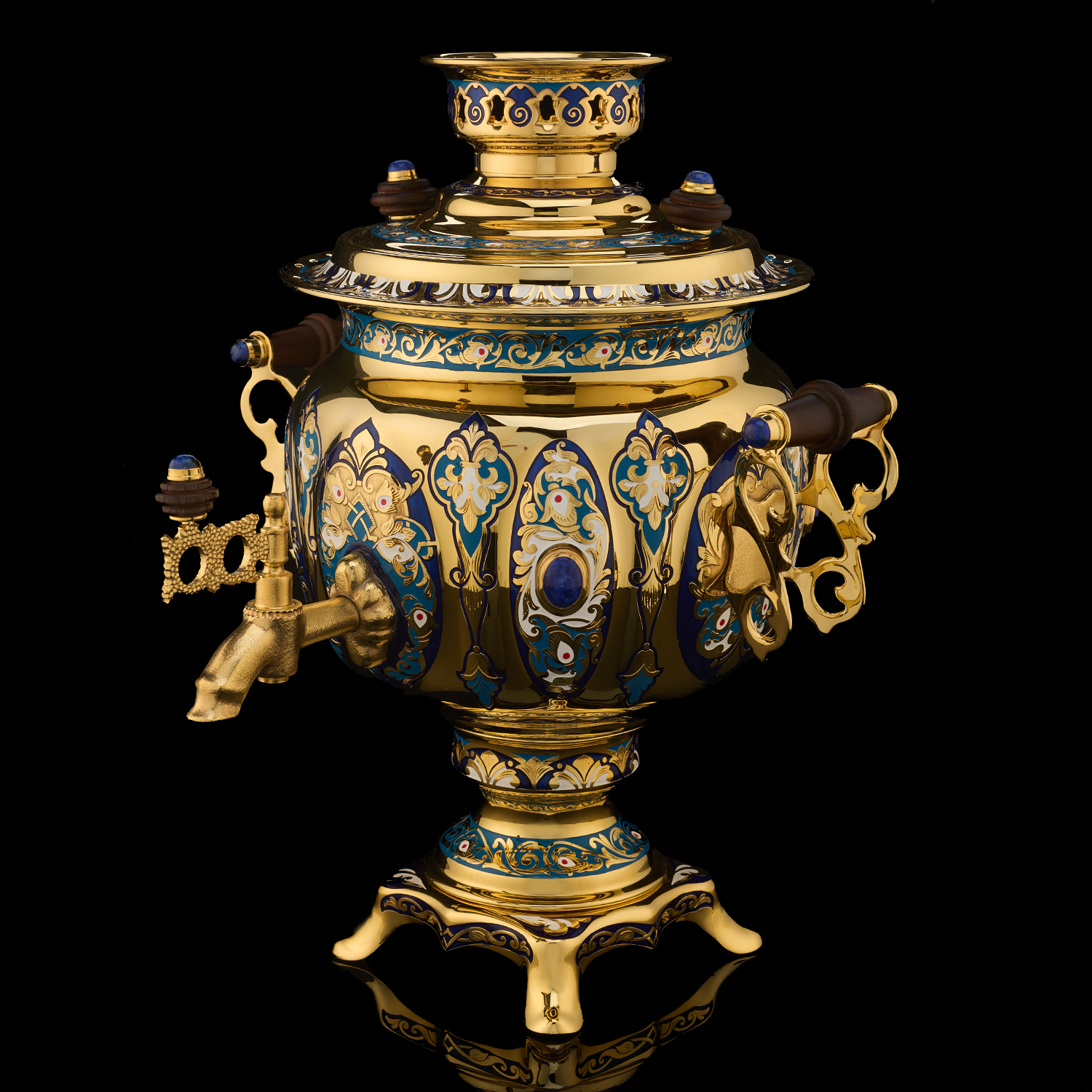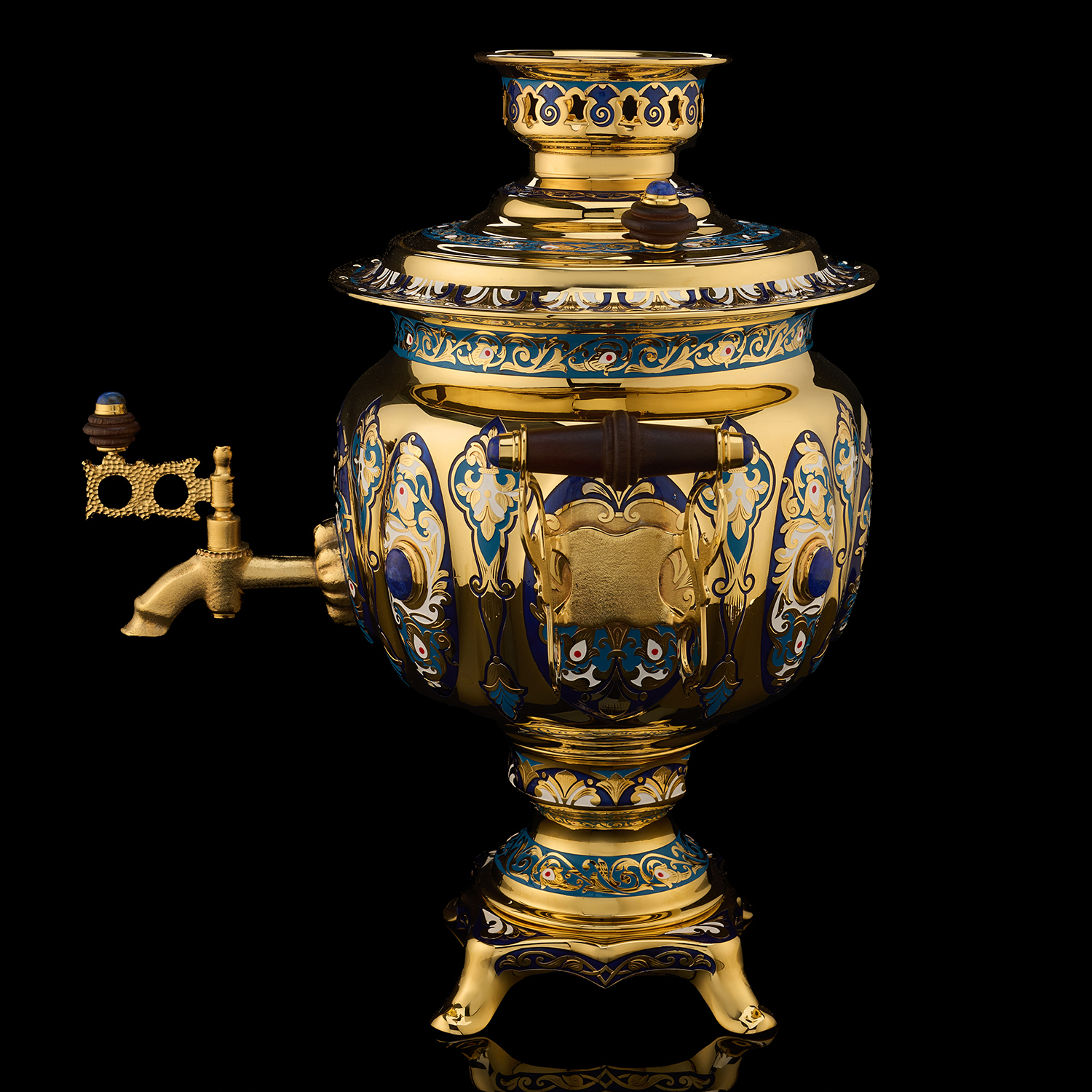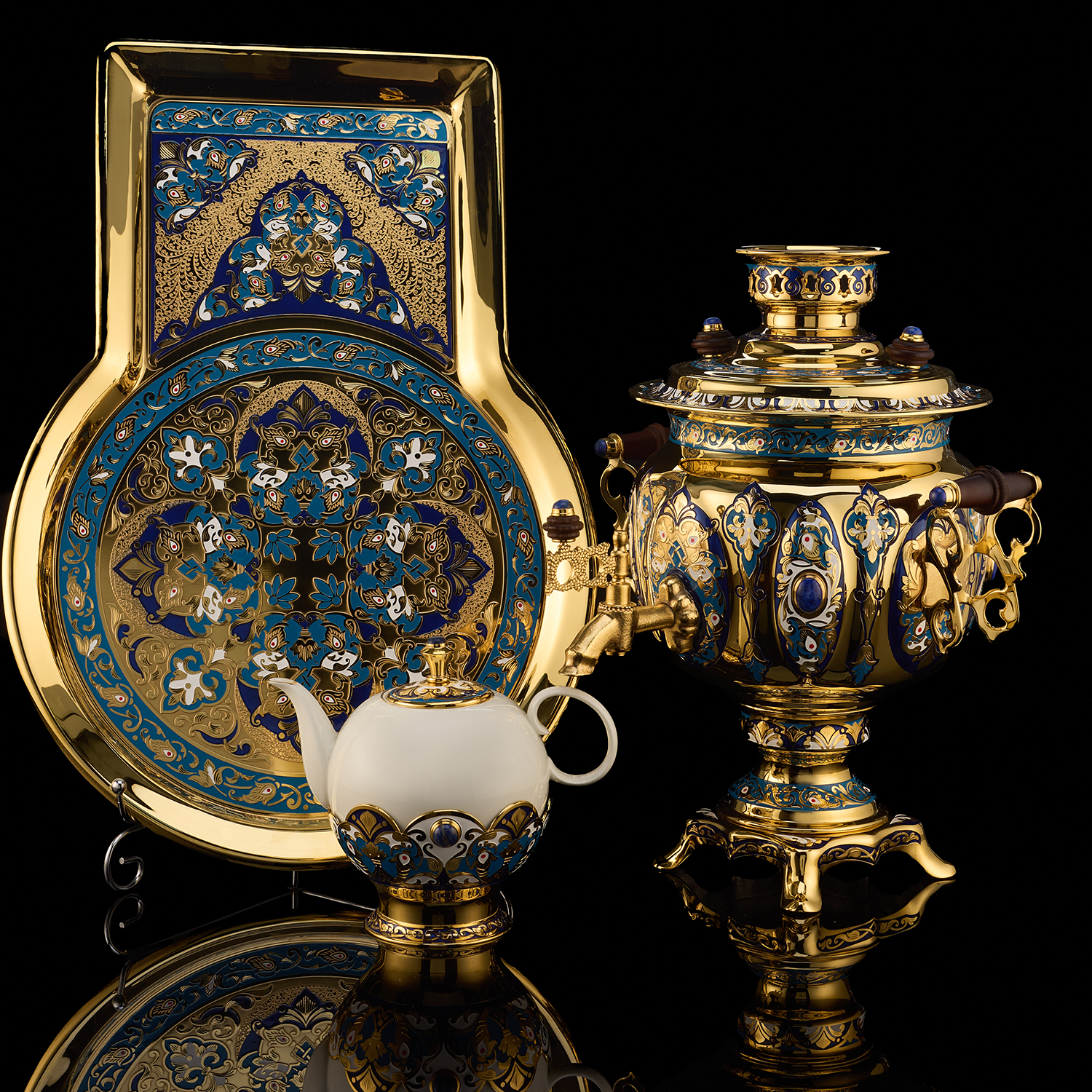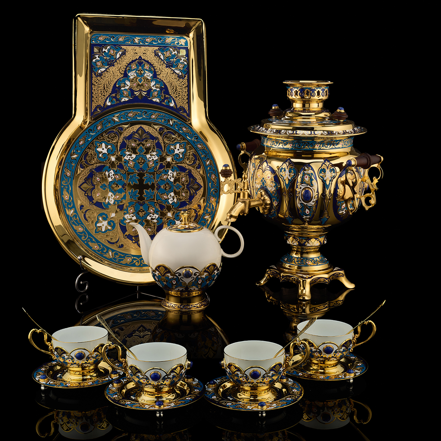 Самовар 3 л с сервизом на 4 персоны "Чаепитие". Златоуст.Материалы: латунь, никель, золото 999,9*, эмаль, лазурит, костяной фарфор.