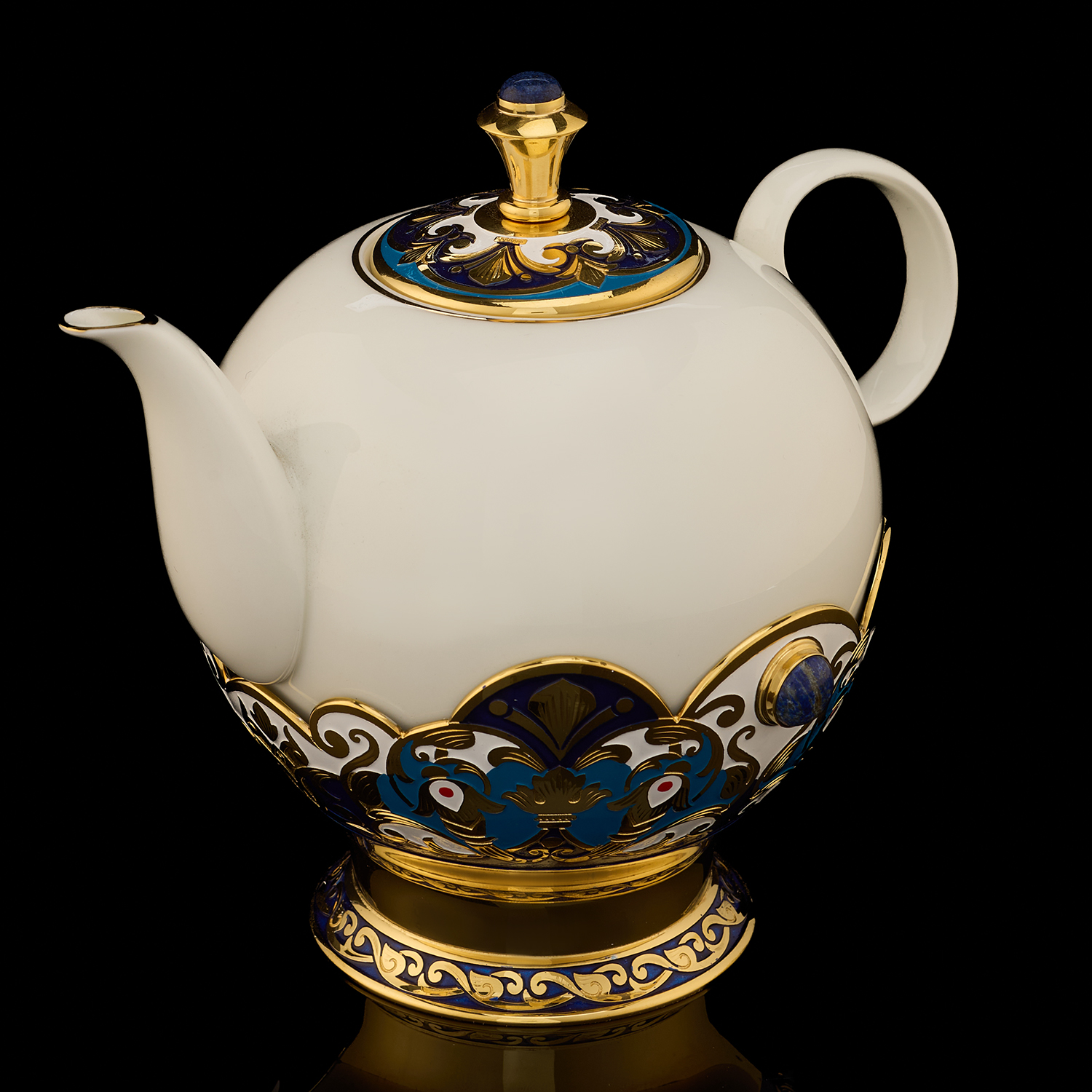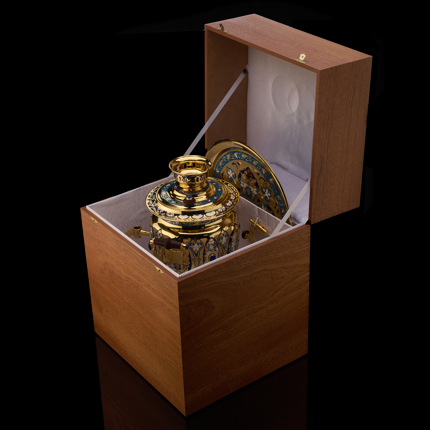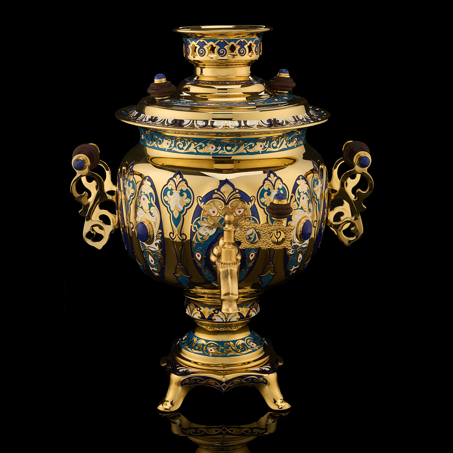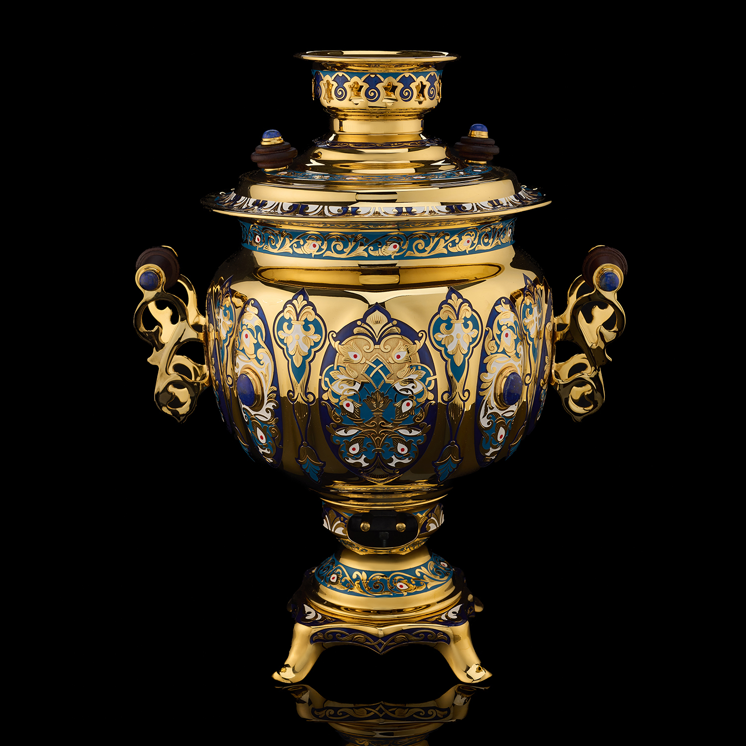 Самовар 3 л с сервизом на 4 персоны "Чаепитие". Златоуст.Материалы: латунь, никель, золото 999,9*, эмаль, лазурит, костяной фарфор.