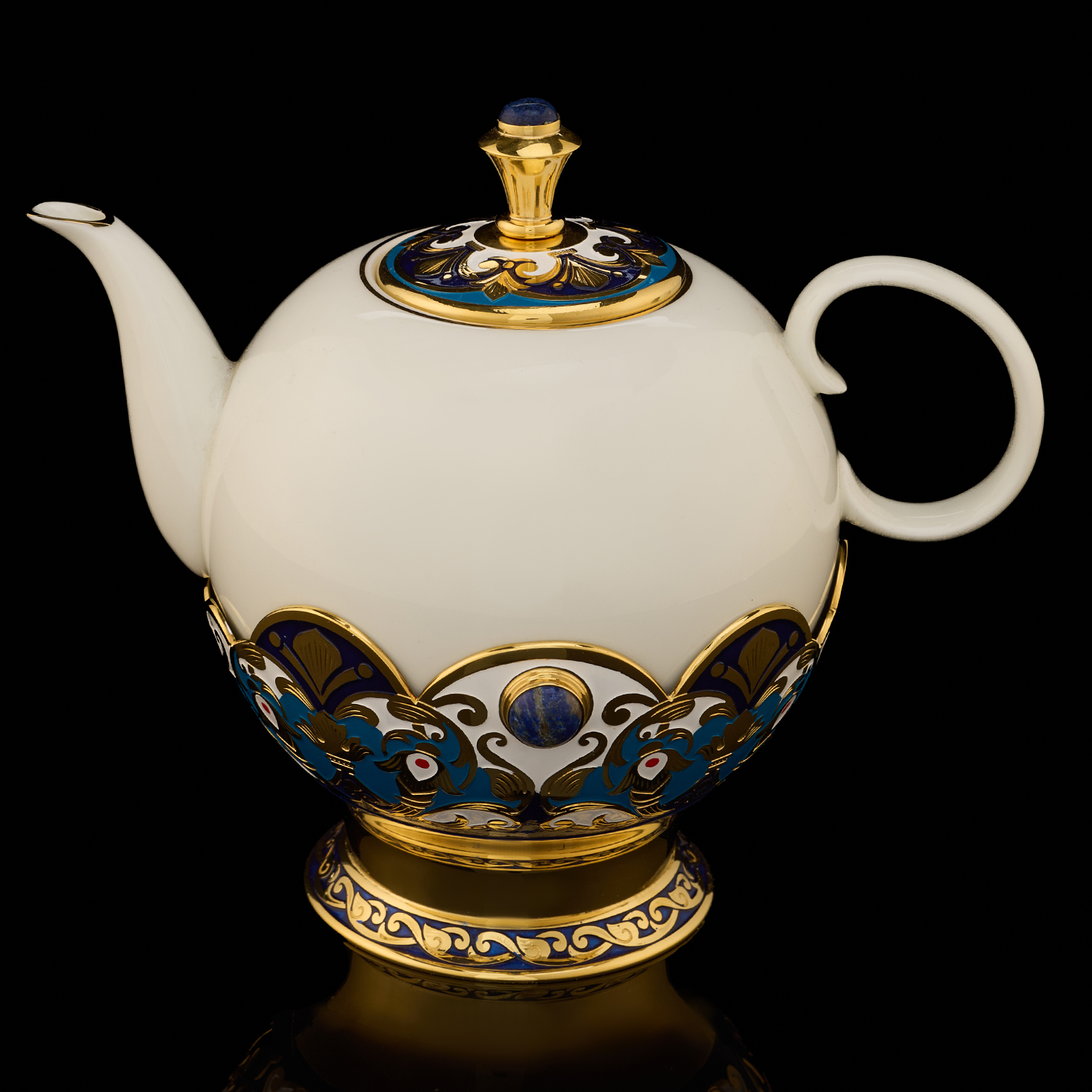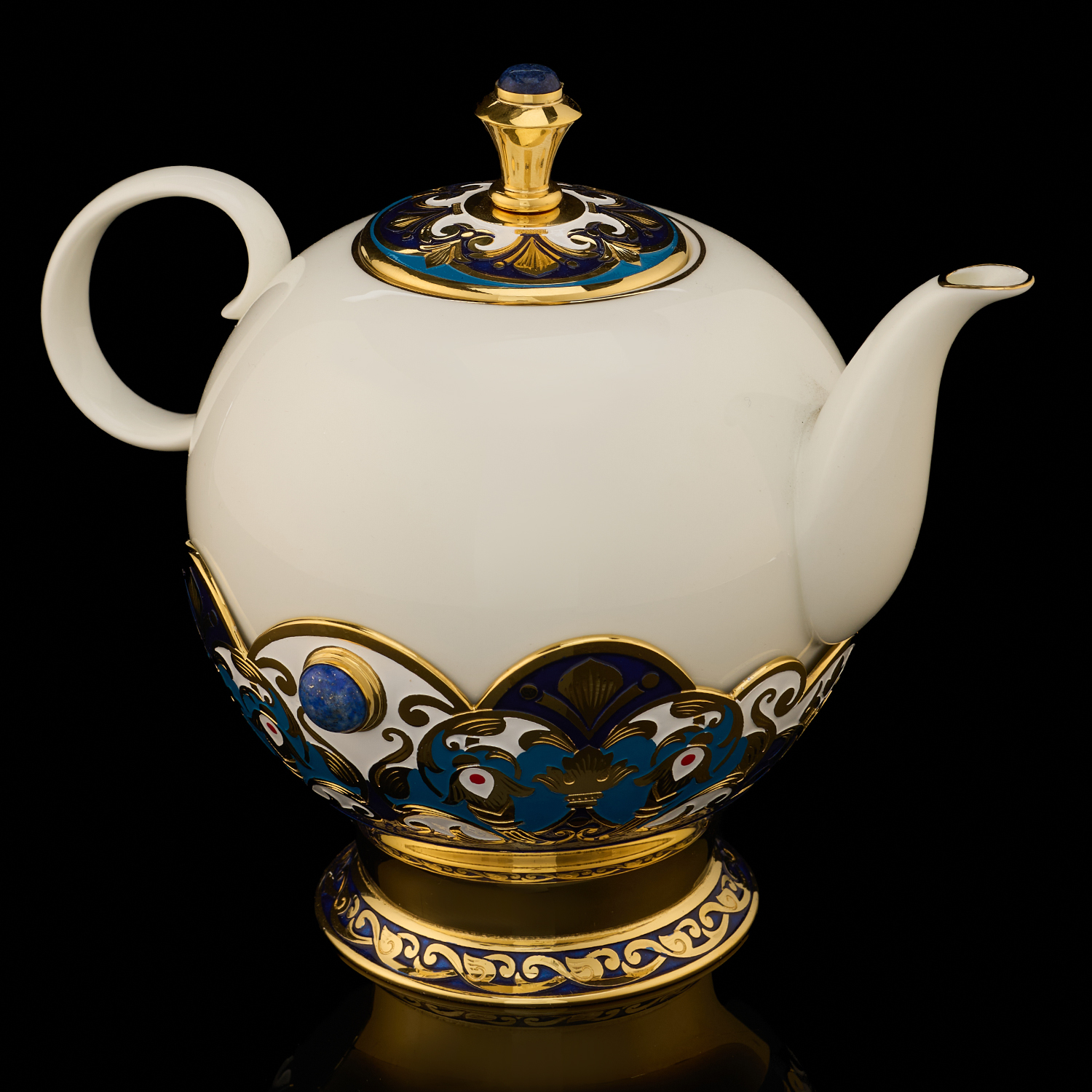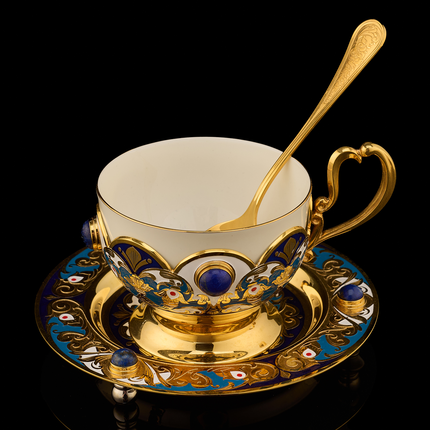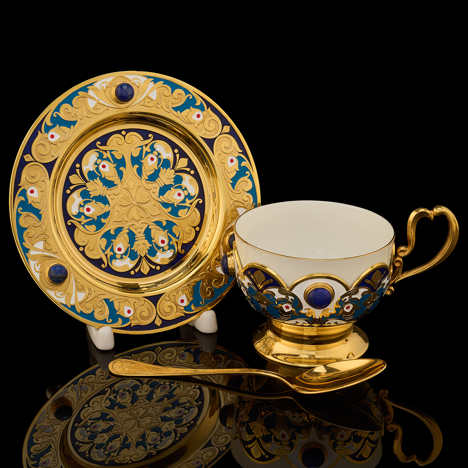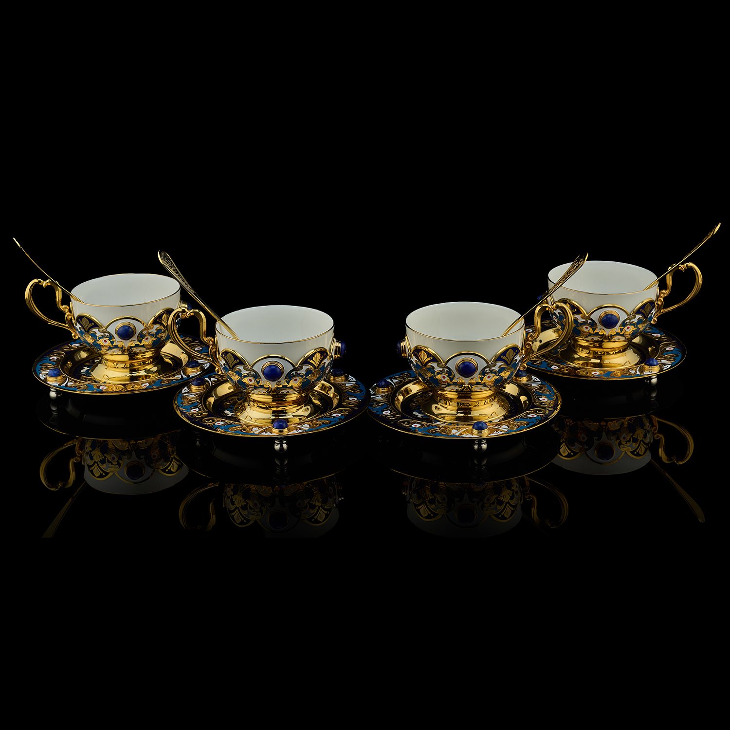 Самовар 3 л с сервизом на 4 персоны "Чаепитие". Златоуст.Материалы: латунь, никель, золото 999,9*, эмаль, лазурит, костяной фарфор.