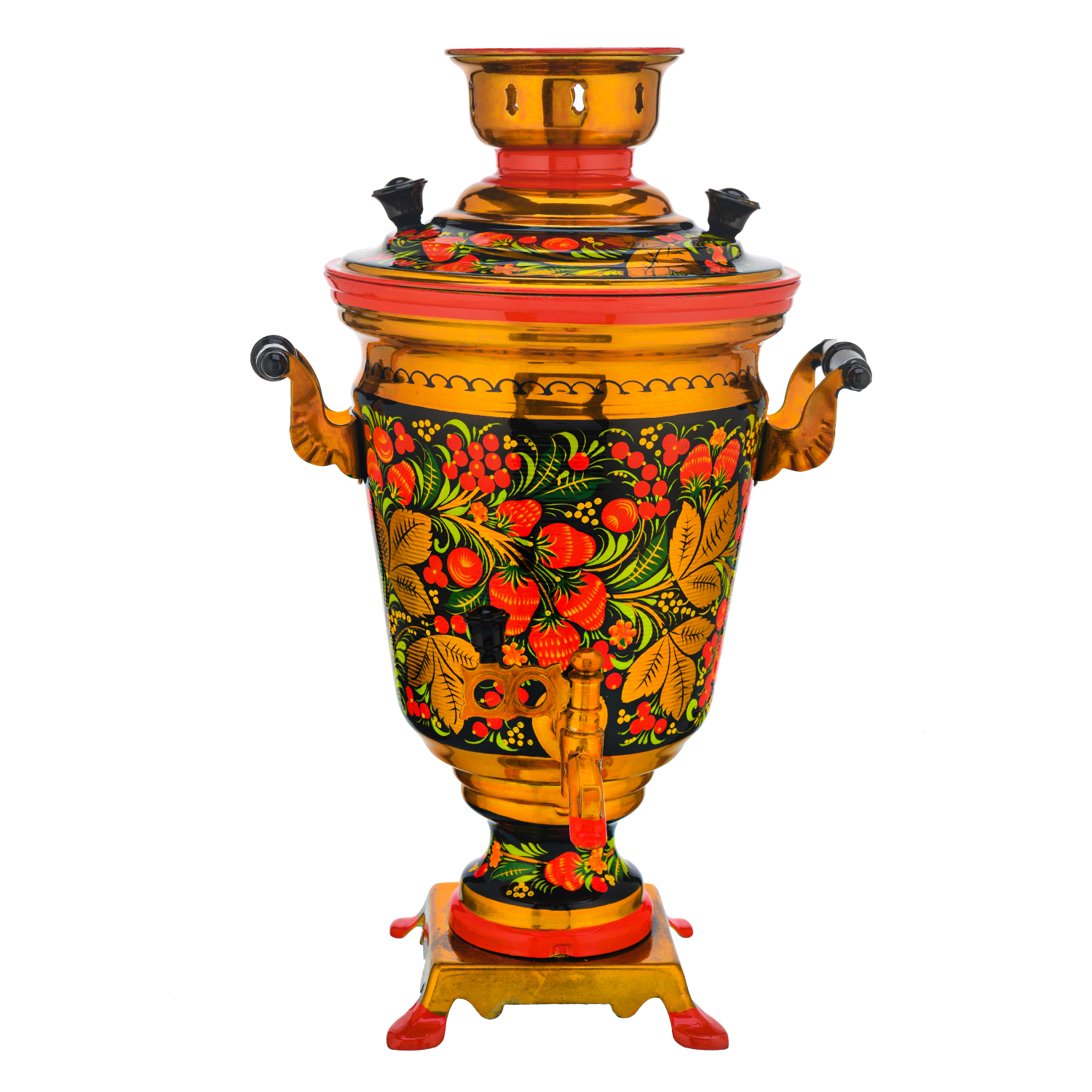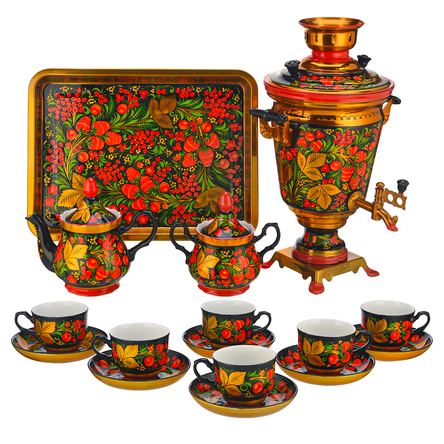 Самовар электрический 4 л с сервизом "Клубника". Хохлома.Материалы: латунь, фарфор, краски, лак.