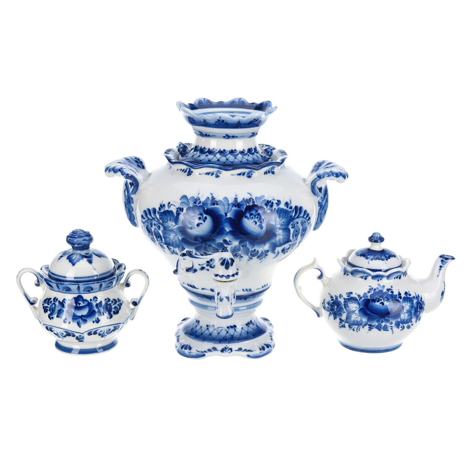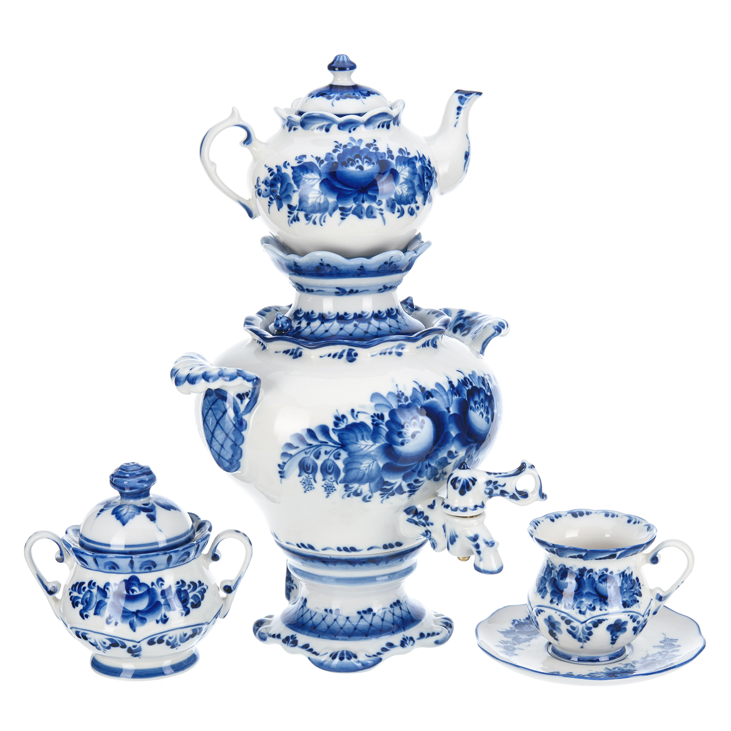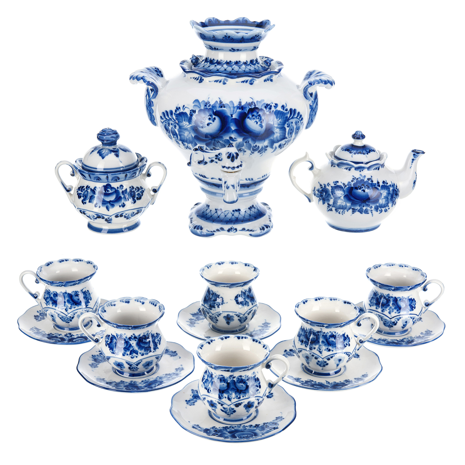 Самовар фарфоровый электрический 2л "Семейное чаепитие" с сервизом 6 персон. Гжель