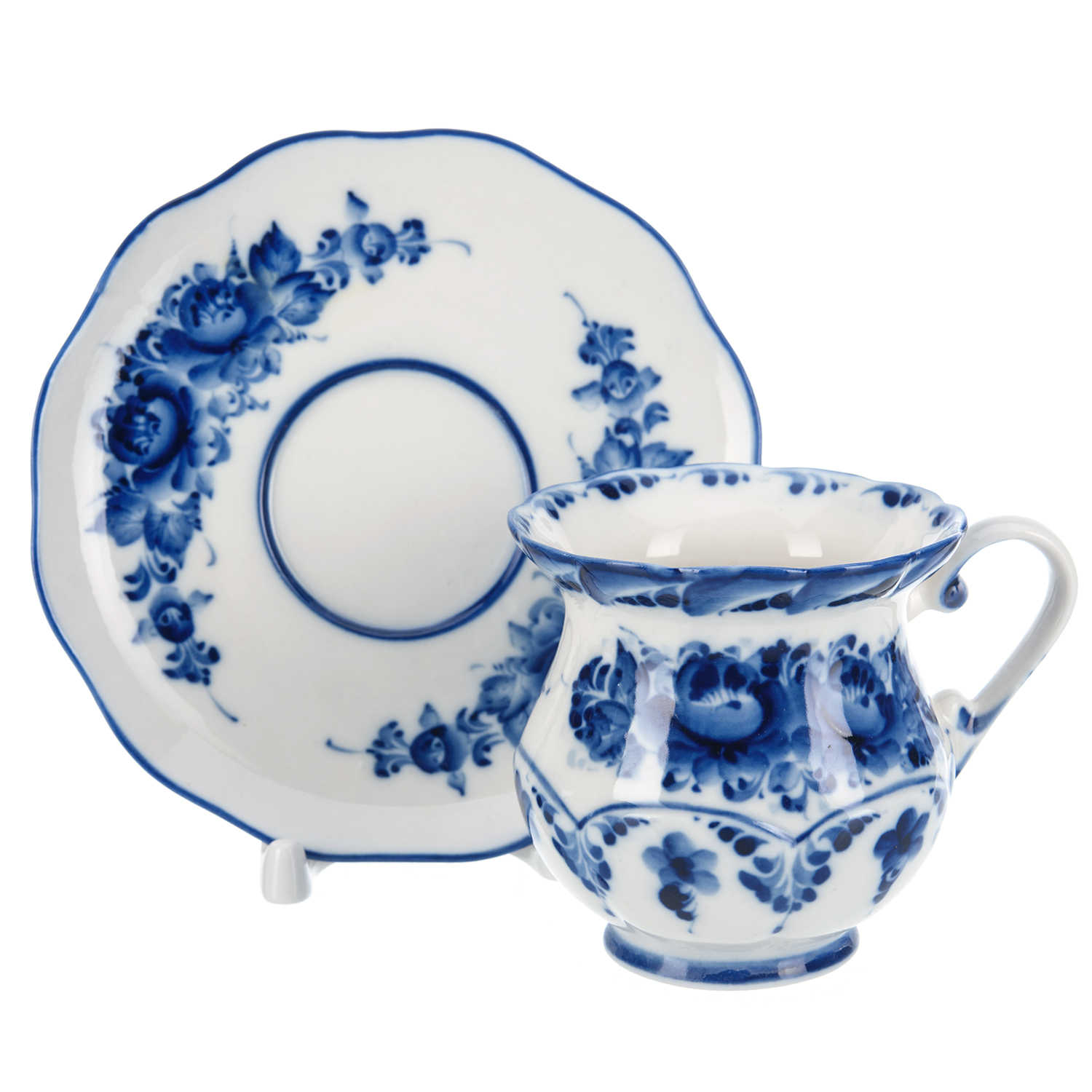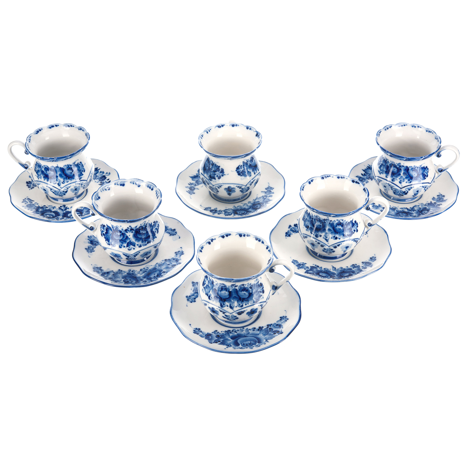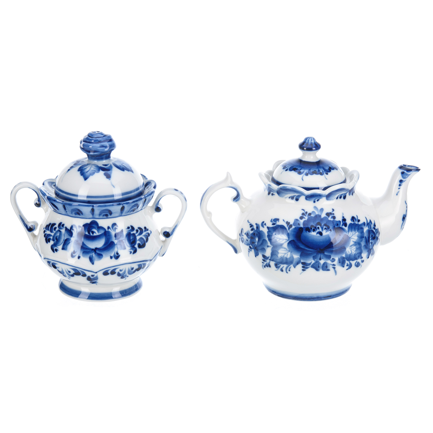 Самовар фарфоровый электрический 2л "Семейное чаепитие" с сервизом 6 персон. Гжель