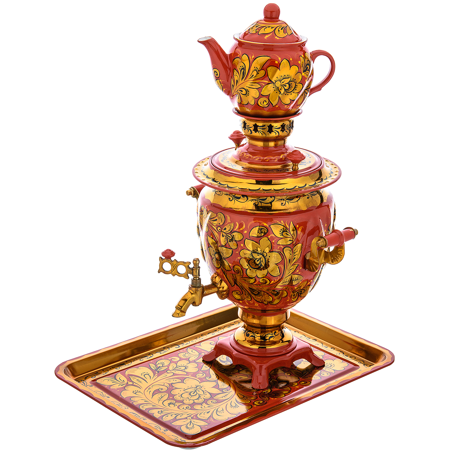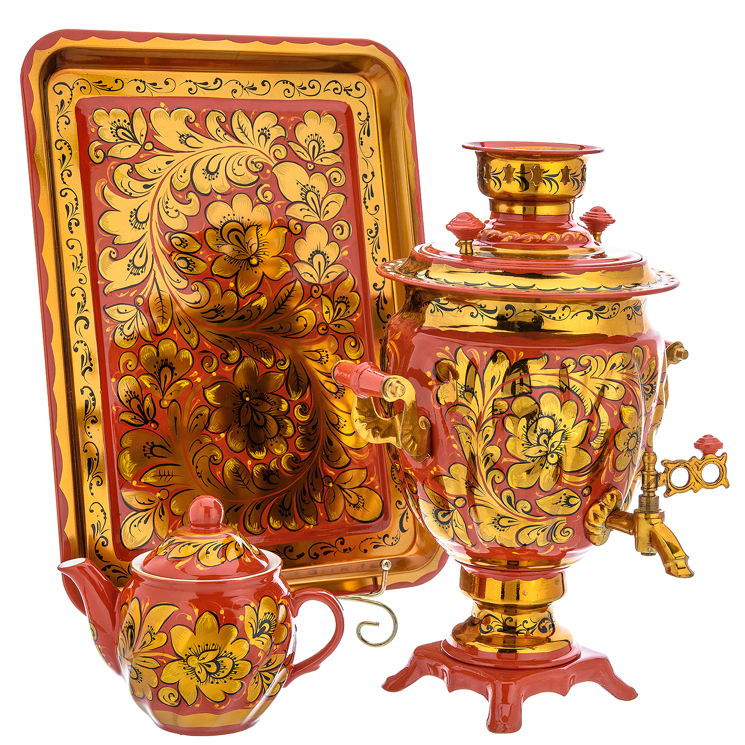 9400 Хохлома НР 3пр. Самовар 3 л роспись "Кудрина на красном" поднос и чайник ....