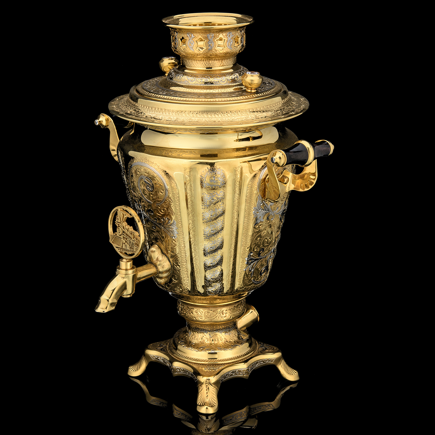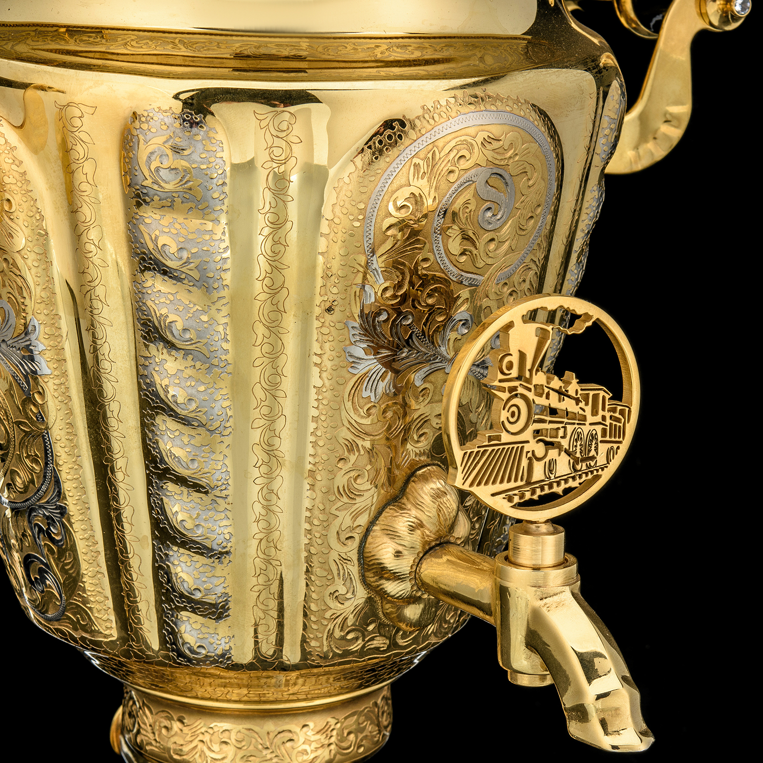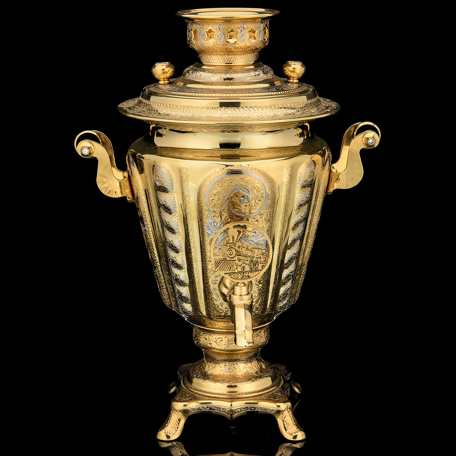 Самовар электрический "Железнодорожный" 3 л. Златоуст.Материалы: латунь, никель, золото 999,9*, фианиты.