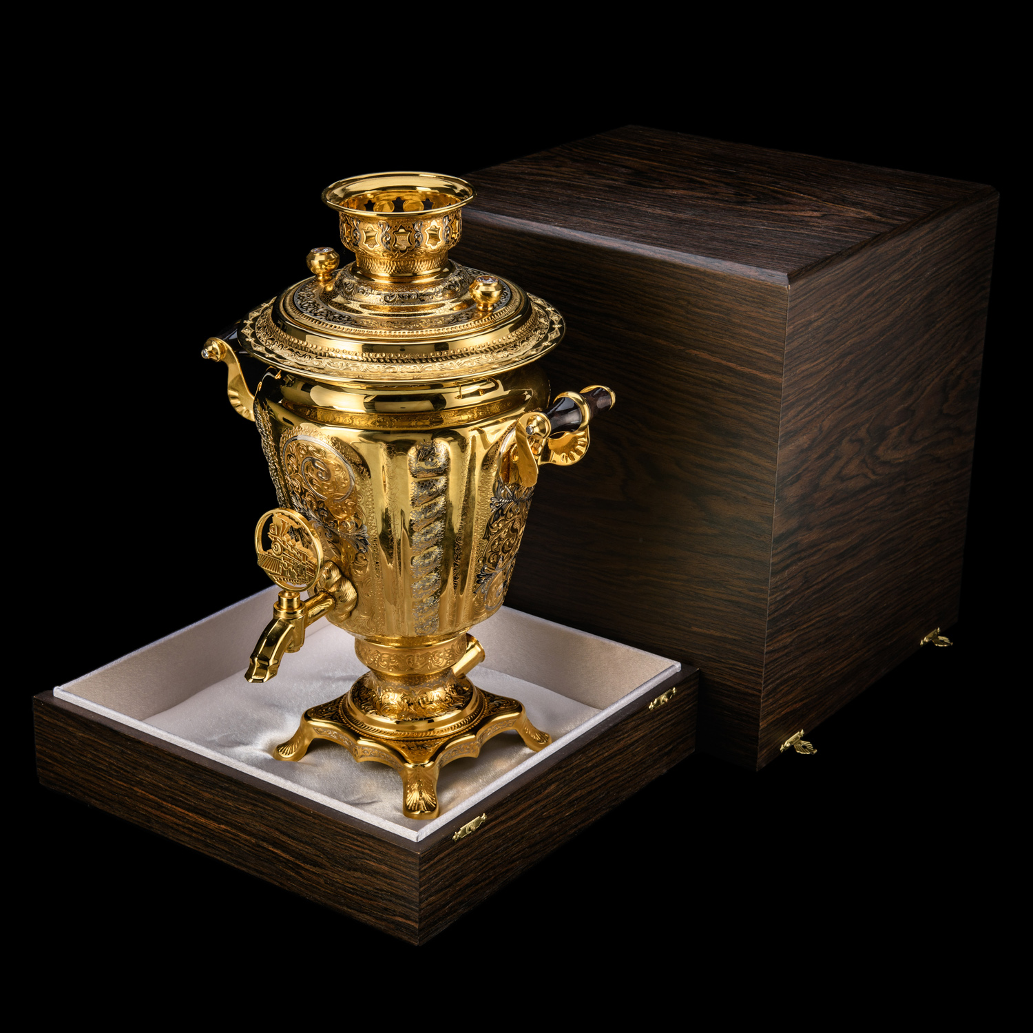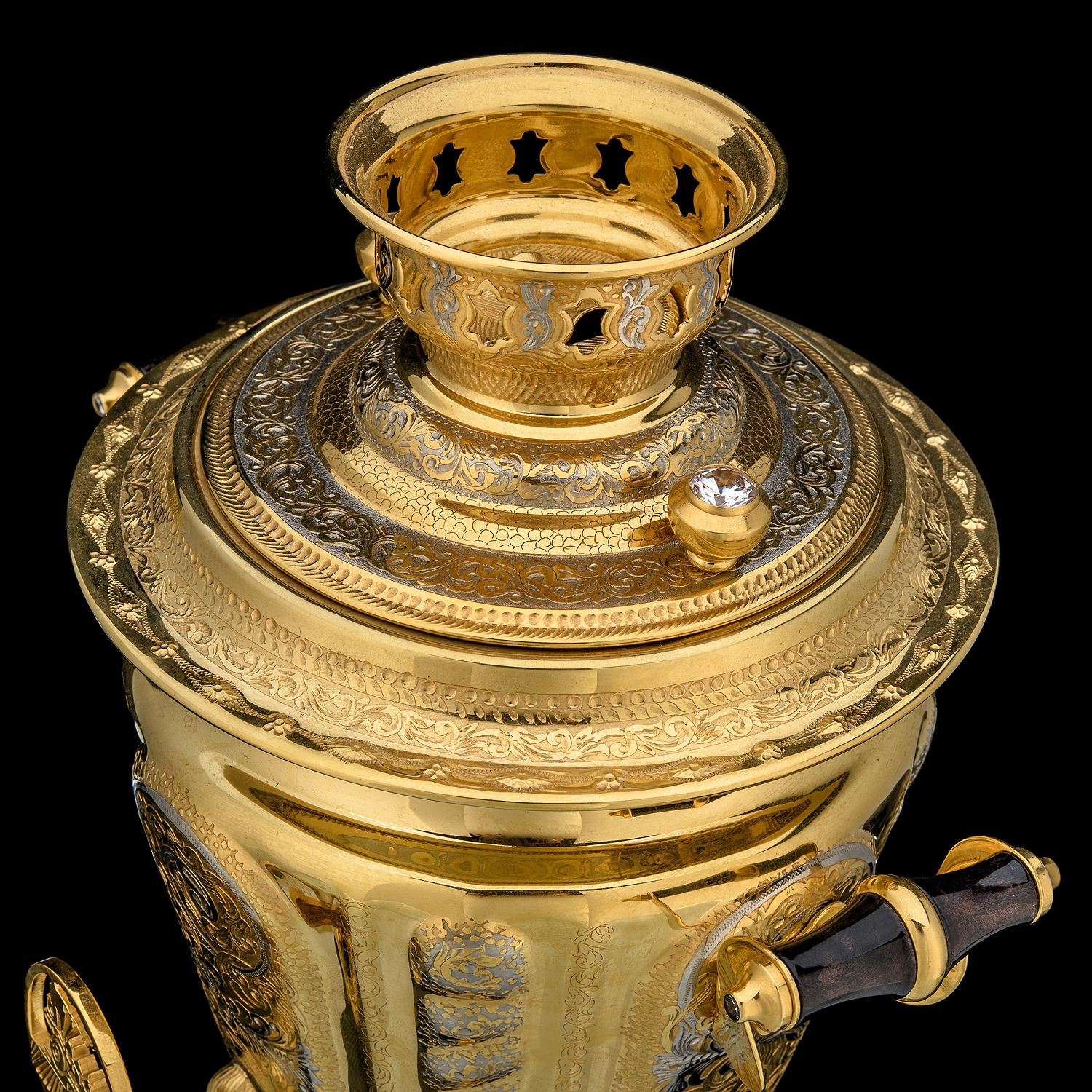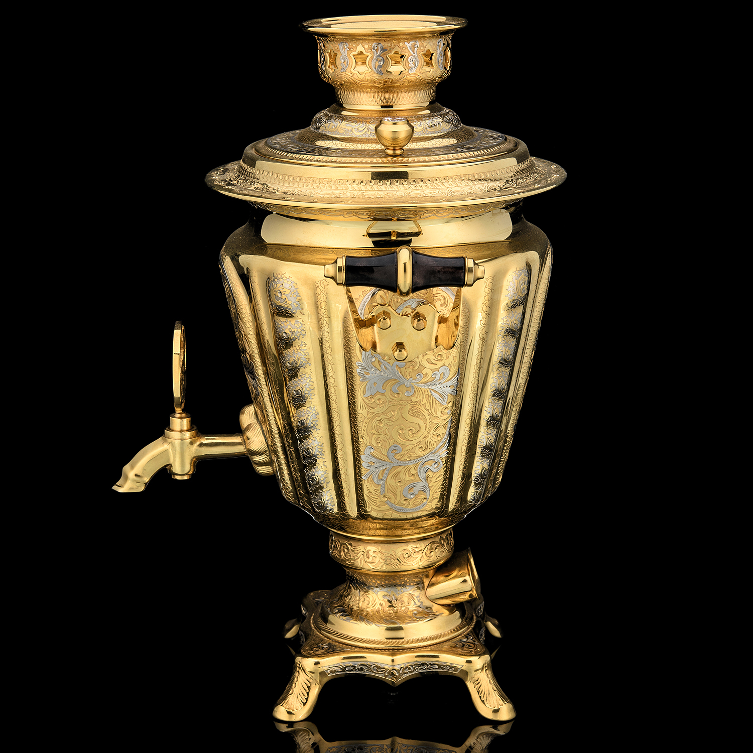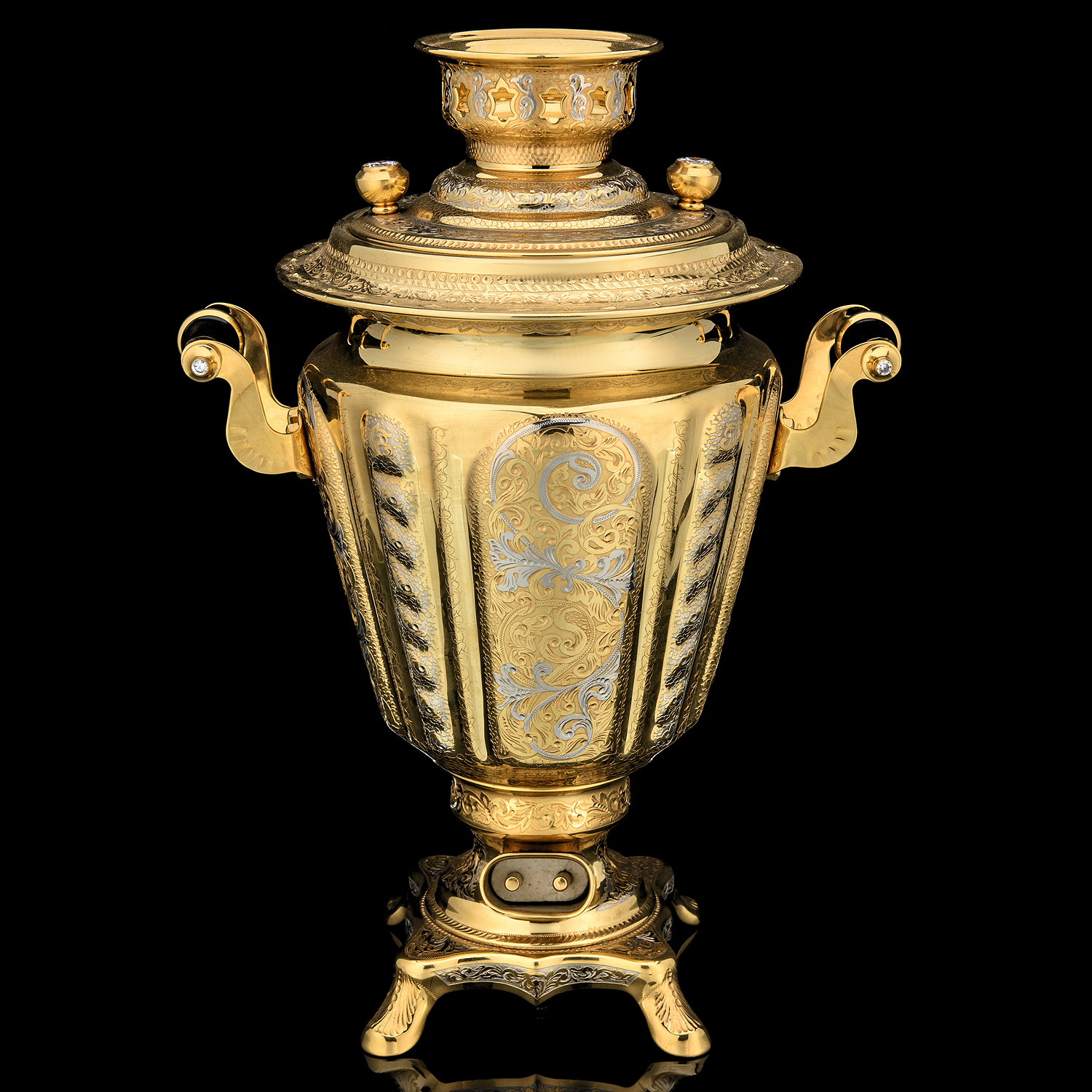 Самовар электрический "Железнодорожный" 3 л. Златоуст.Материалы: латунь, никель, золото 999,9*, фианиты.
