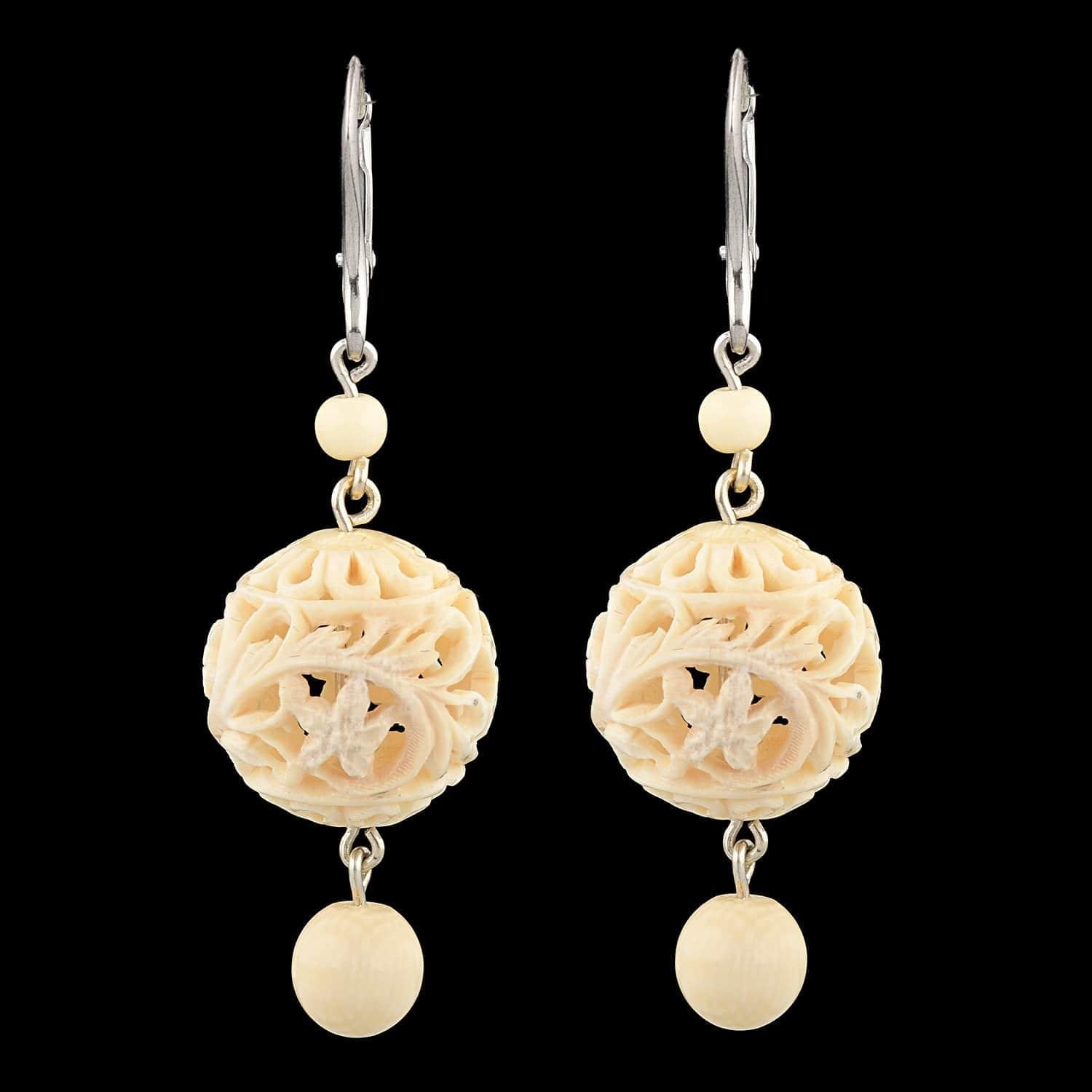 Пара серег с динамичными подвесками, зрительно удлиняющие овал лица, являются штучным дизайнерским украшением в русском стиле. Серьги сложены из элементов, представляющих собой образцы резьбы по кости.
