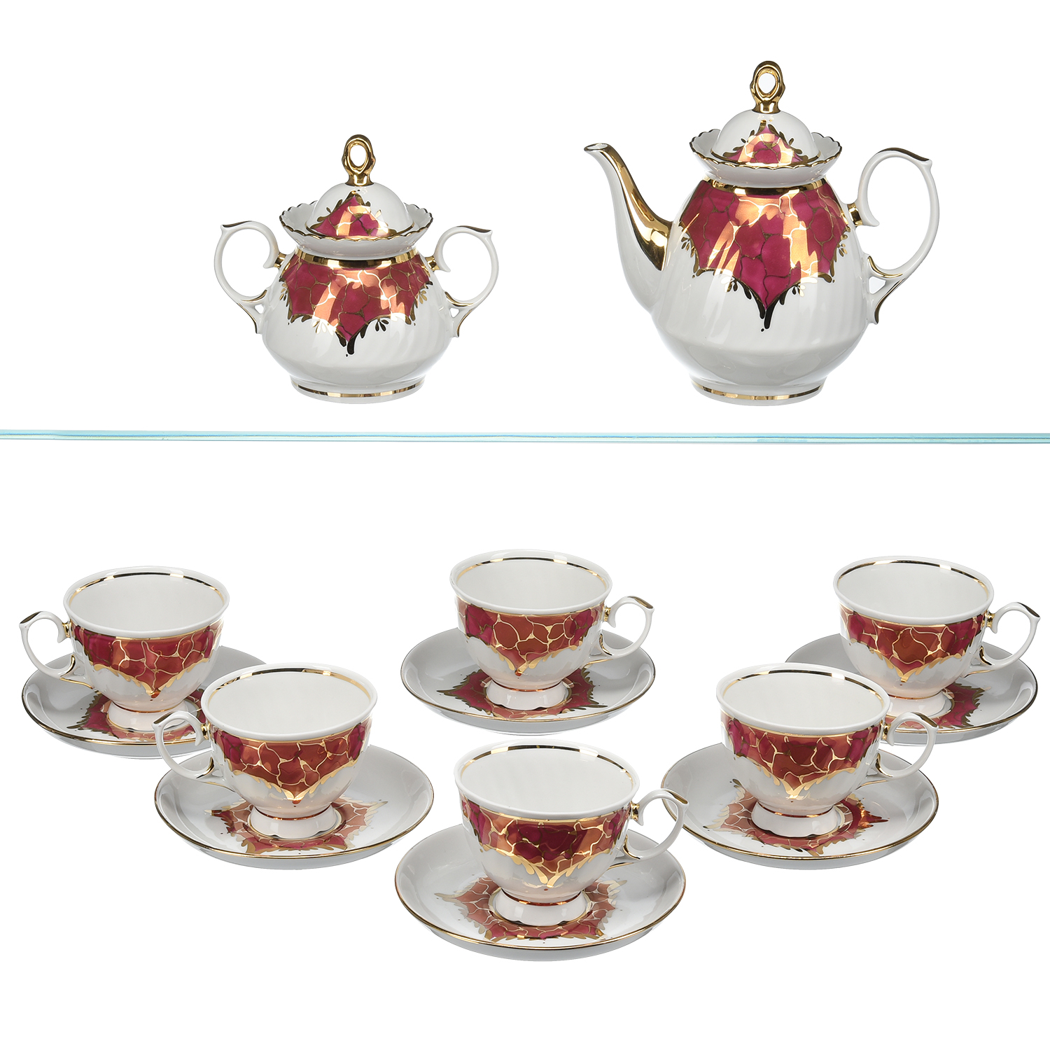 Комплектация: чайник 1 шт., сахарница 1 шт., чашка чайная 6 шт., блюдце чайное 6 шт.