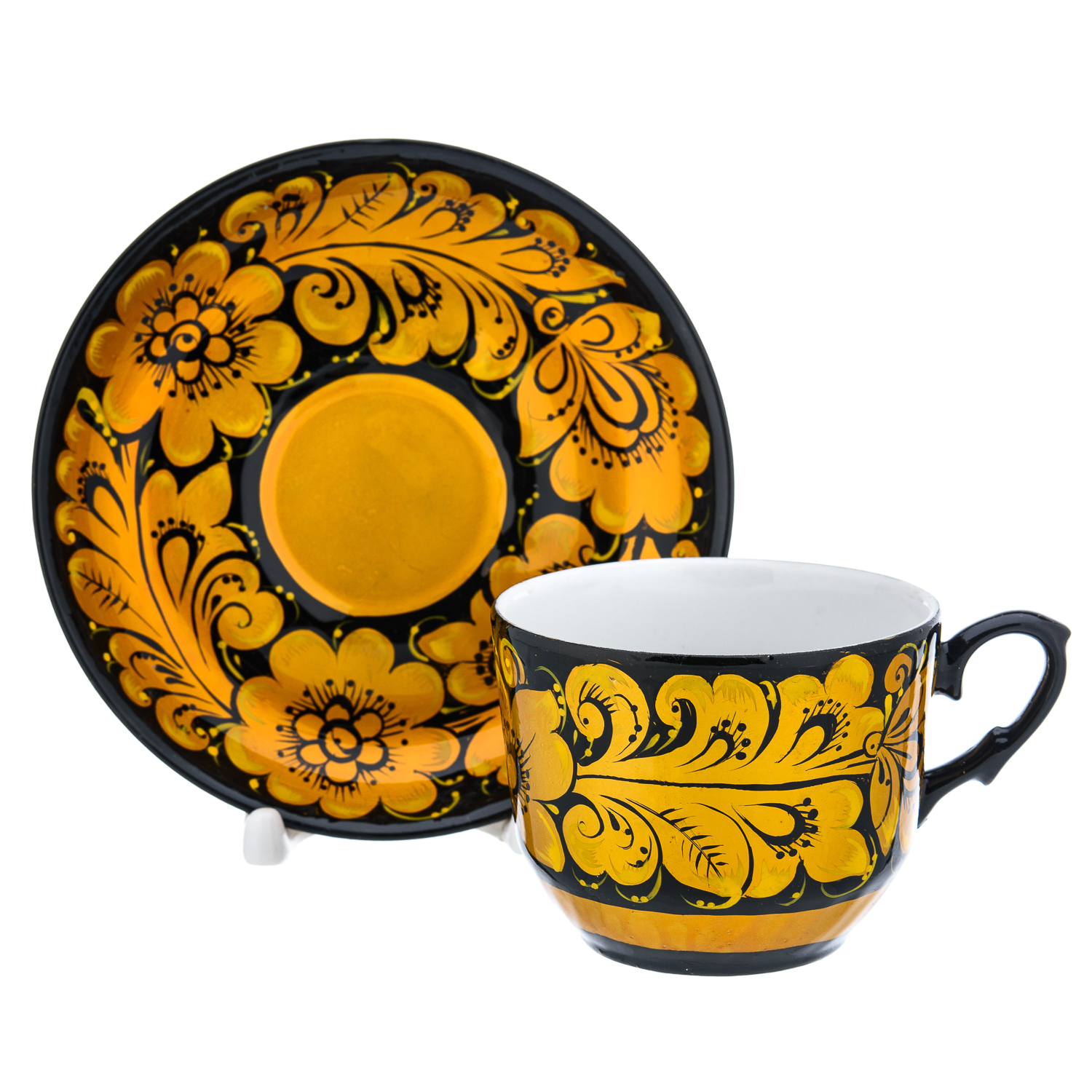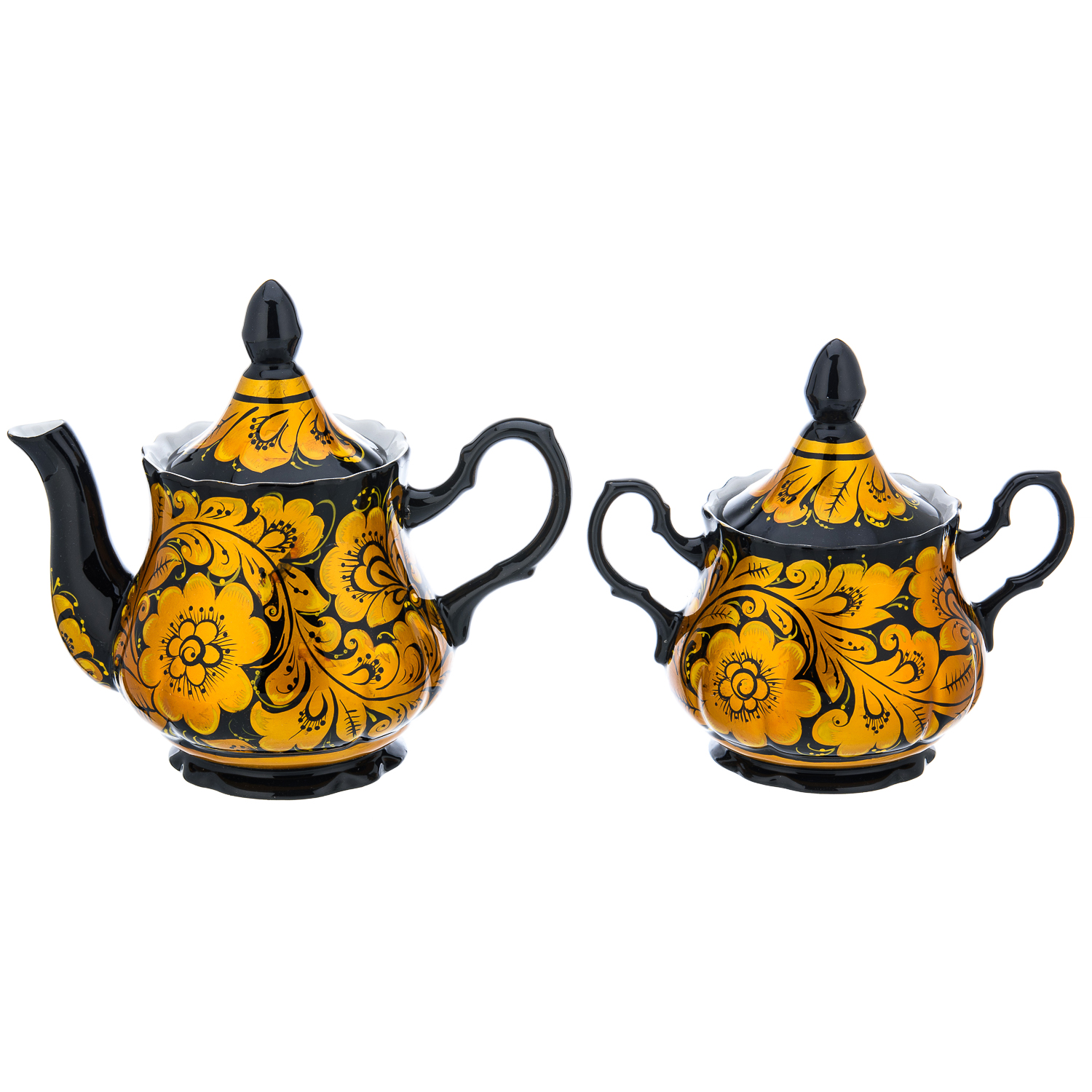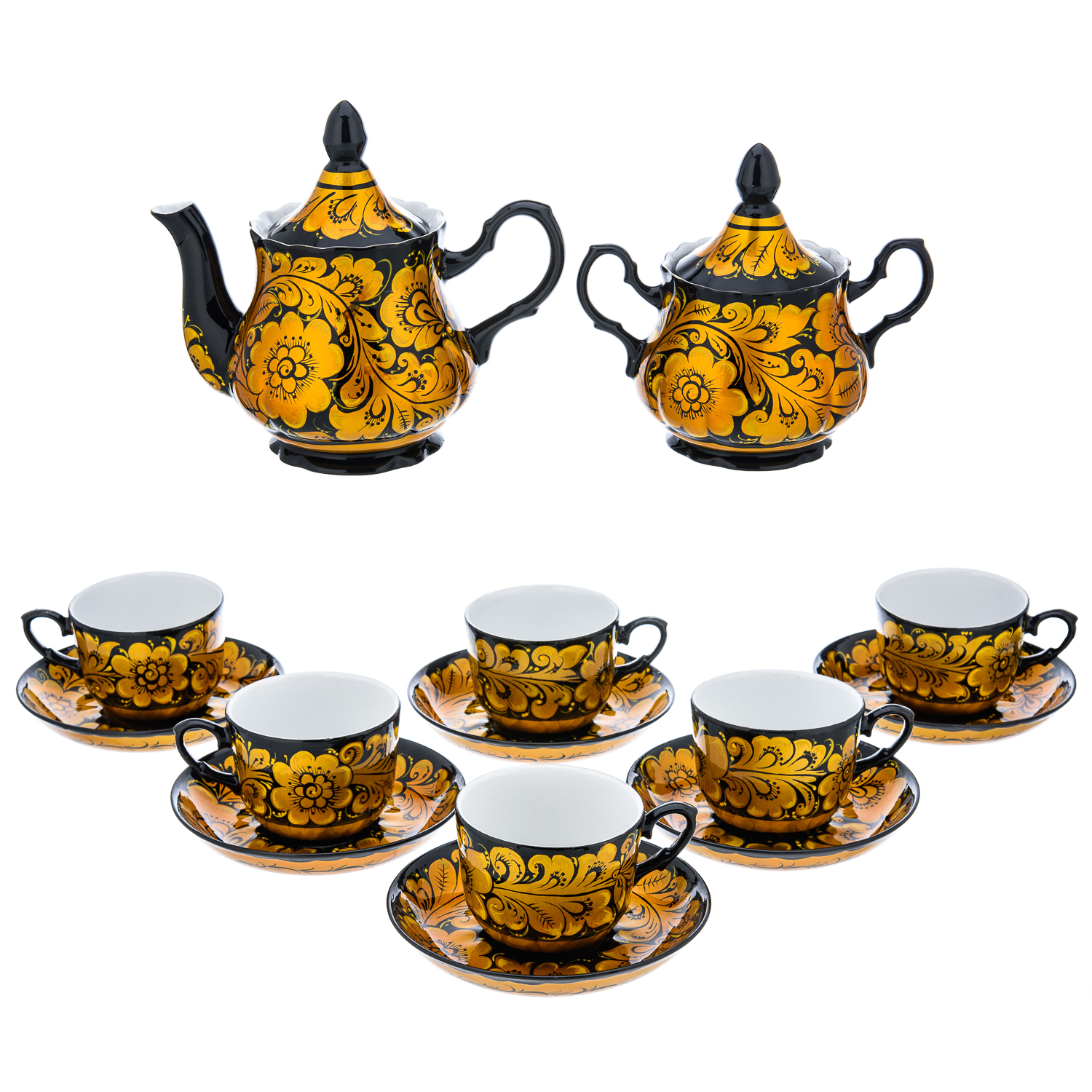 Чайный сервиз на 6 персон "Кудрина на черном". Хохлома