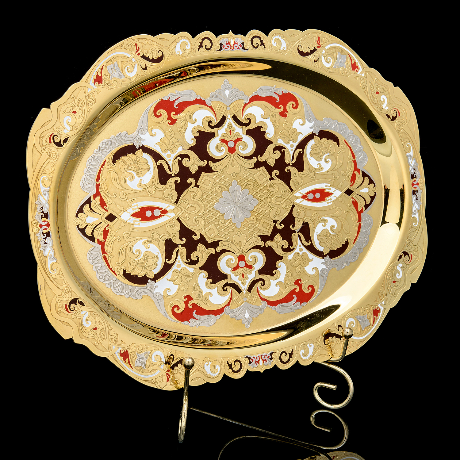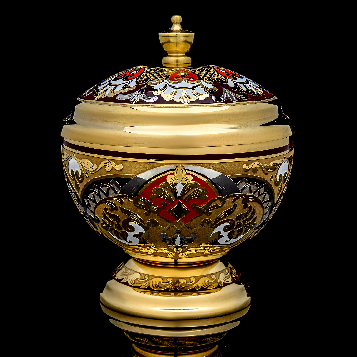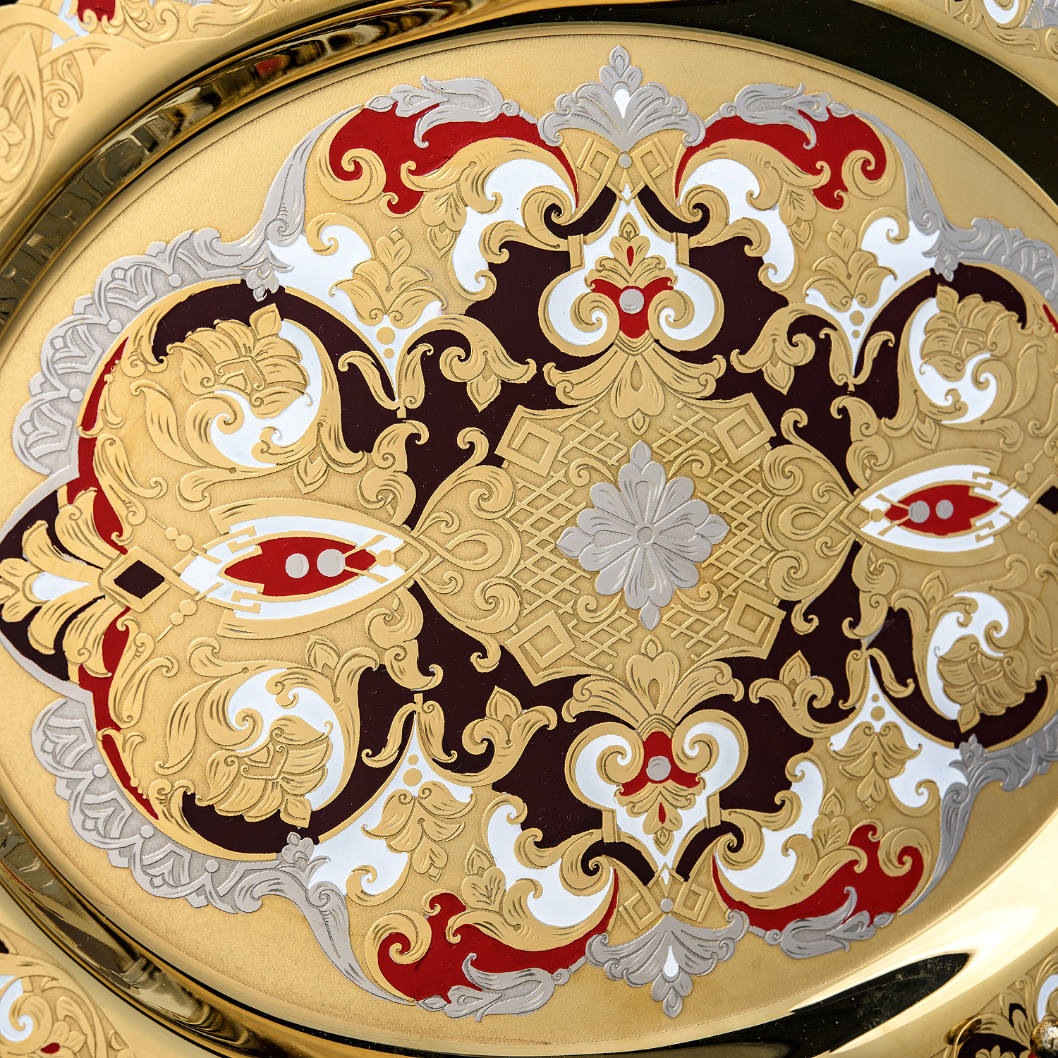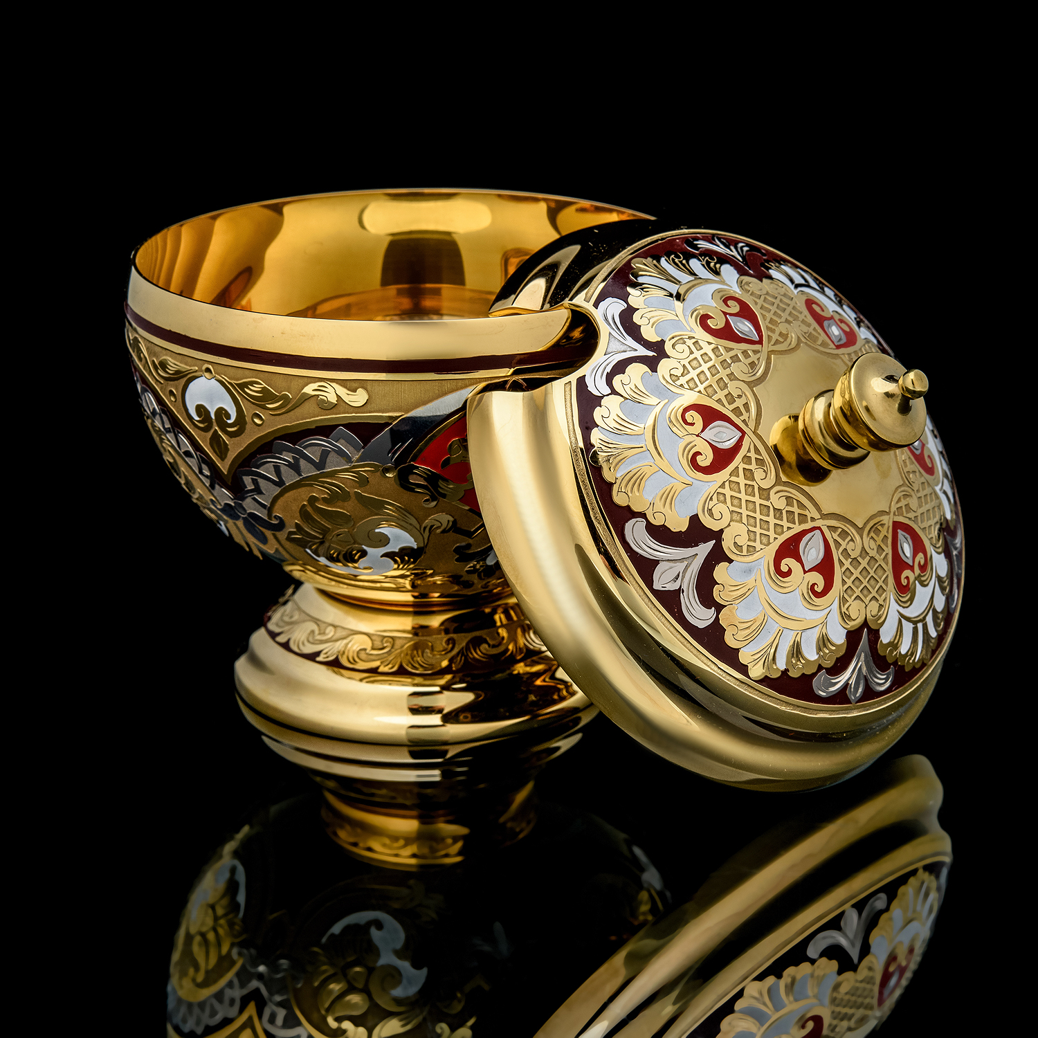 Кофейный набор на 4 персоны с сахарницей. Златоуст.Материалы: латунь, никель, золото 999,9*, эмаль, костяной фарфор.