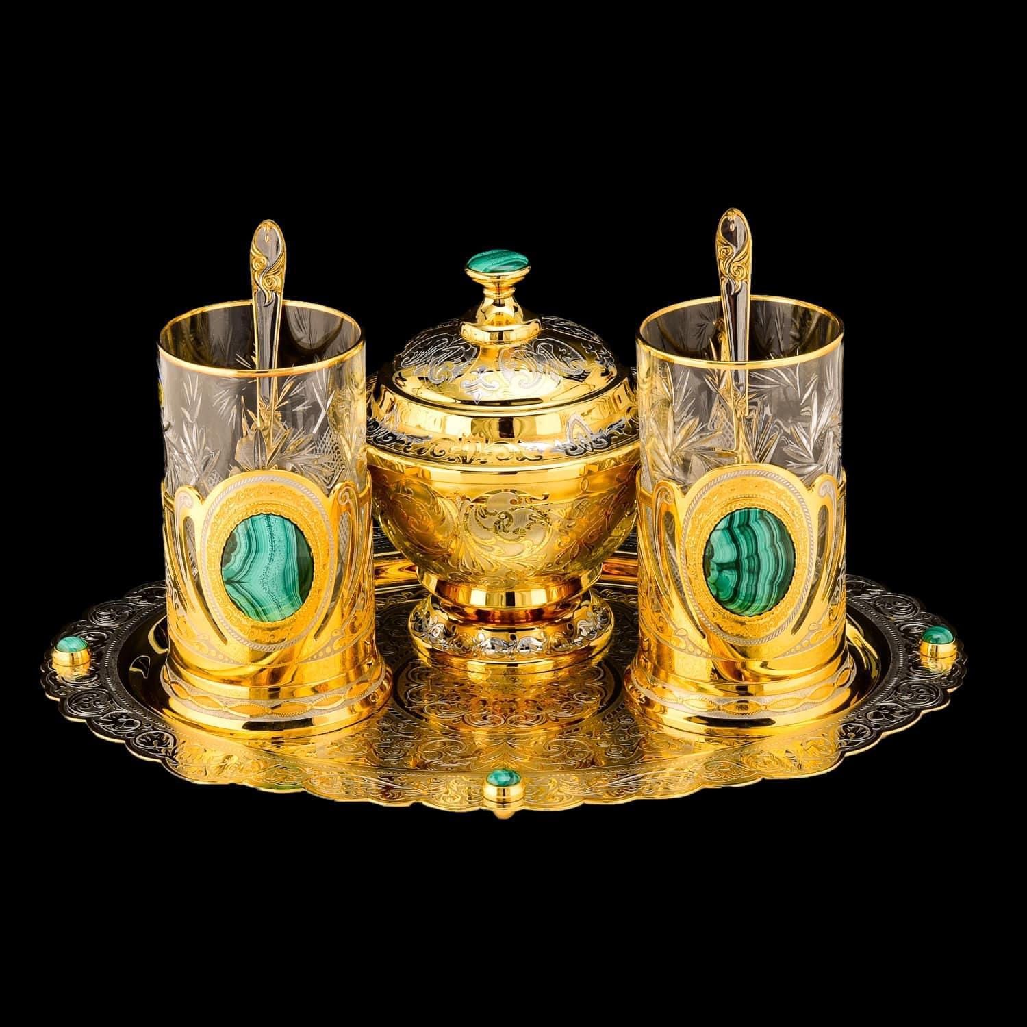 Вашему вниманию - сервировочная композиция с посудой ручной работы в имперском стиле, которая превращает чаепитие в особенный ритуал. В эксклюзивном чайном наборе представлено четыре подстаканника со вставными стаканами и ложками и поднос. Царский выбор!