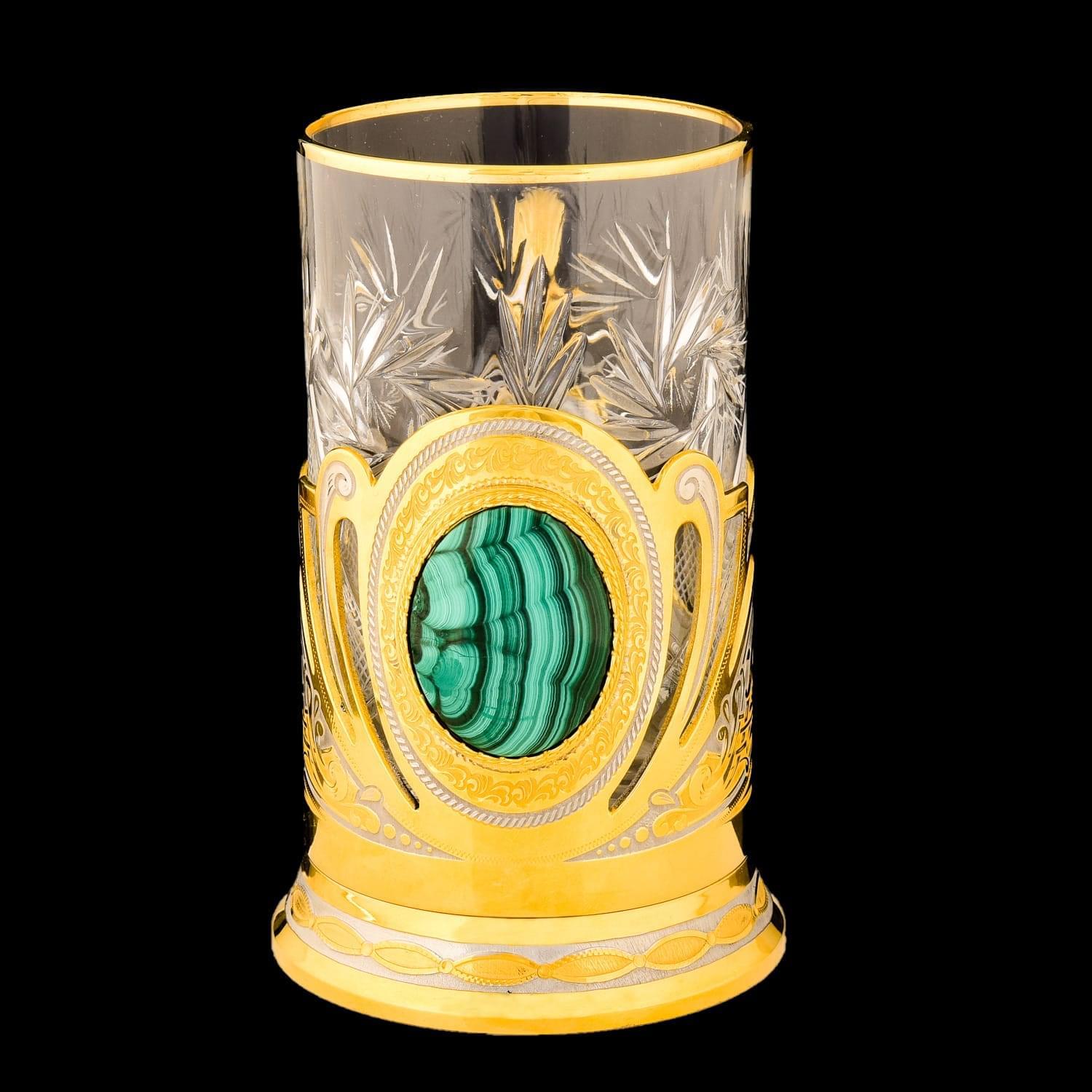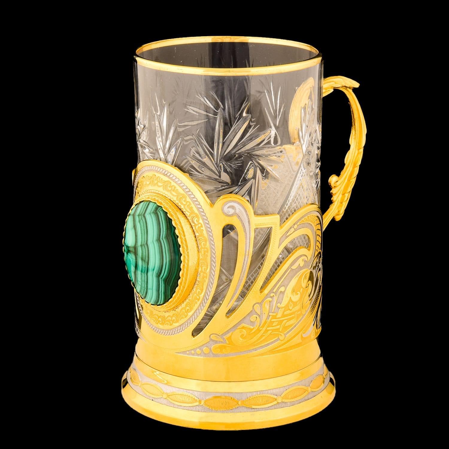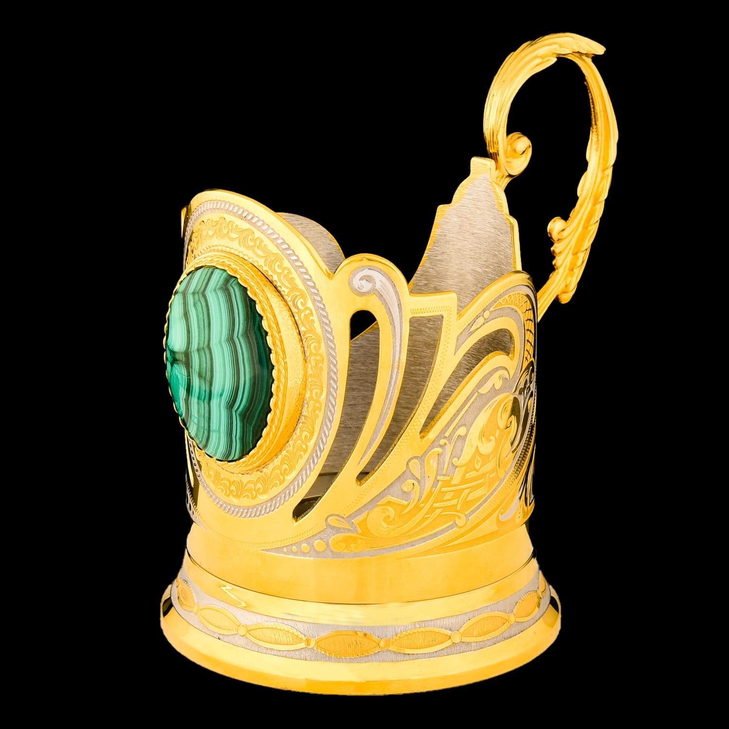 Подстаканник - это дизайнерский питейный сосуд в русском стиле, предназначенный для горячих или холодных напитков. Дизайн подстаканника с литым корпусом, оформленным в техниках резьбы и гравировки, с крупным кабошоном из камня малахита делает его элементом декора.