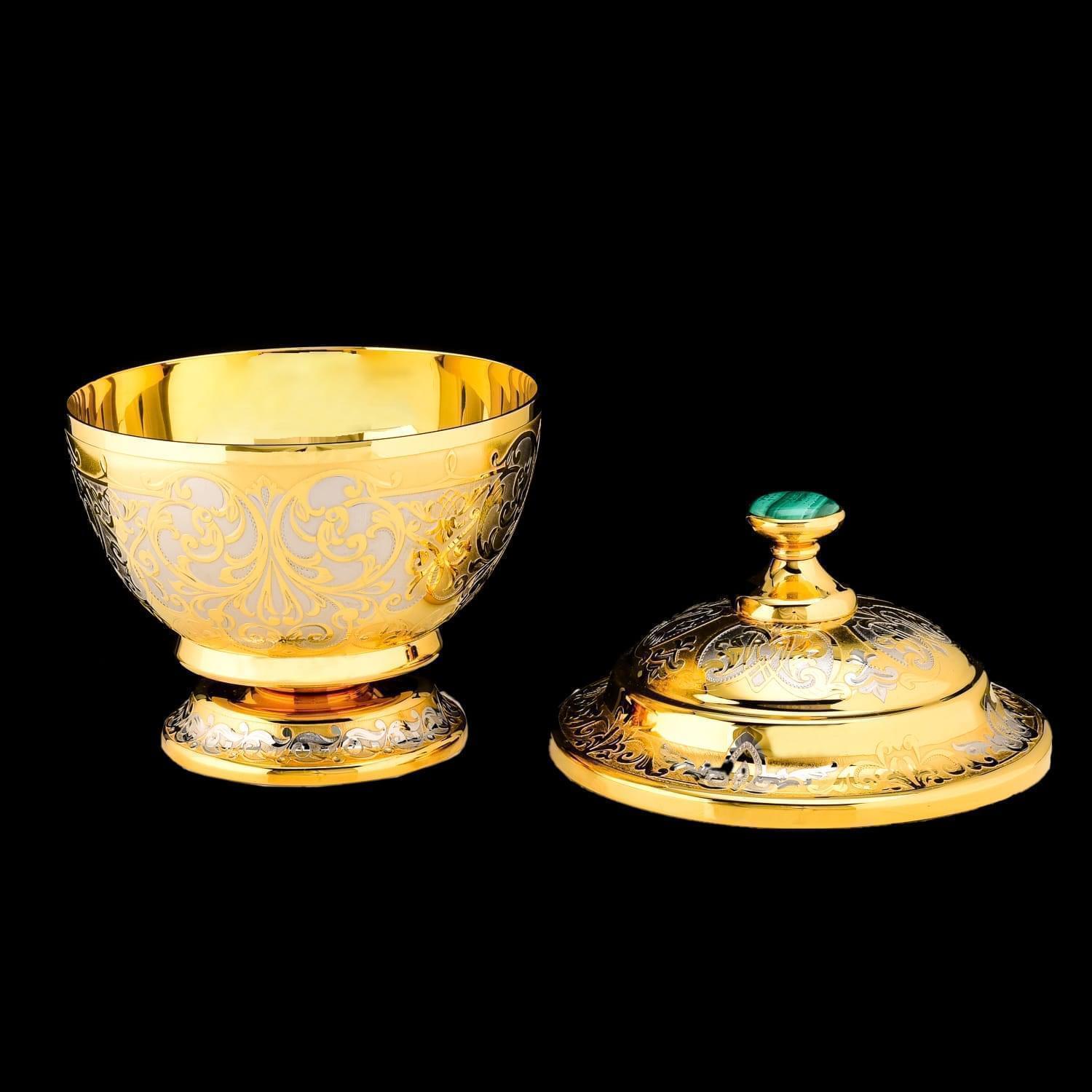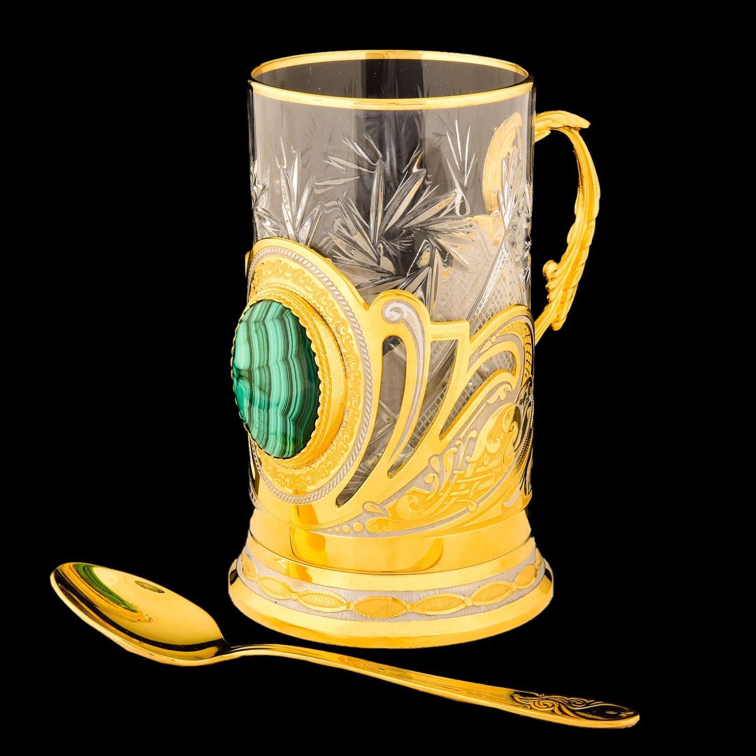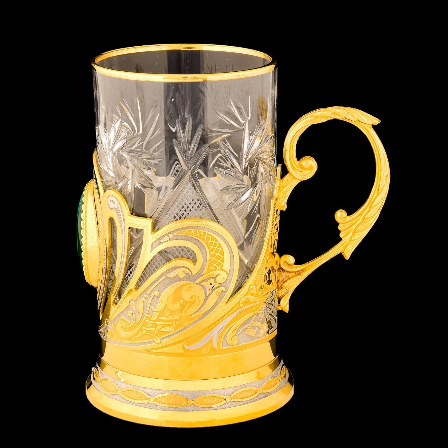 Подстаканник - это дизайнерский питейный сосуд в русском стиле, предназначенный для горячих или холодных напитков. Дизайн подстаканника с литым корпусом, оформленным в техниках резьбы и гравировки, с крупным кабошоном из камня малахита делает его элементом декора.