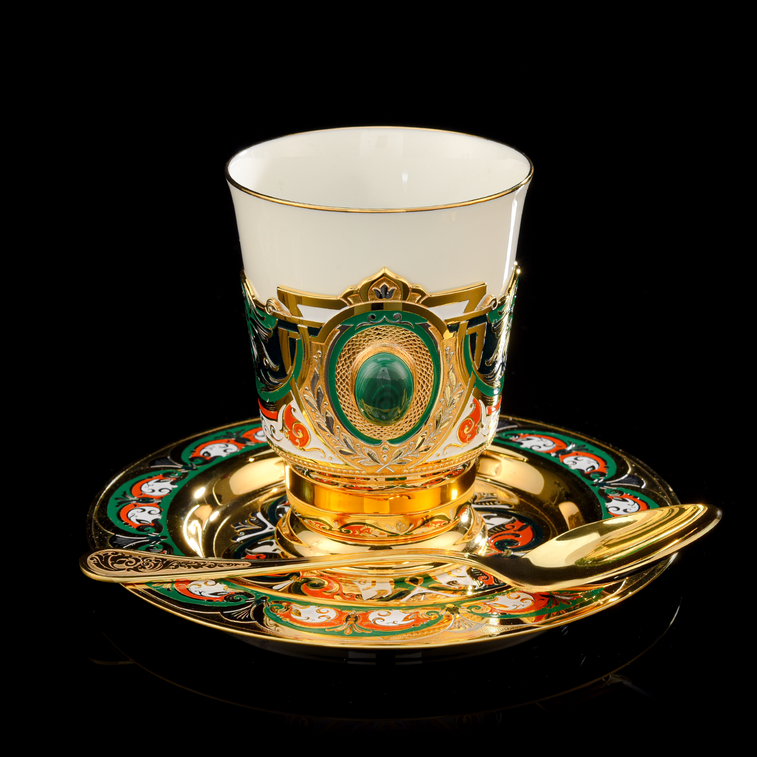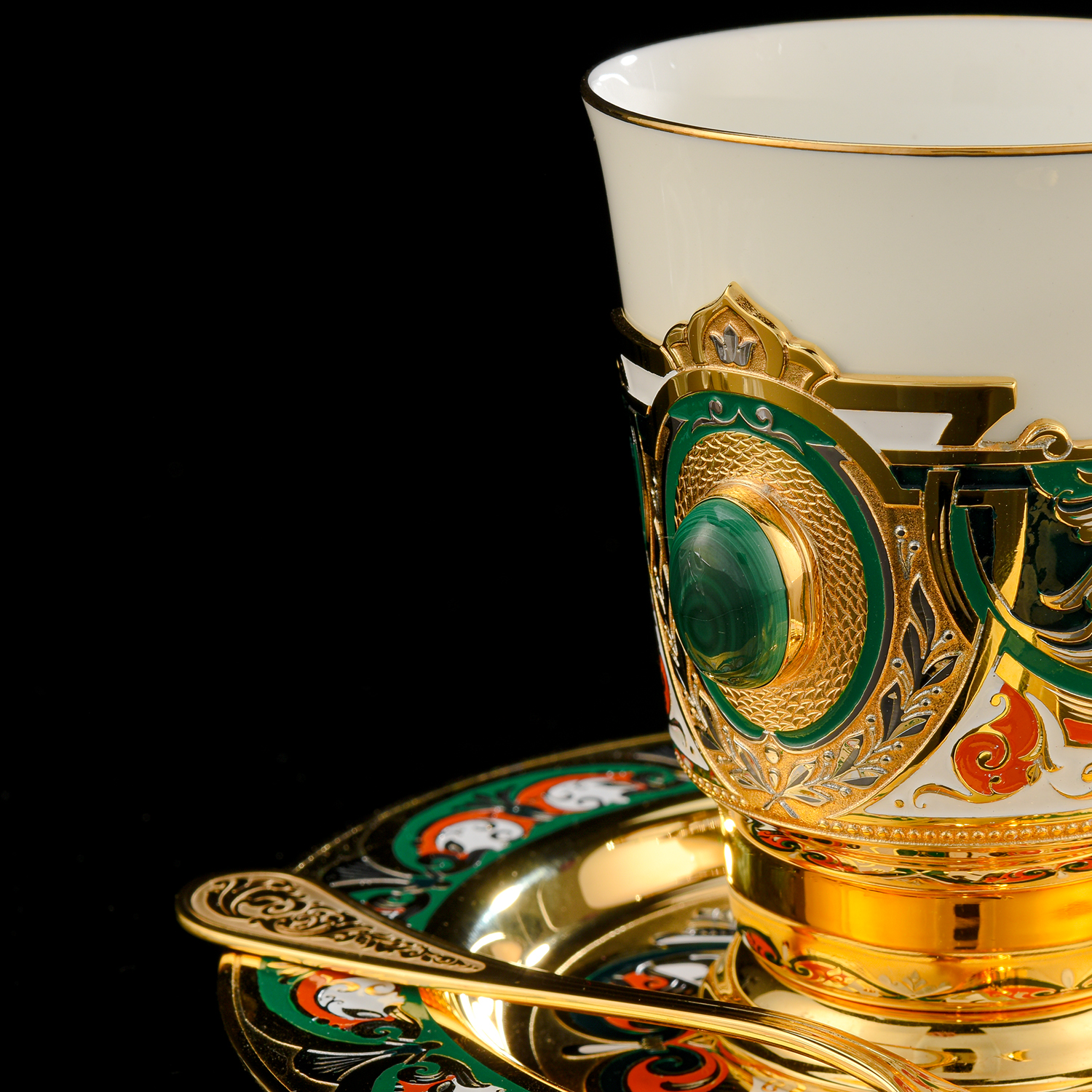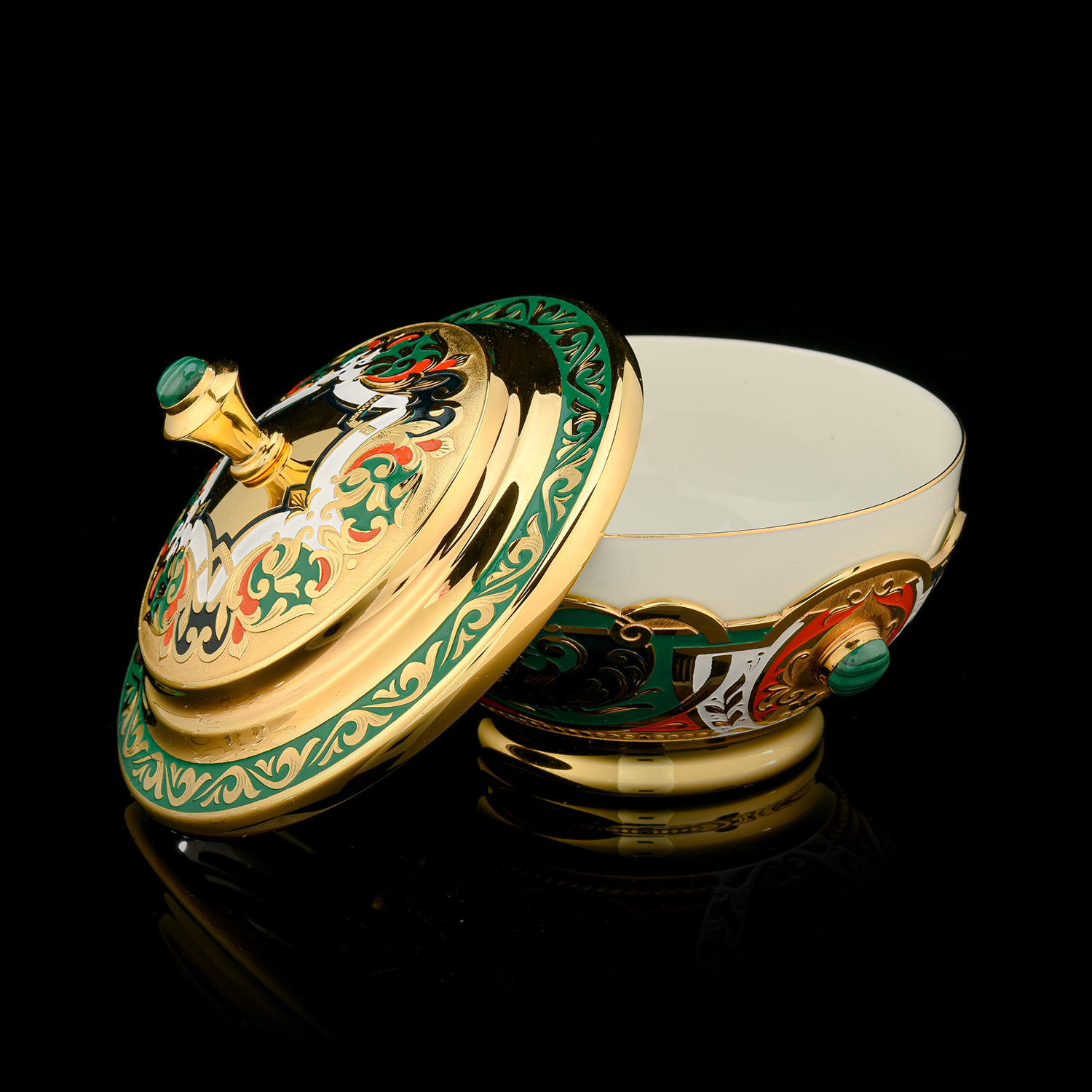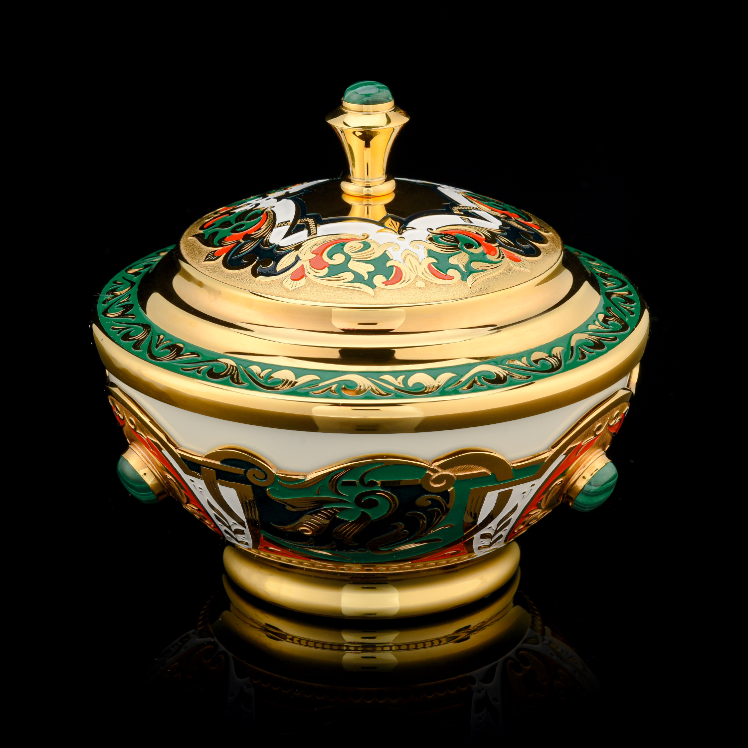 Материалы: латунь, никель, золото 999,9*, эмаль, малахит, костяной фарфор.