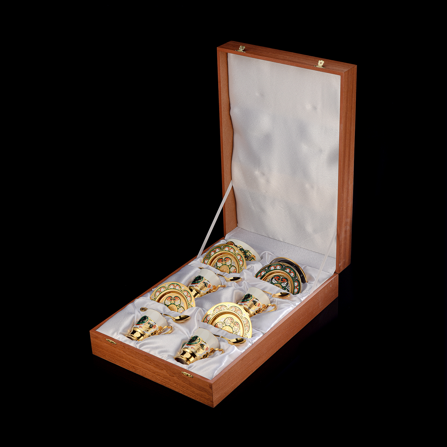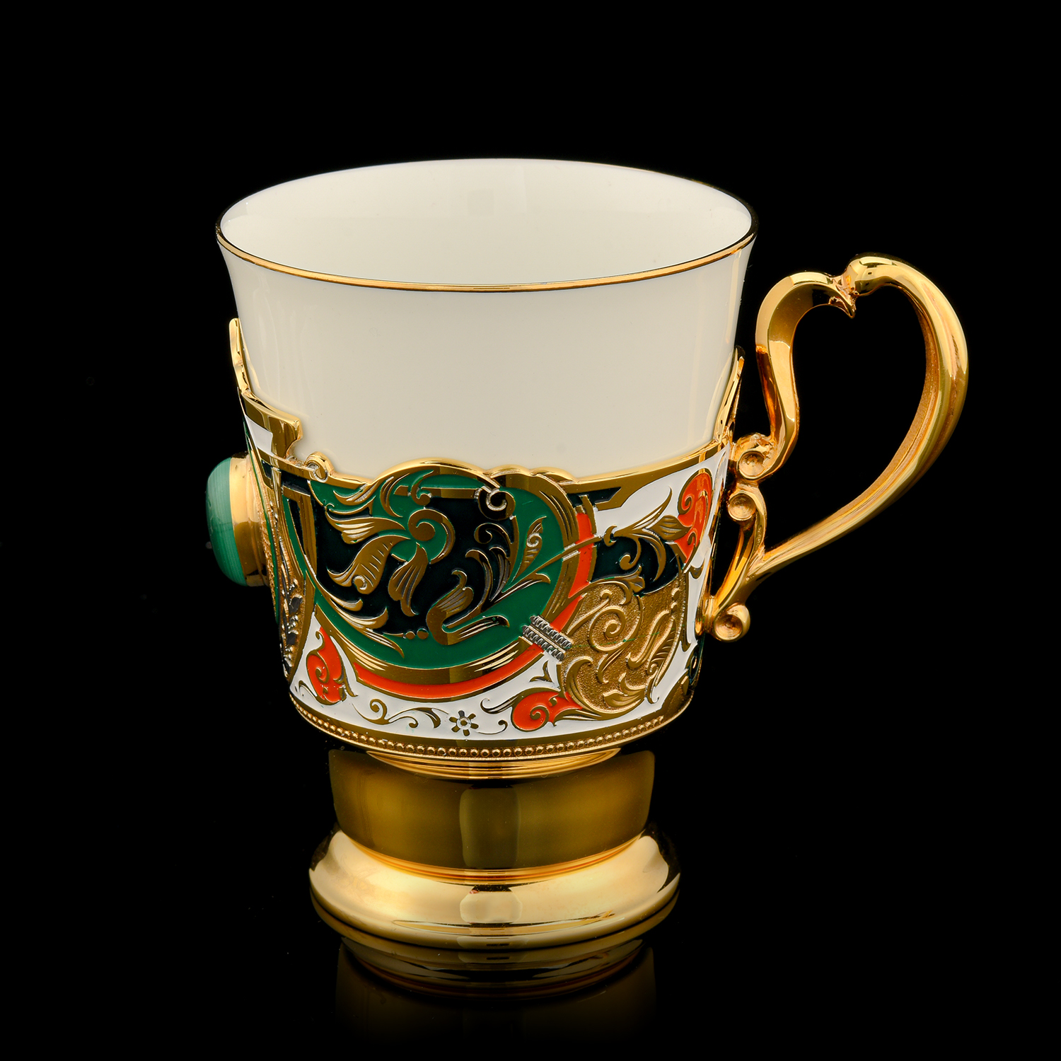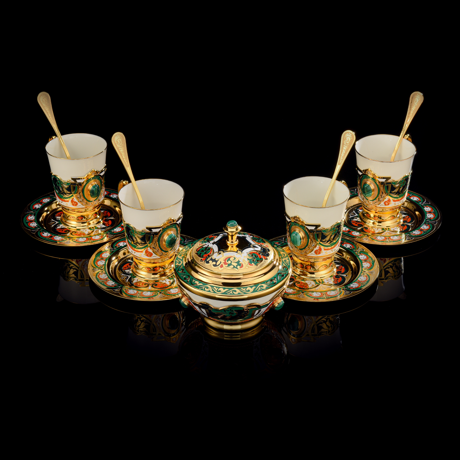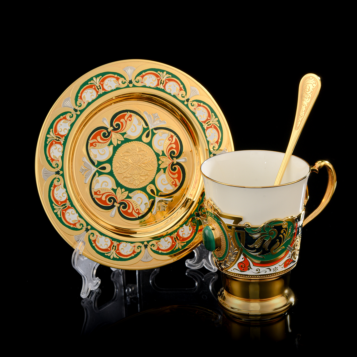 Материалы: латунь, никель, золото 999,9*, эмаль, малахит, костяной фарфор.
