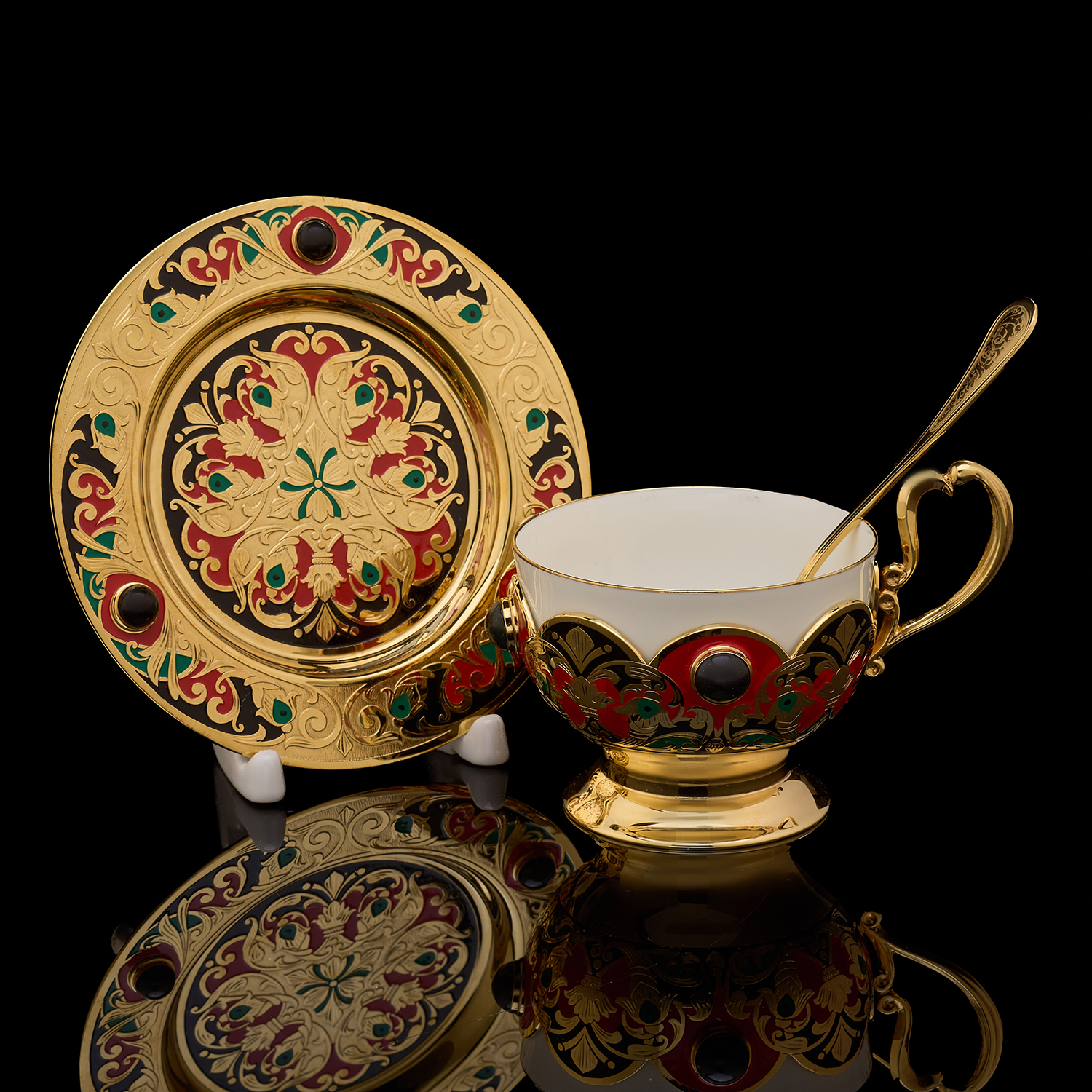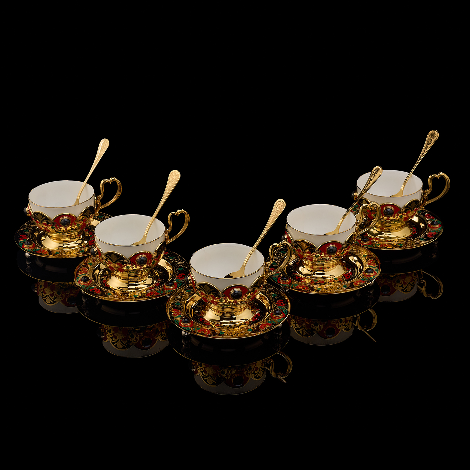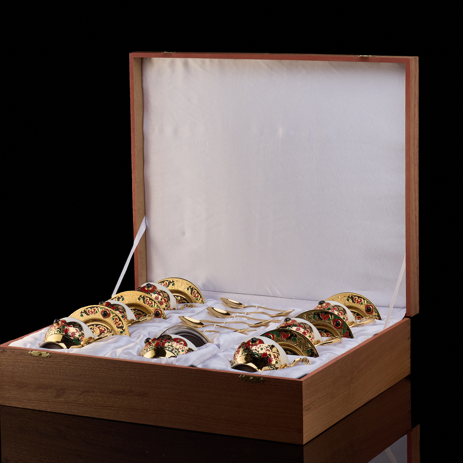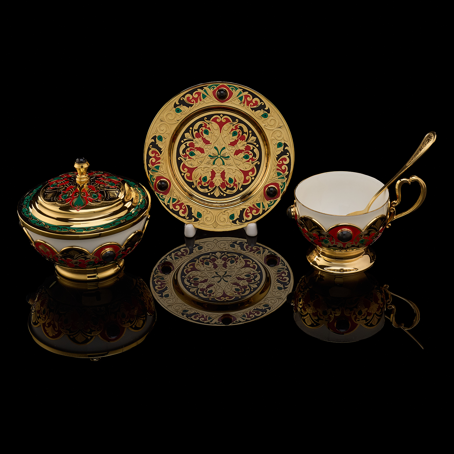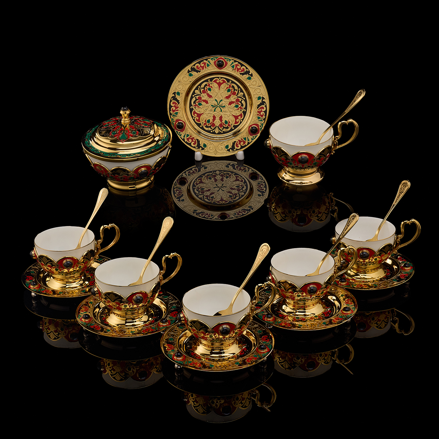 Чайный сервиз на 6 персон "Хохлома". Златоуст.Материалы: латунь, никель, золото 999,9*, эмаль, агат, фарфор.