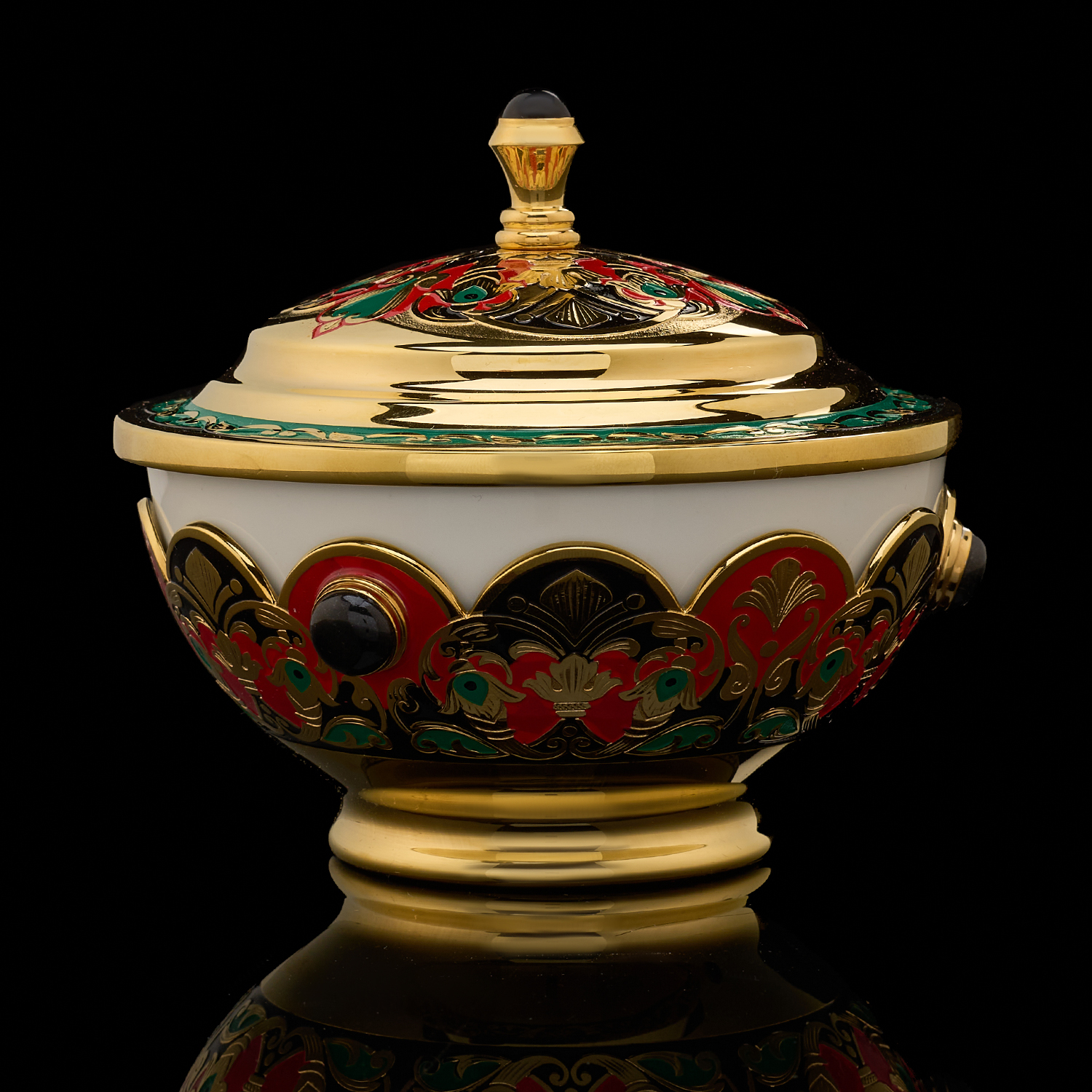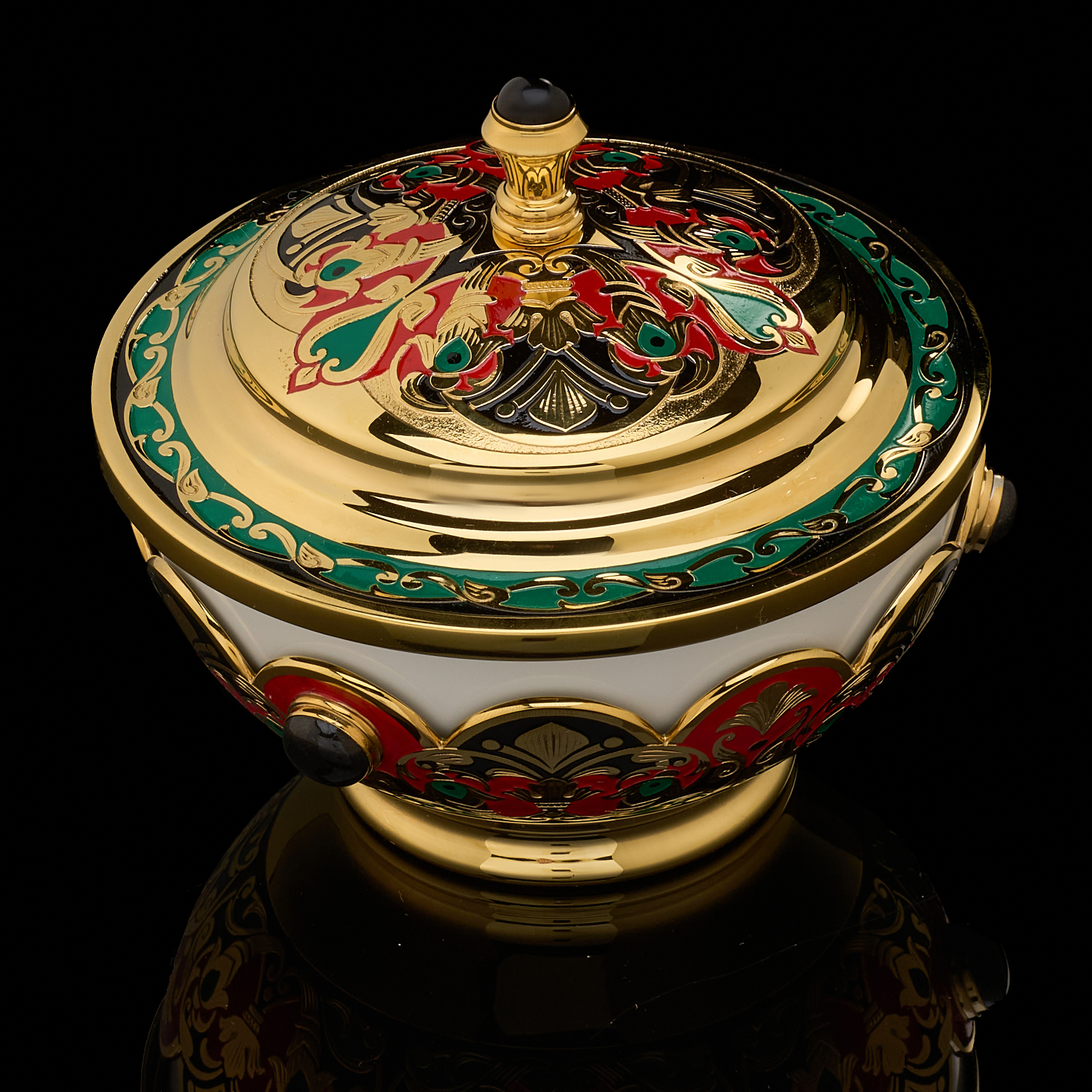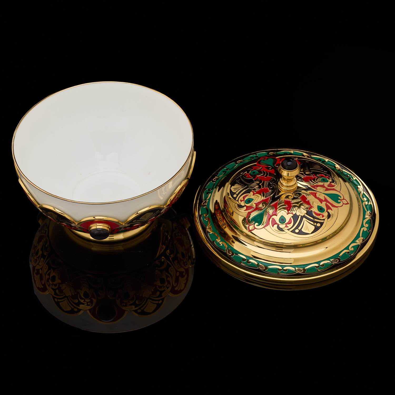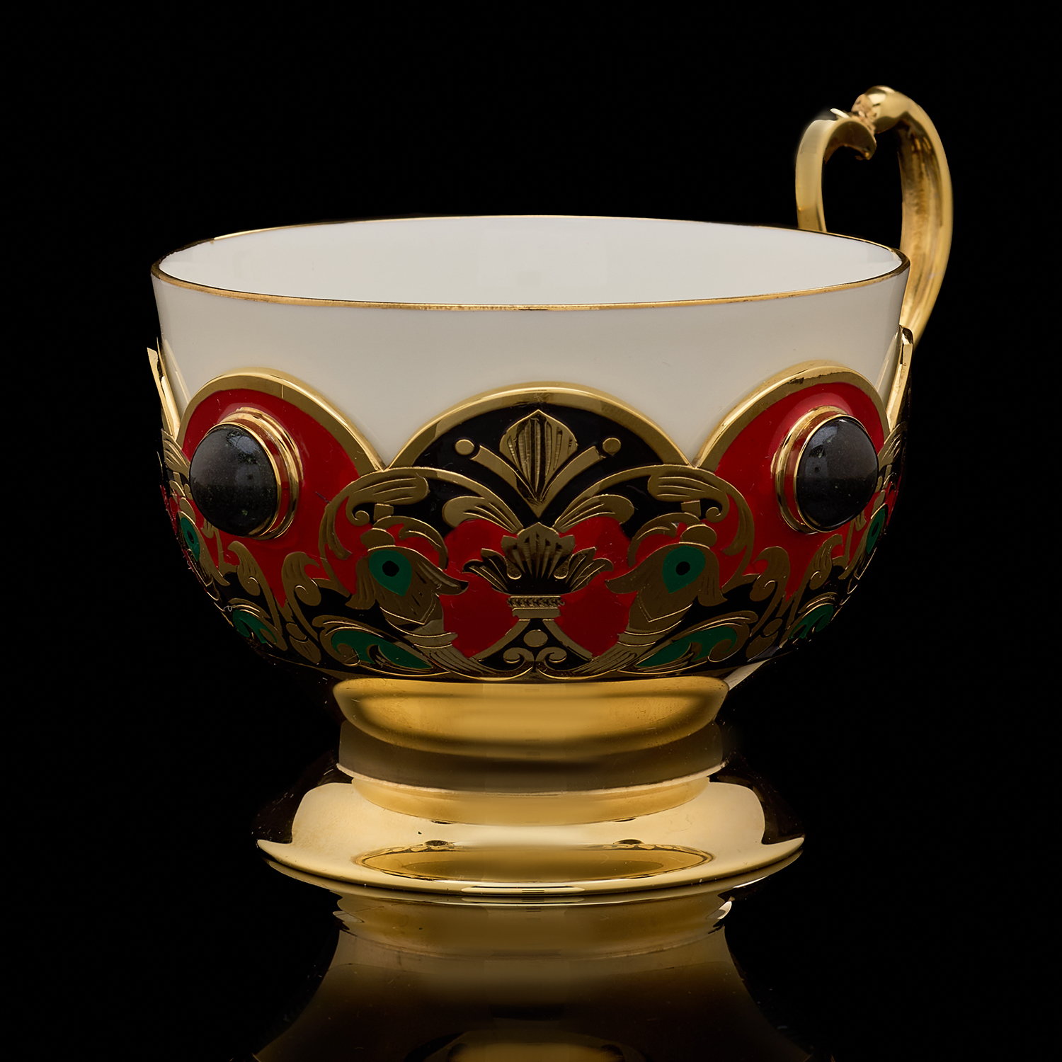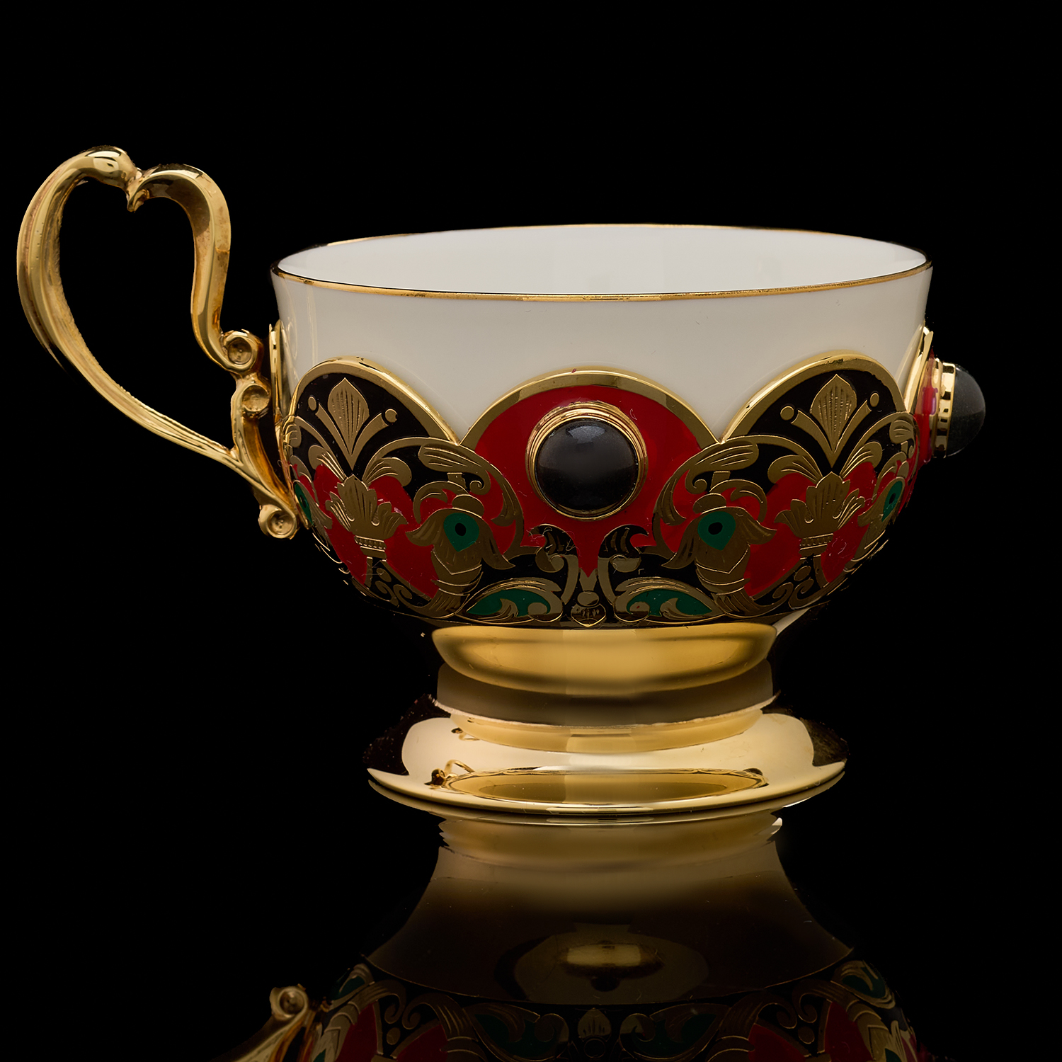 Чайный сервиз на 6 персон "Хохлома". Златоуст.Материалы: латунь, никель, золото 999,9*, эмаль, агат, фарфор.