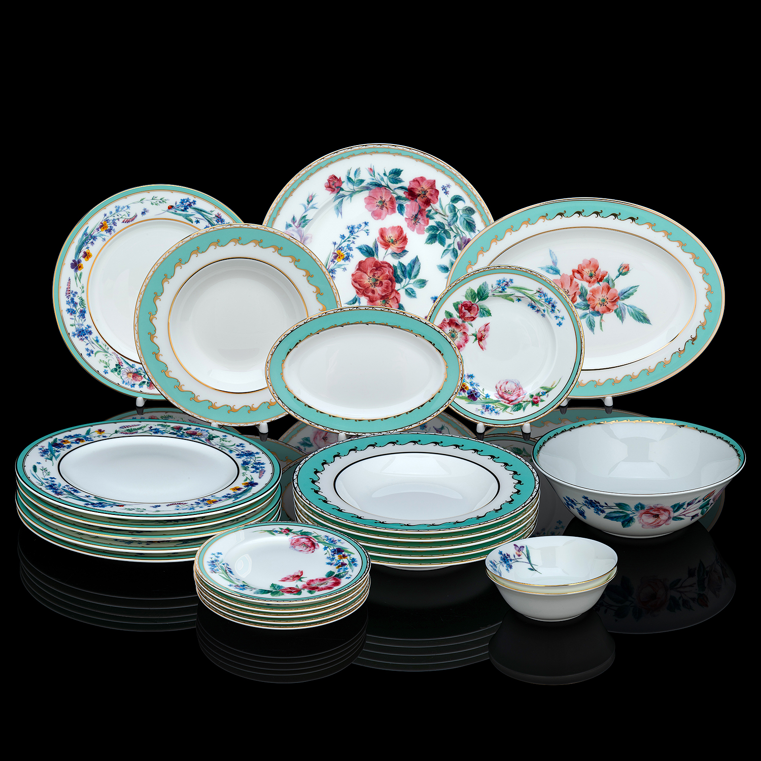 Сервиз включает в себя 24 предмета: 6 плоских тарелок 20.5 см, 6 глубоких тарелок 23.5 см, 6 плоских тарелок 27, овальное блюдо 35 х 25.5 см, овальное блюдо 23 х 15 см, круглое блюдо 31 см, 2 салатника 15 см, салатник 24 см. ....