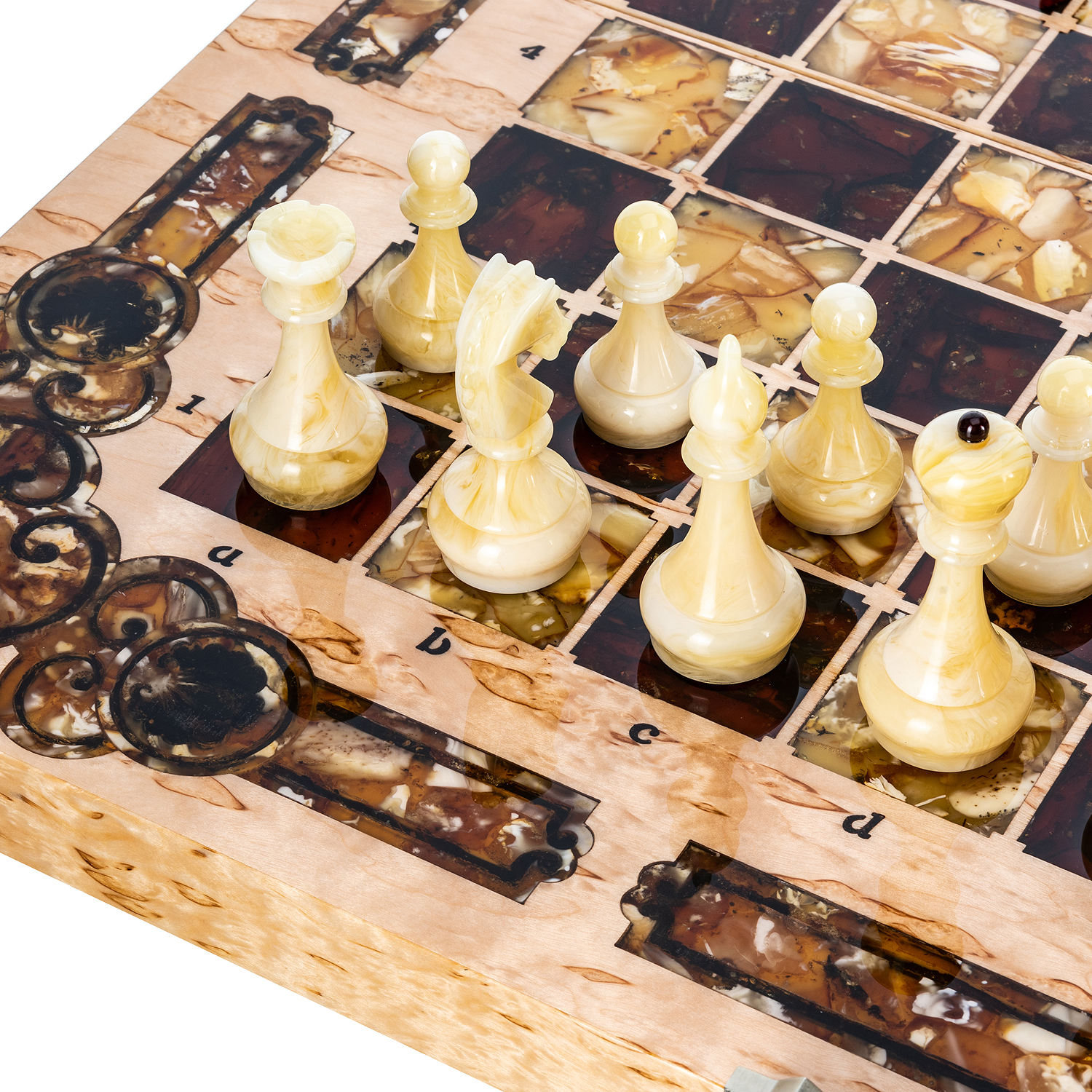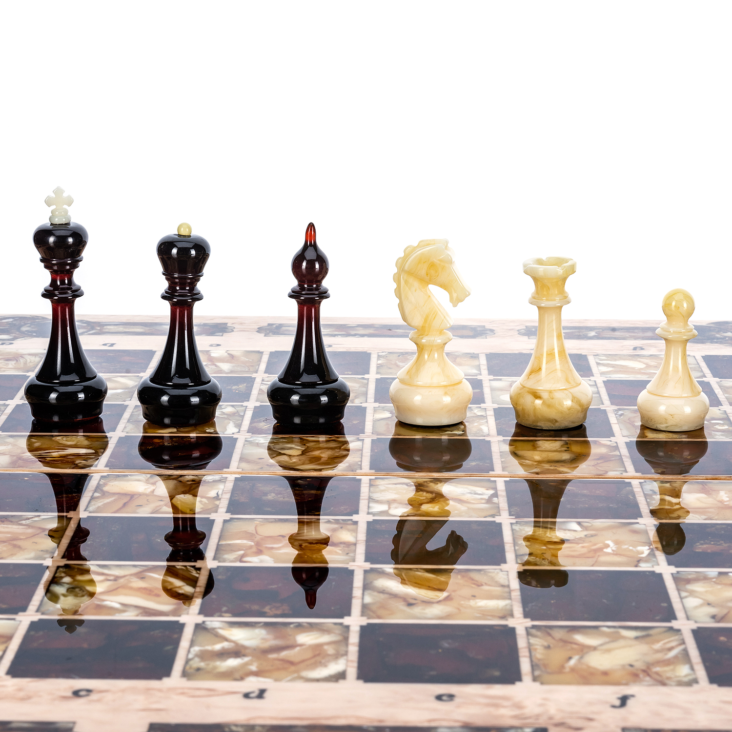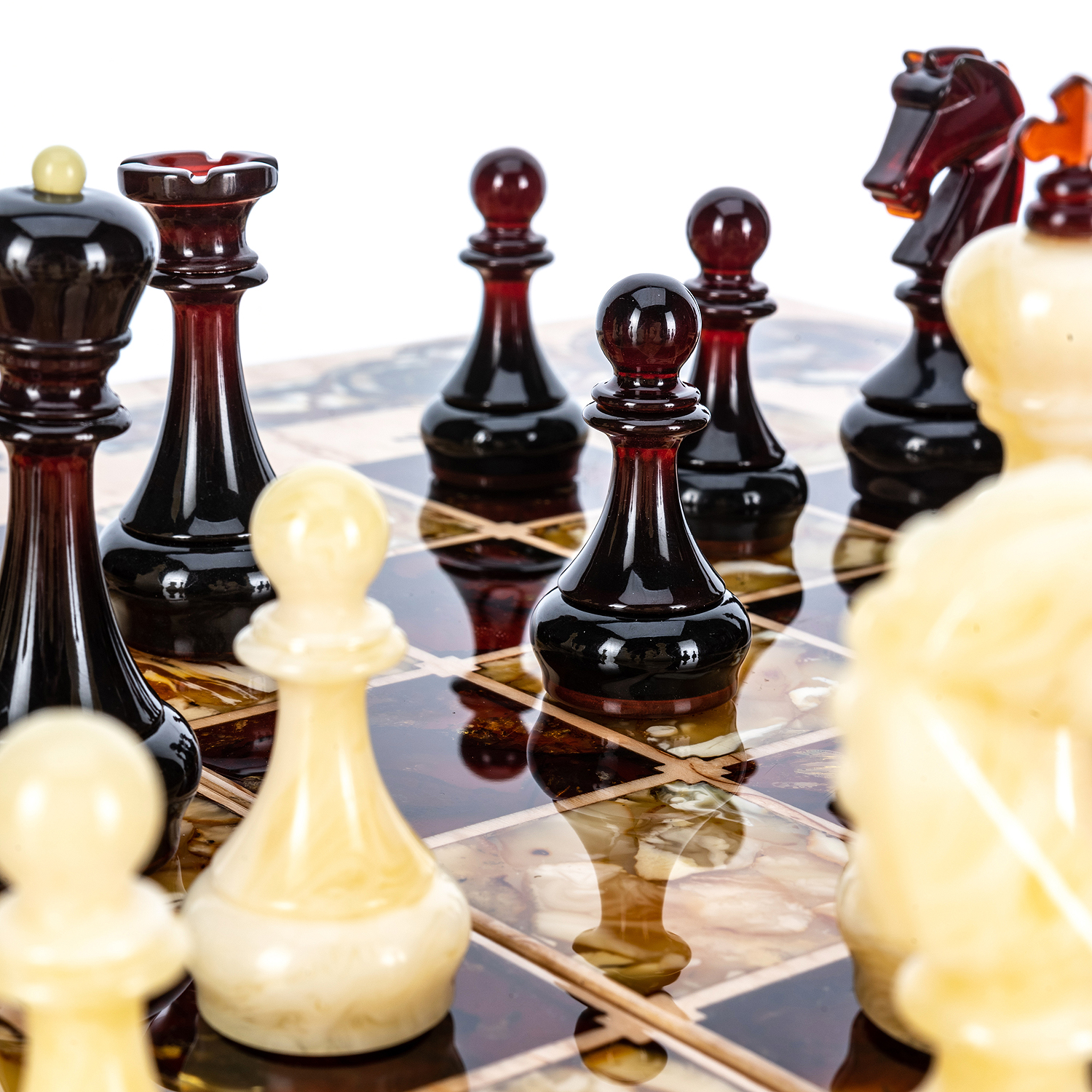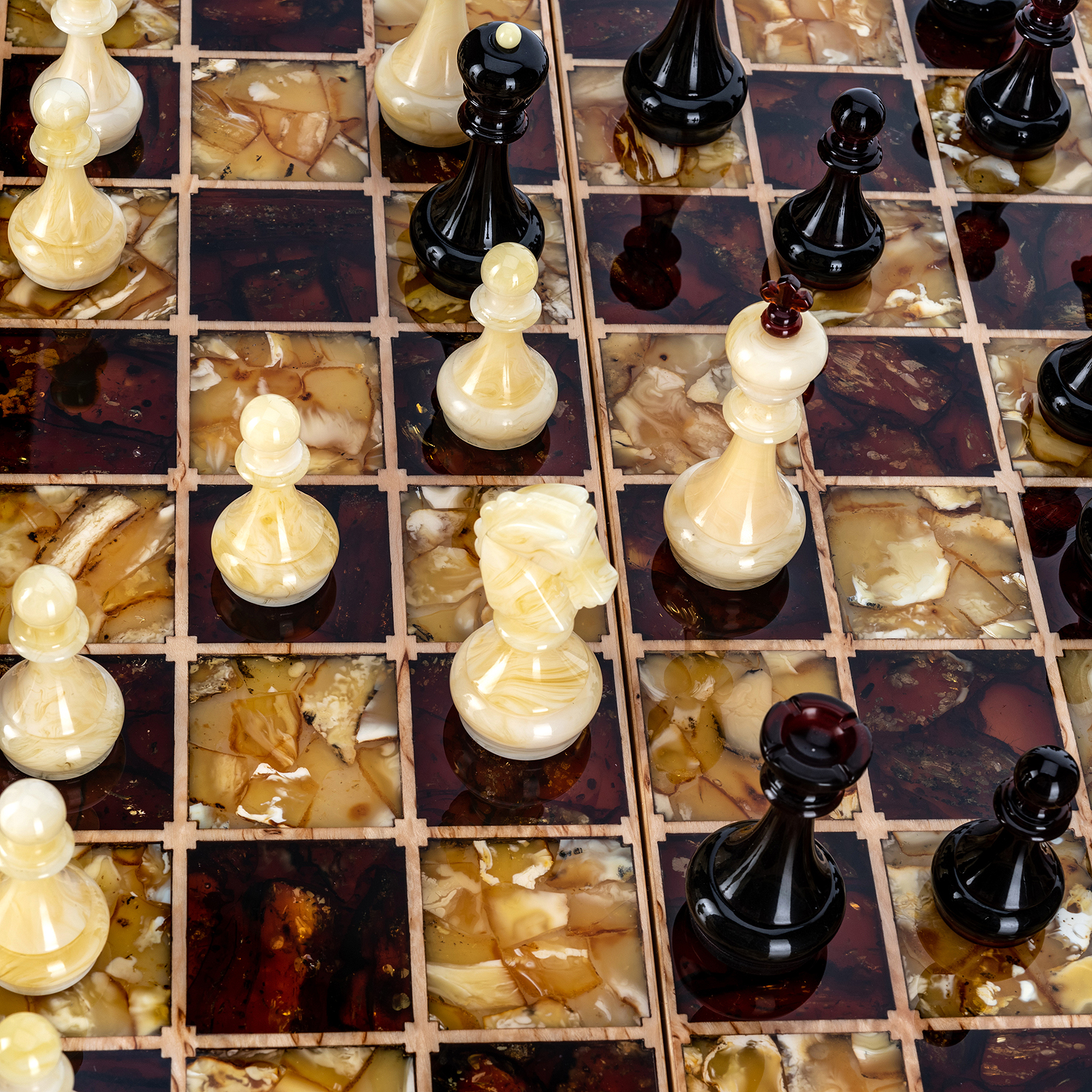 Шахматы с инкрустацией и фигурами из янтаря "Арабески-Марин" 56х56 см