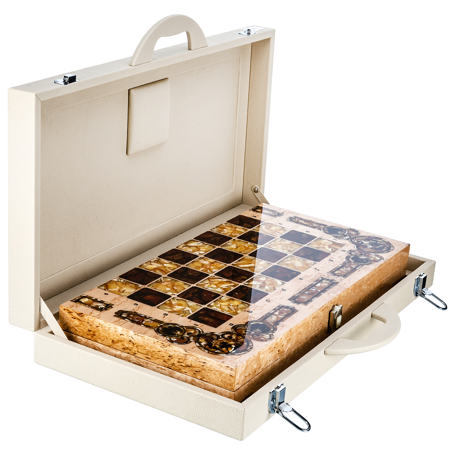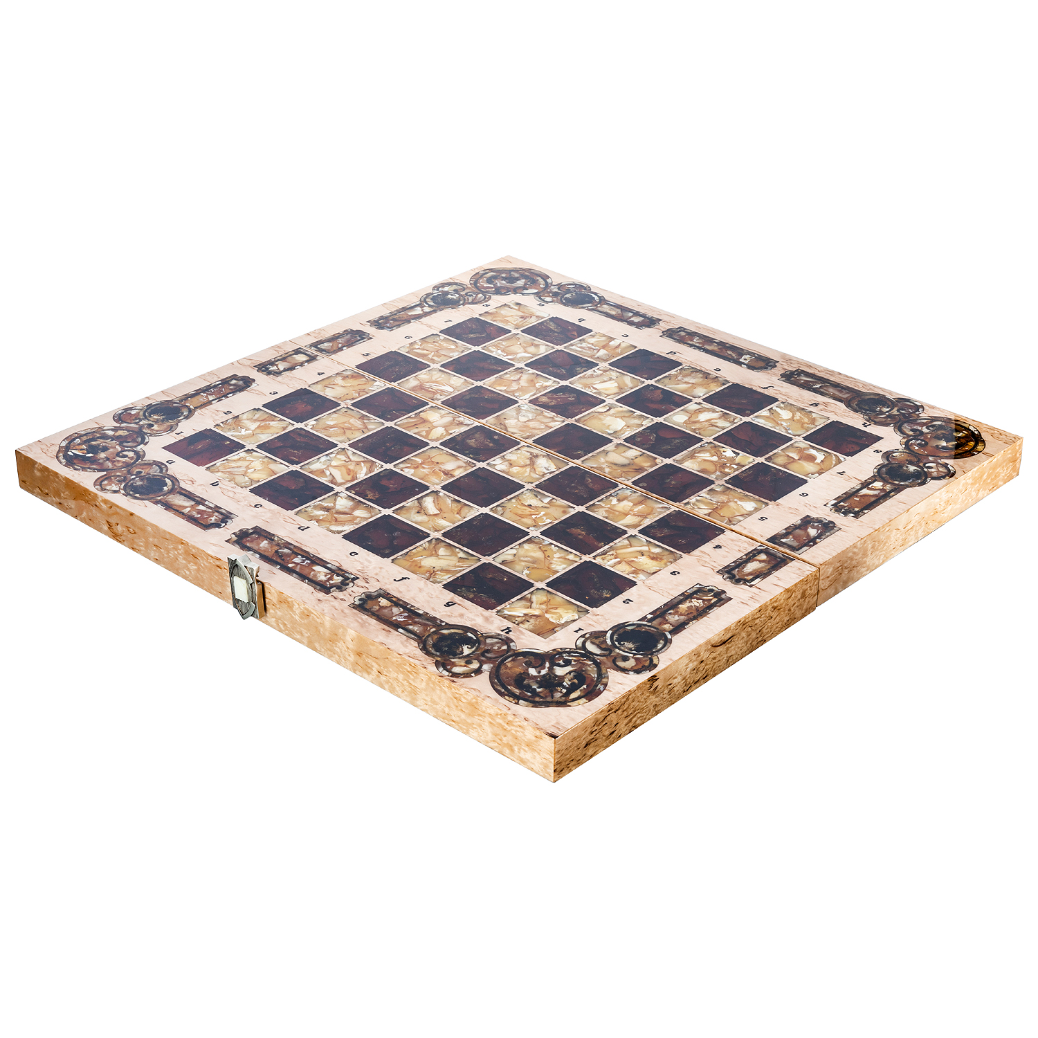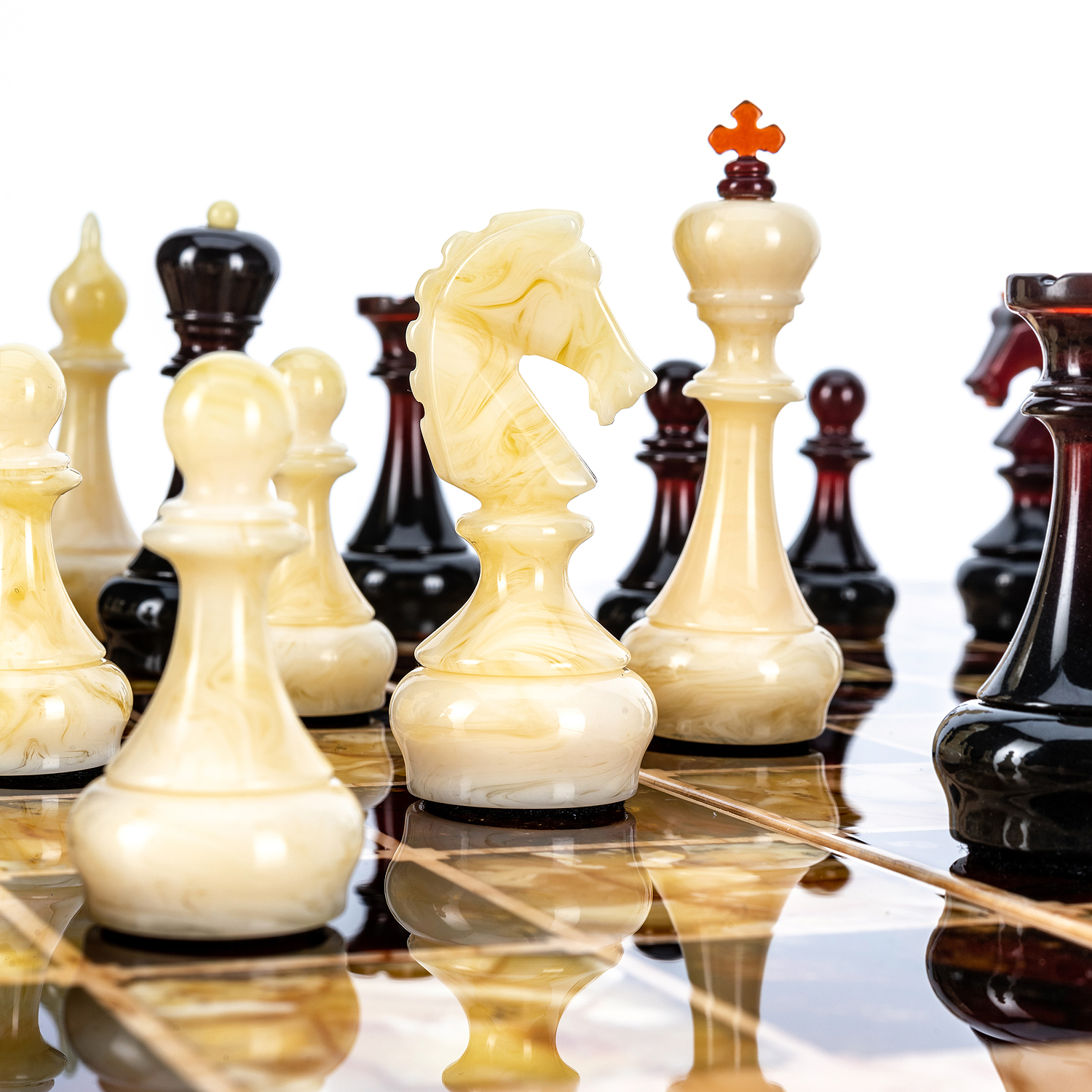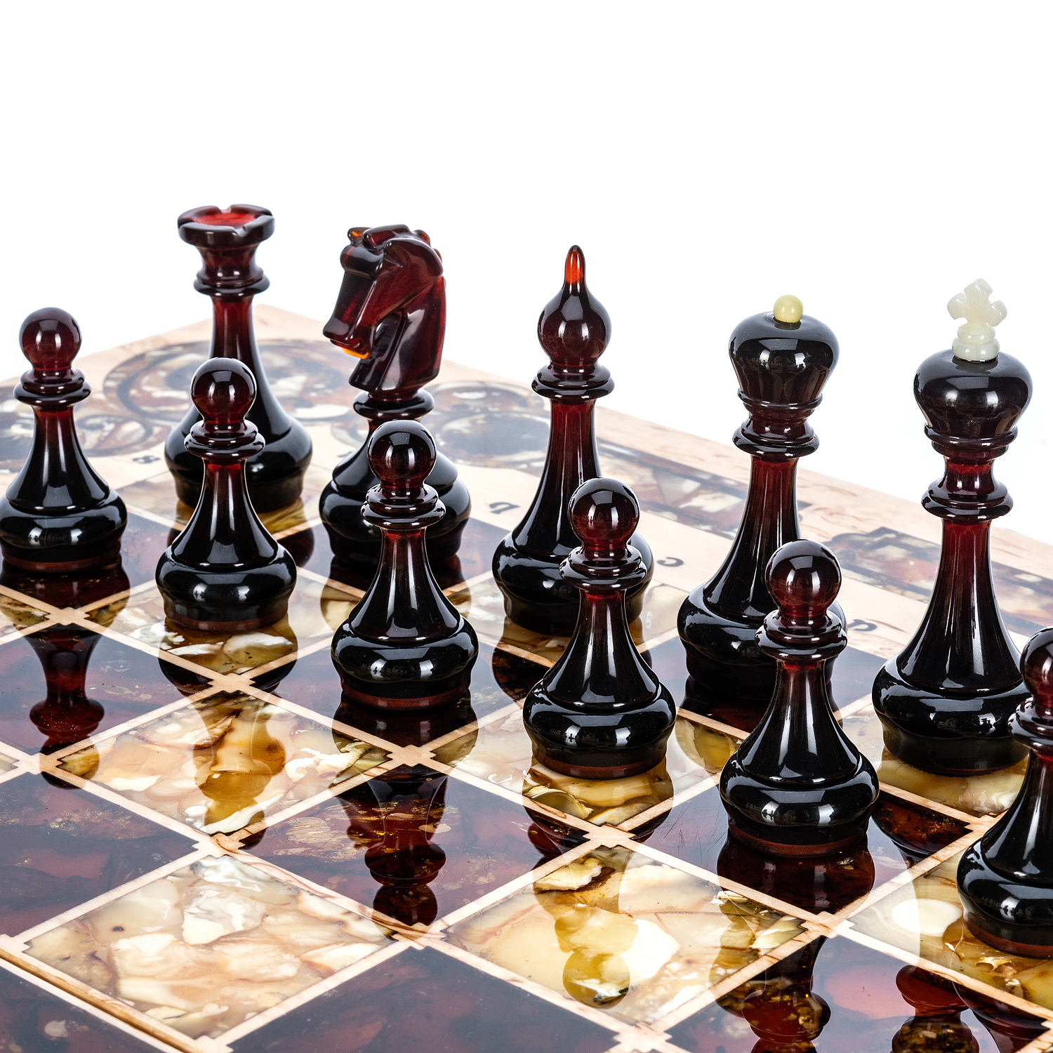 Шахматы с инкрустацией и фигурами из янтаря "Арабески-Марин" 56х56 см