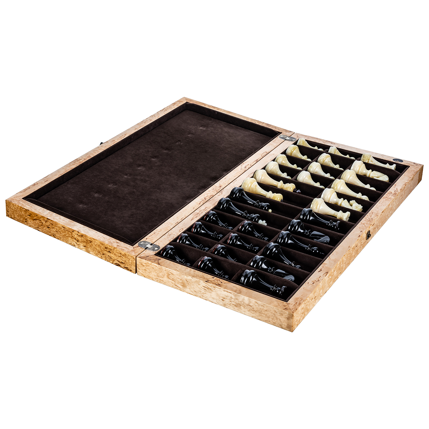 Шахматы с инкрустацией и фигурами из янтаря "Арабески-Марин".Материалы: корень ореха, янтарь.