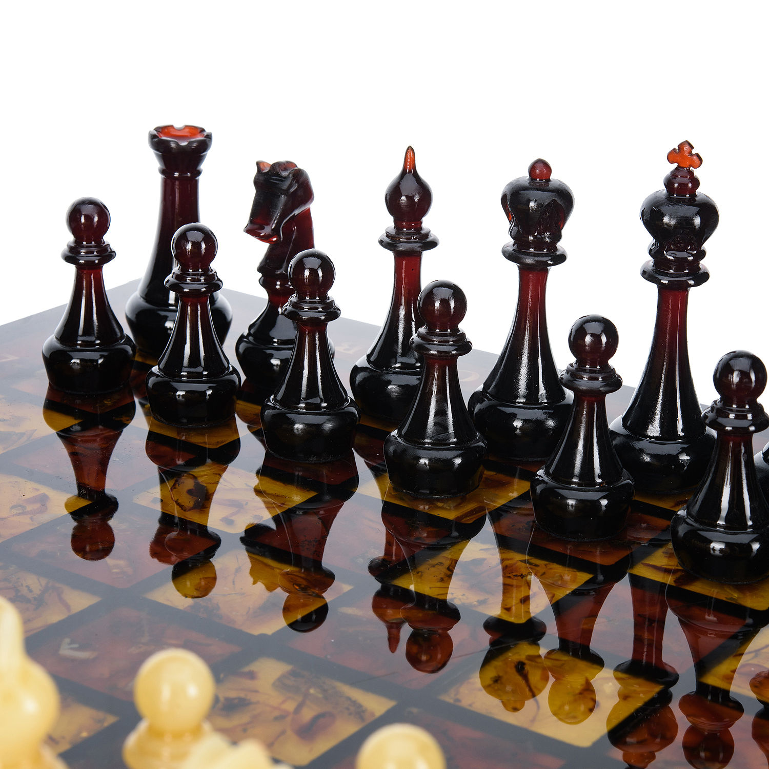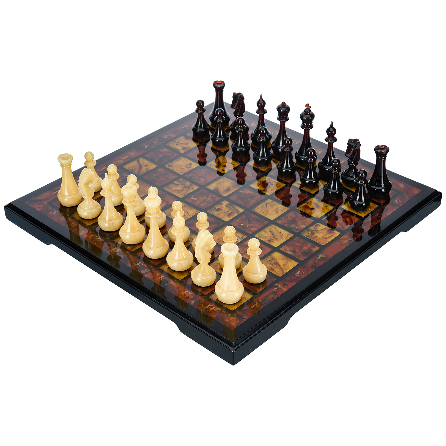 Дорогие шахматы из дерева с фигурами из балтийского янтаря - это, по-настоящему, роскошный аксессуар для людей, которые видят художественную ценность изделия в целом и внимательны к деталям. Каждый элемент этих изысканных шахмат выполнен мастерами вручную, что несомненно добавляет ценности изделию. Наши эксклюзивные шахматы - это не просто потоковая продукция, а произведение искусства, в разработке которого мы учитываем не только внешнюю красоту, но и функциональность, а фигуры из драгоценного балтийского янтаря определенно добавляют дорогому шахматному набору элитарности, делая его неповторимым и элегантным. Удивите своих друзей и близких уникальным и дорогим подарком, который будет радовать многие годы и станет настоящим украшением дома или офиса. Шахматы с инкрустацией и фигурами из янтаря "Жемчужина Балтики".Материалы: дерево, янтарь, полиэфирная смола.