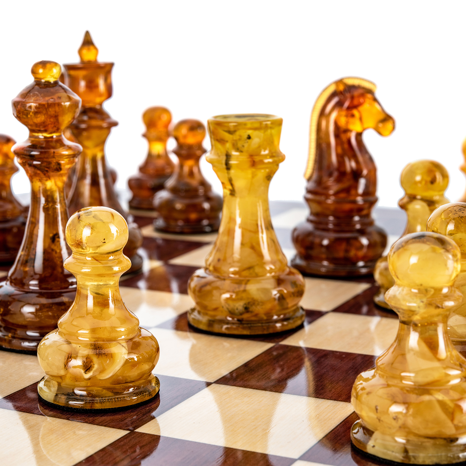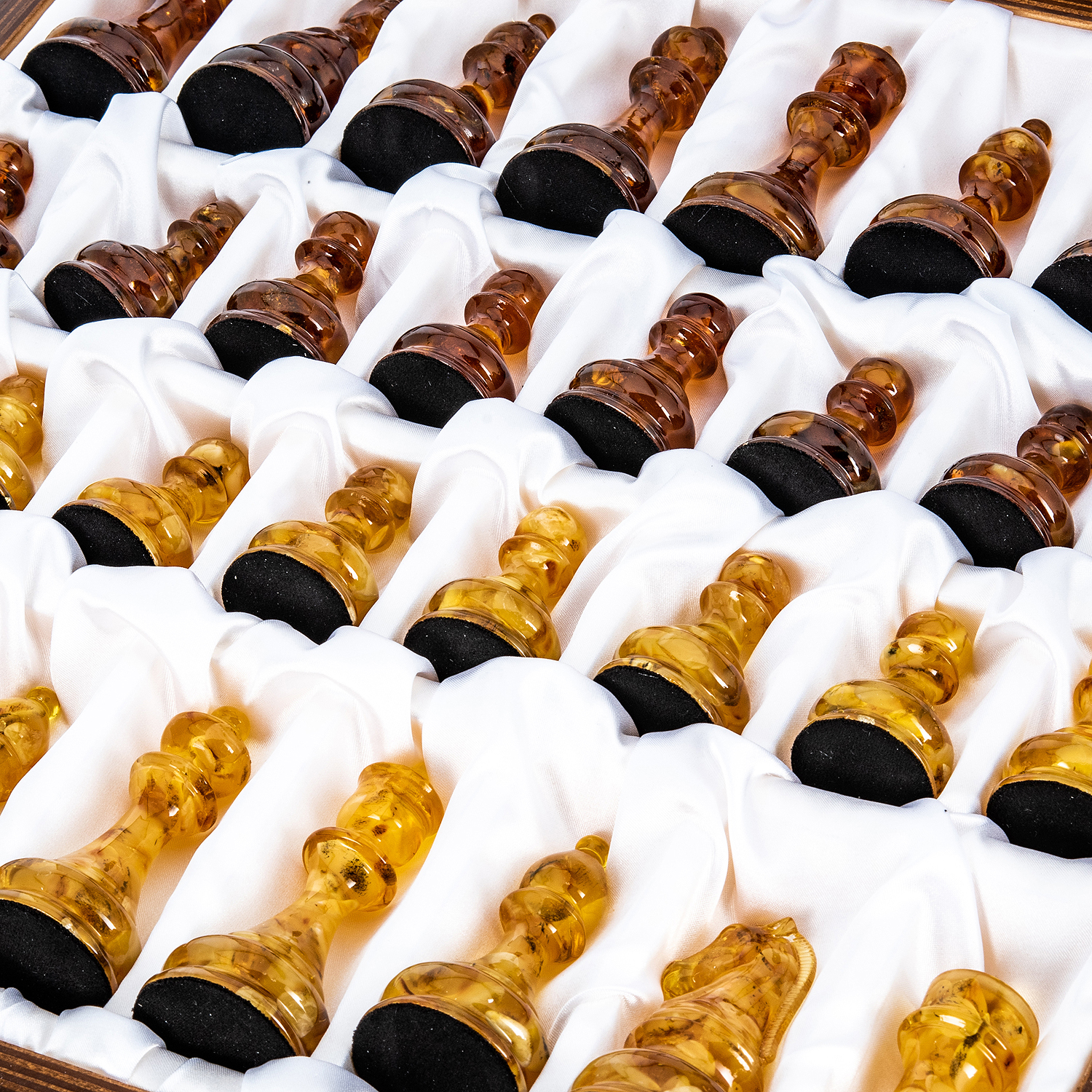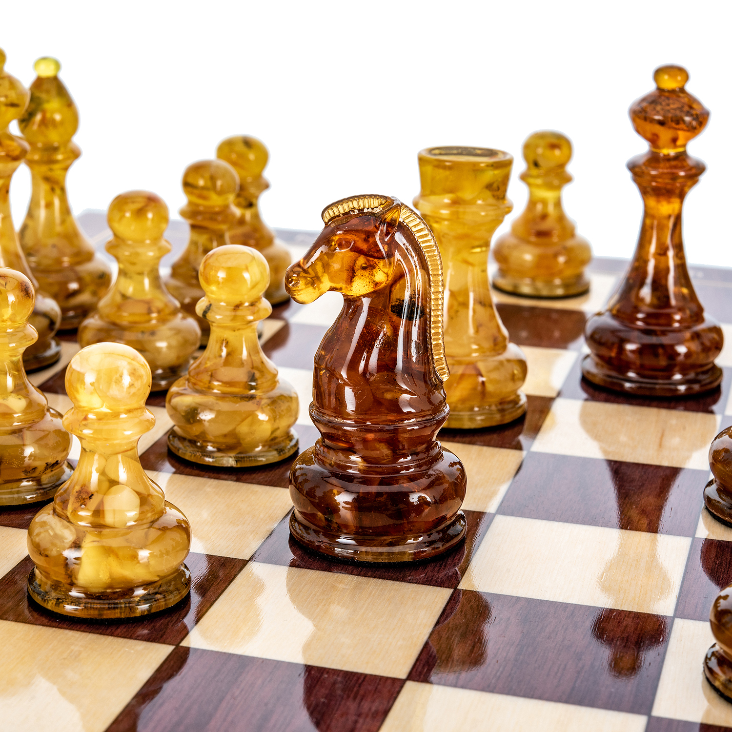Дорогие шахматы из дерева с фигурами из балтийского янтаря - это, по-настоящему, роскошный аксессуар для людей, которые видят художественную ценность изделия в целом и внимательны к деталям. Каждый элемент этих изысканных шахмат выполнен мастерами вручную, что несомненно добавляет ценности изделию.Наши эксклюзивные шахматы - это не просто потоковая продукция, а произведение искусства, в разработке которого мы учитываем не только внешнюю красоту, но и функциональность, а фигуры из драгоценного балтийского янтаря определенно добавляют дорогому шахматному набору элитарности, делая его неповторимым и элегантным.