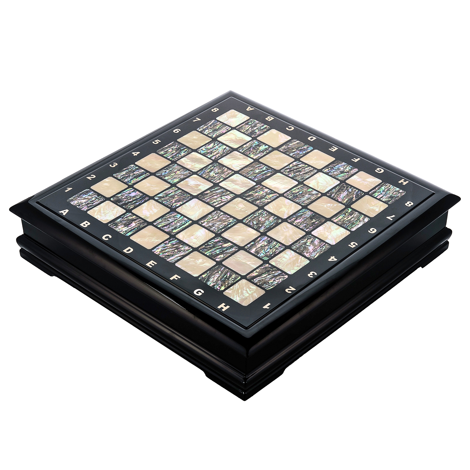 В данной модели сочетаются классический дизайн ларца с рояльным лаком и исспользование необычных для шахмат уникальных материалов, таких как натуральный перламутр и свинцовый хрусталь. Внутри янтарных шахмат установлен ложемент из искусственной замши, который позволит располагать каждую хрустальную фигуру в своей отдельной ячейке. Каждые наши перламутровые шахматы с хрустальными фигурами поставляются в фирменном кожаном кейсе.