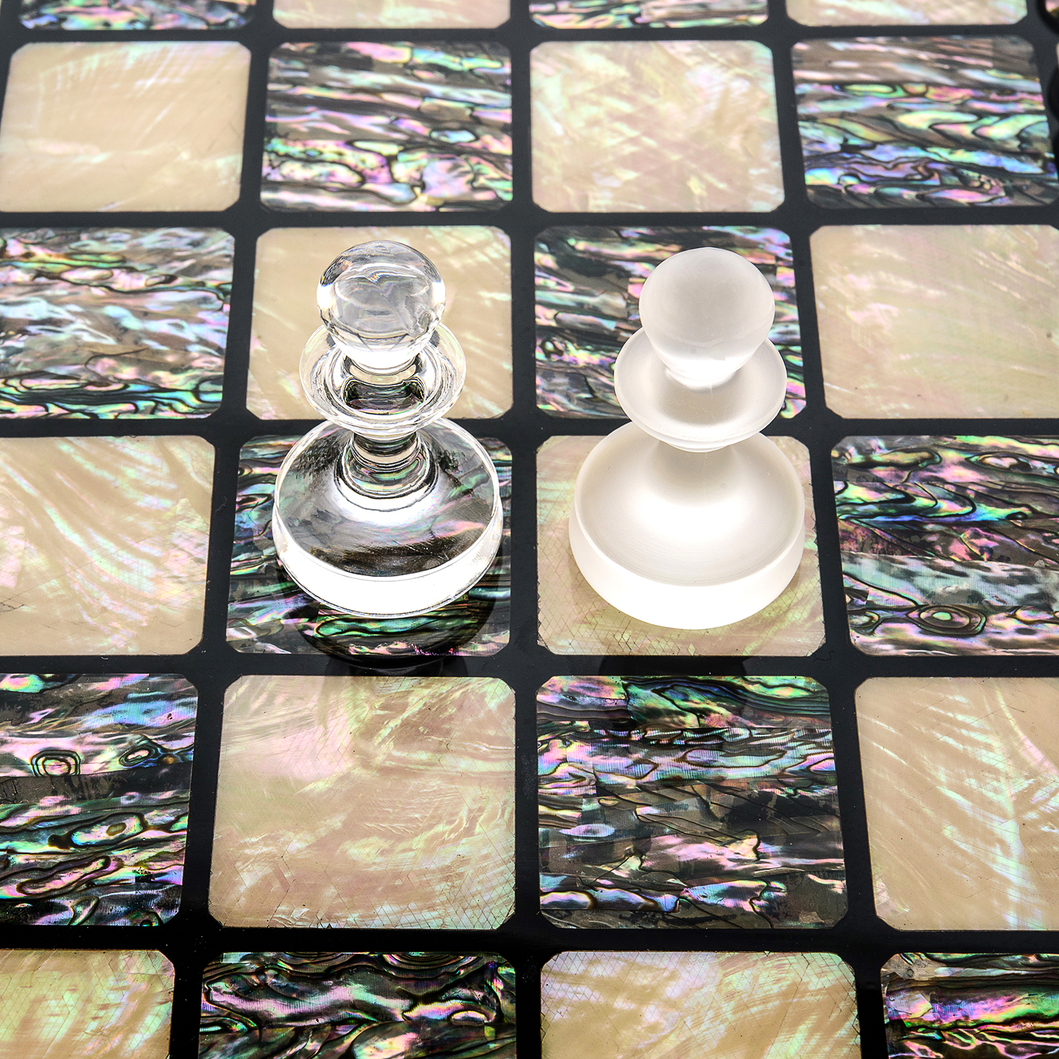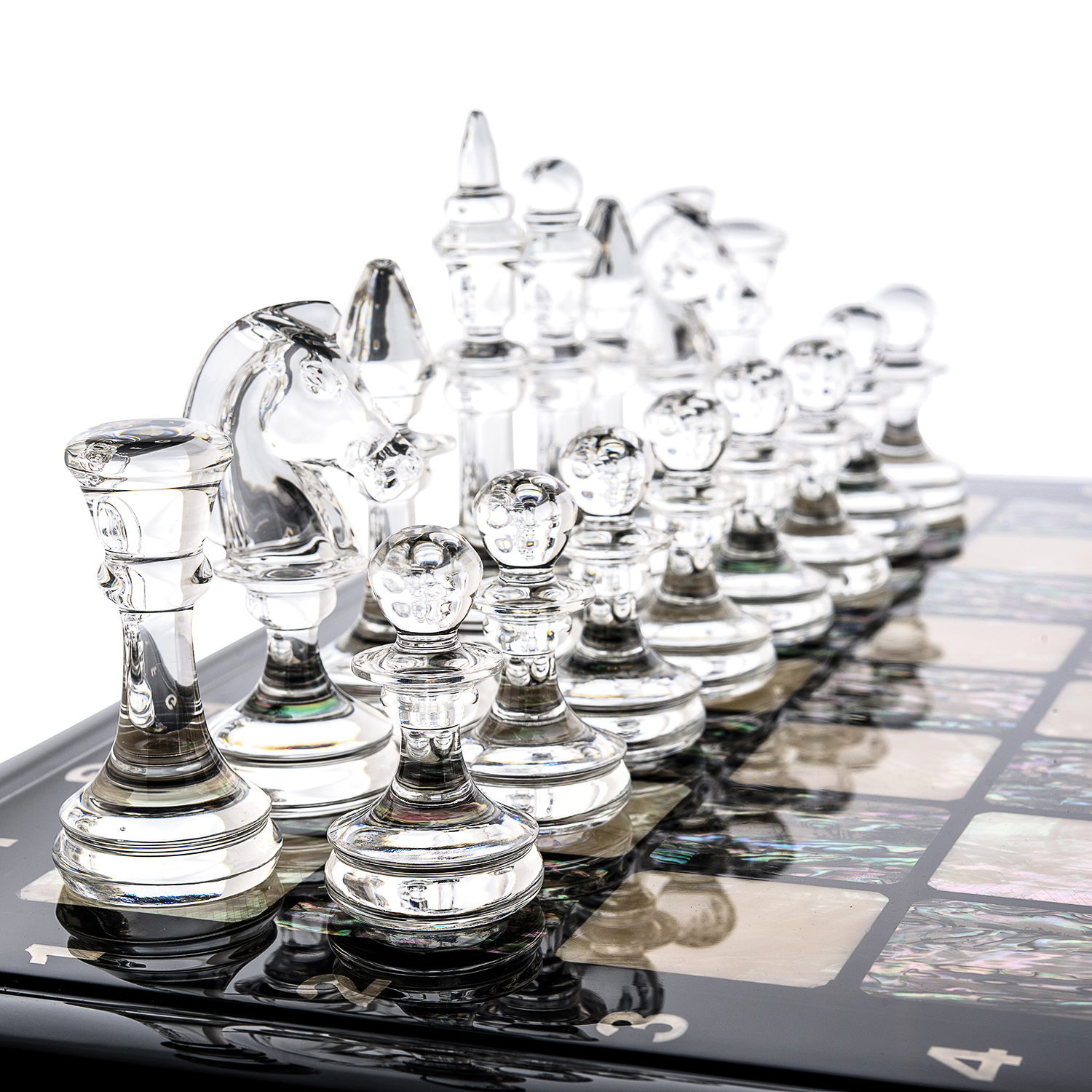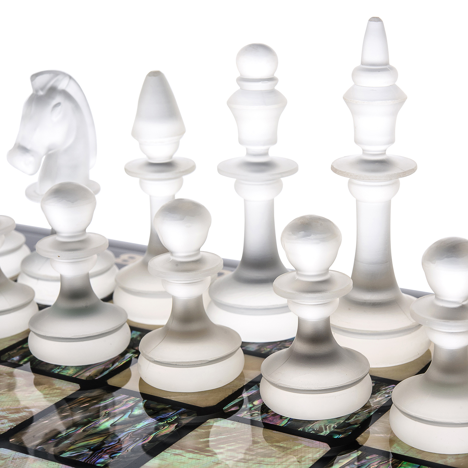 Шахматы с перламутровым полем и фигурами из хрусталя.Материалы: дерево, перламутр, хрусталь.