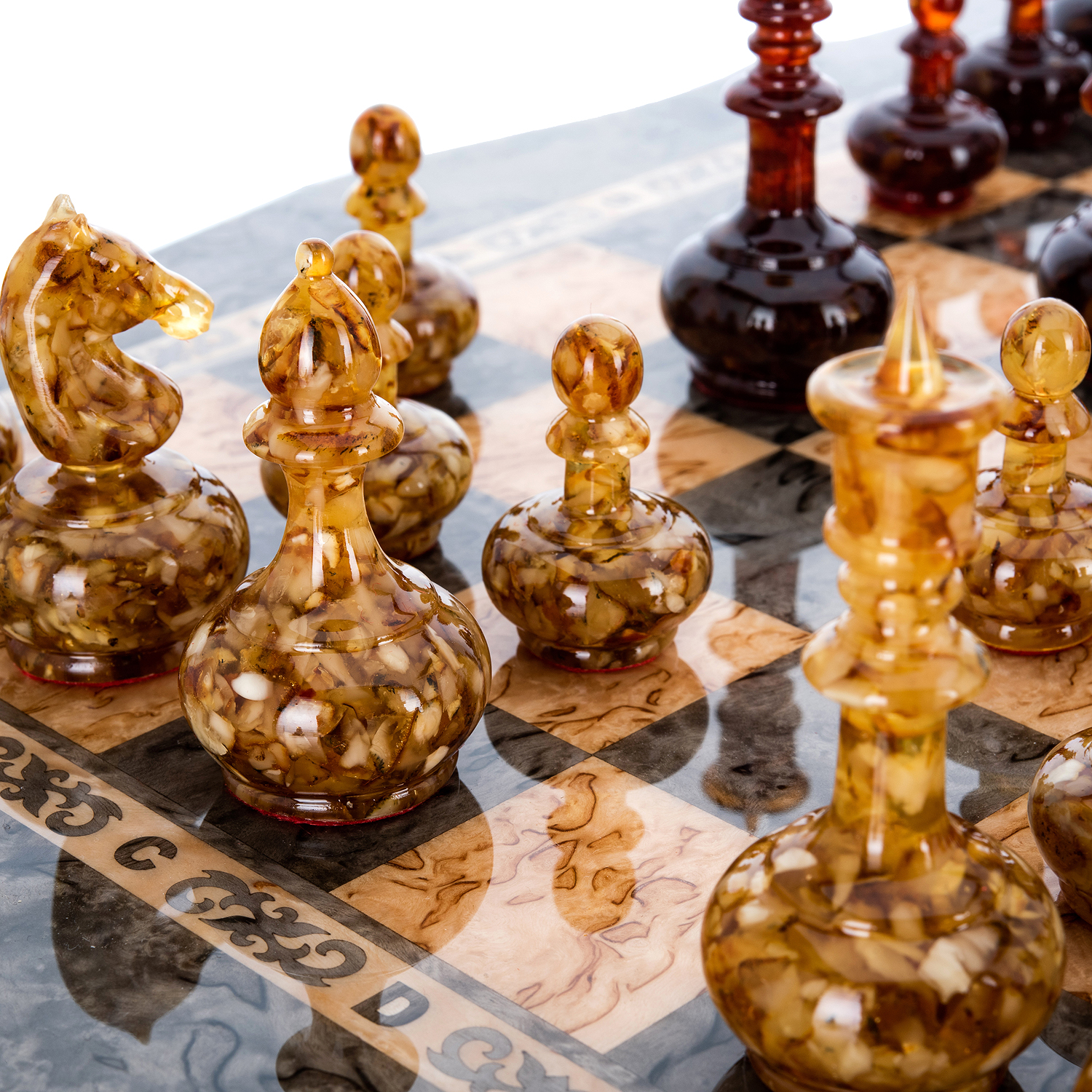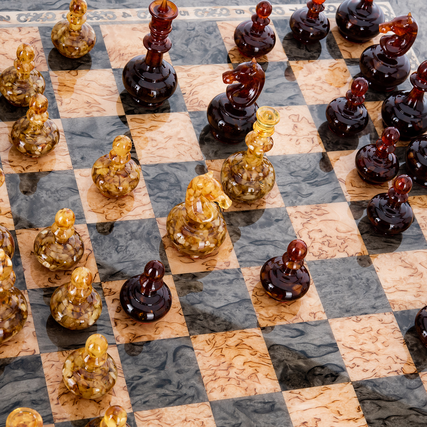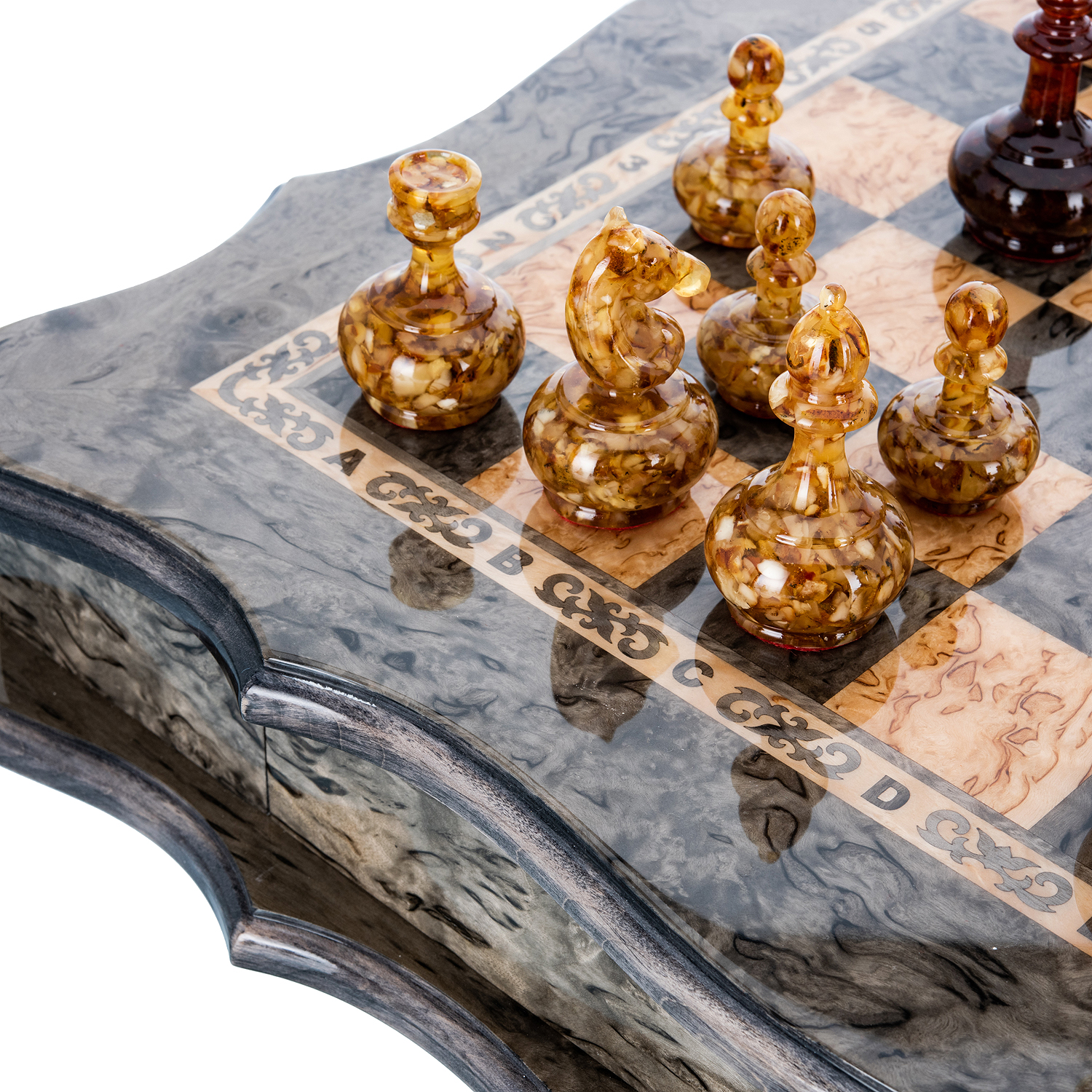 Шахматы из карельской березы с металлическими фигурами 45х45 см