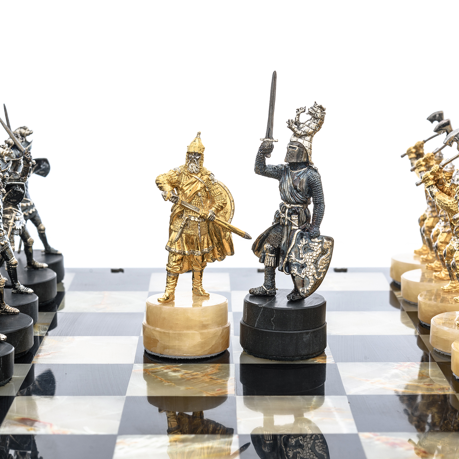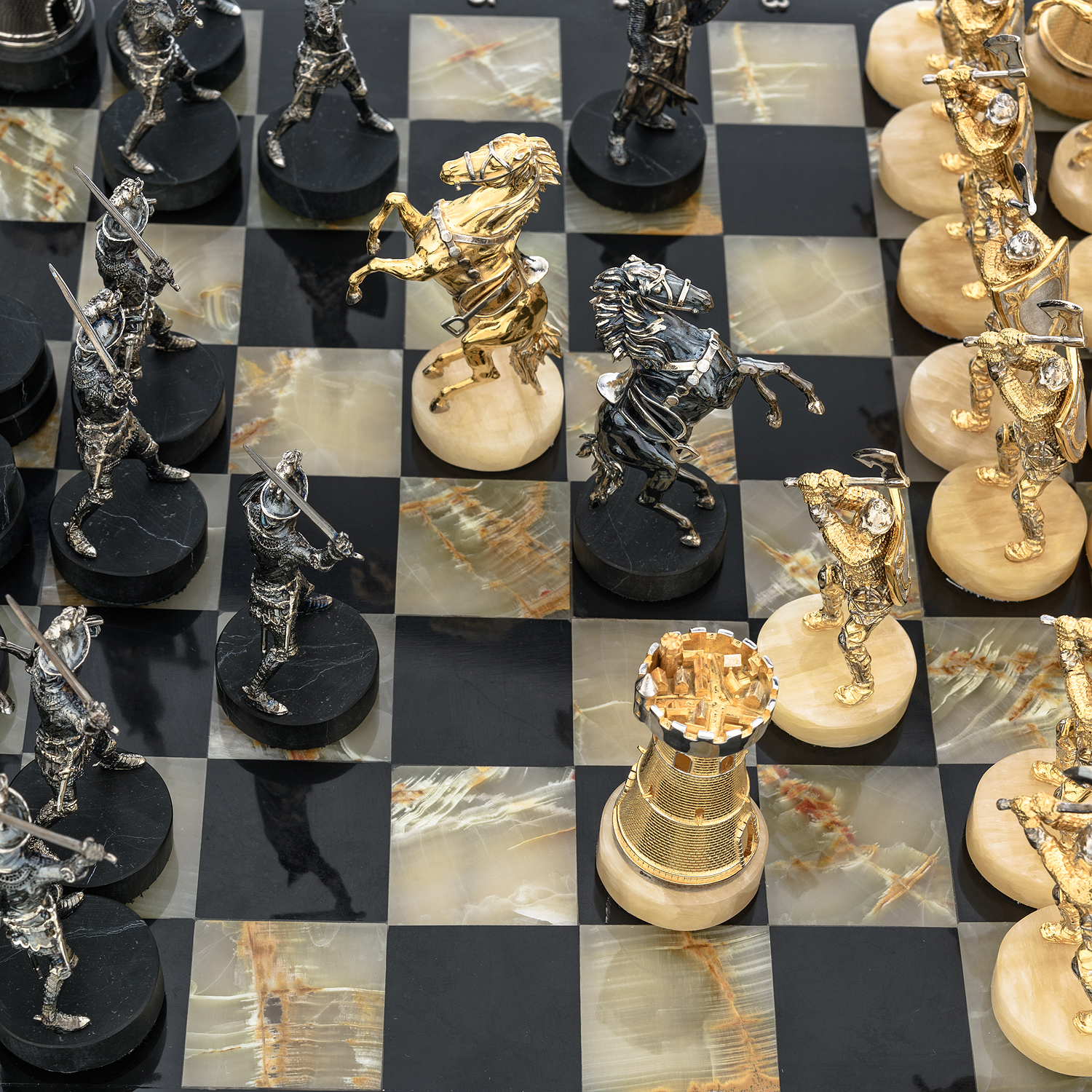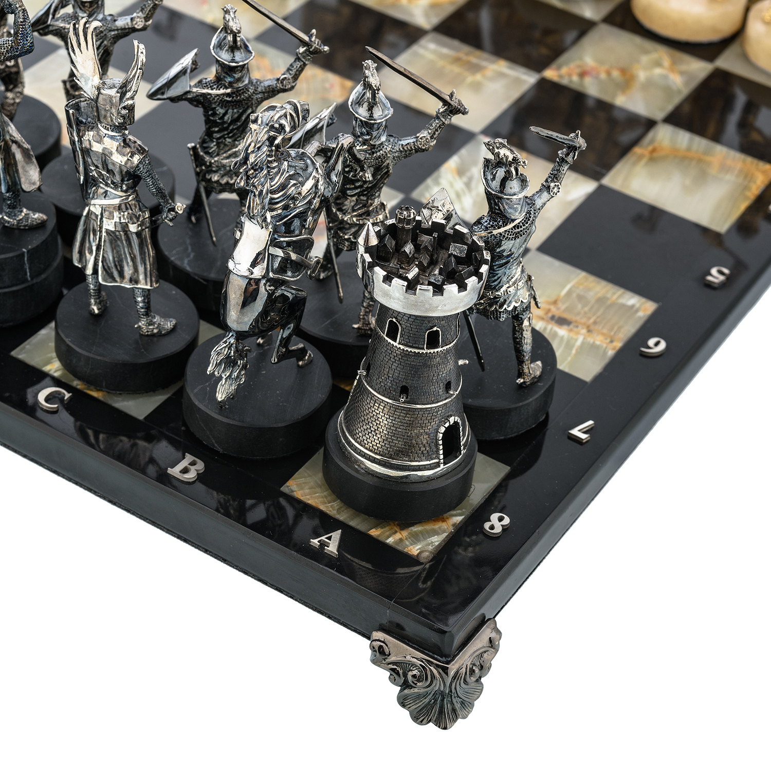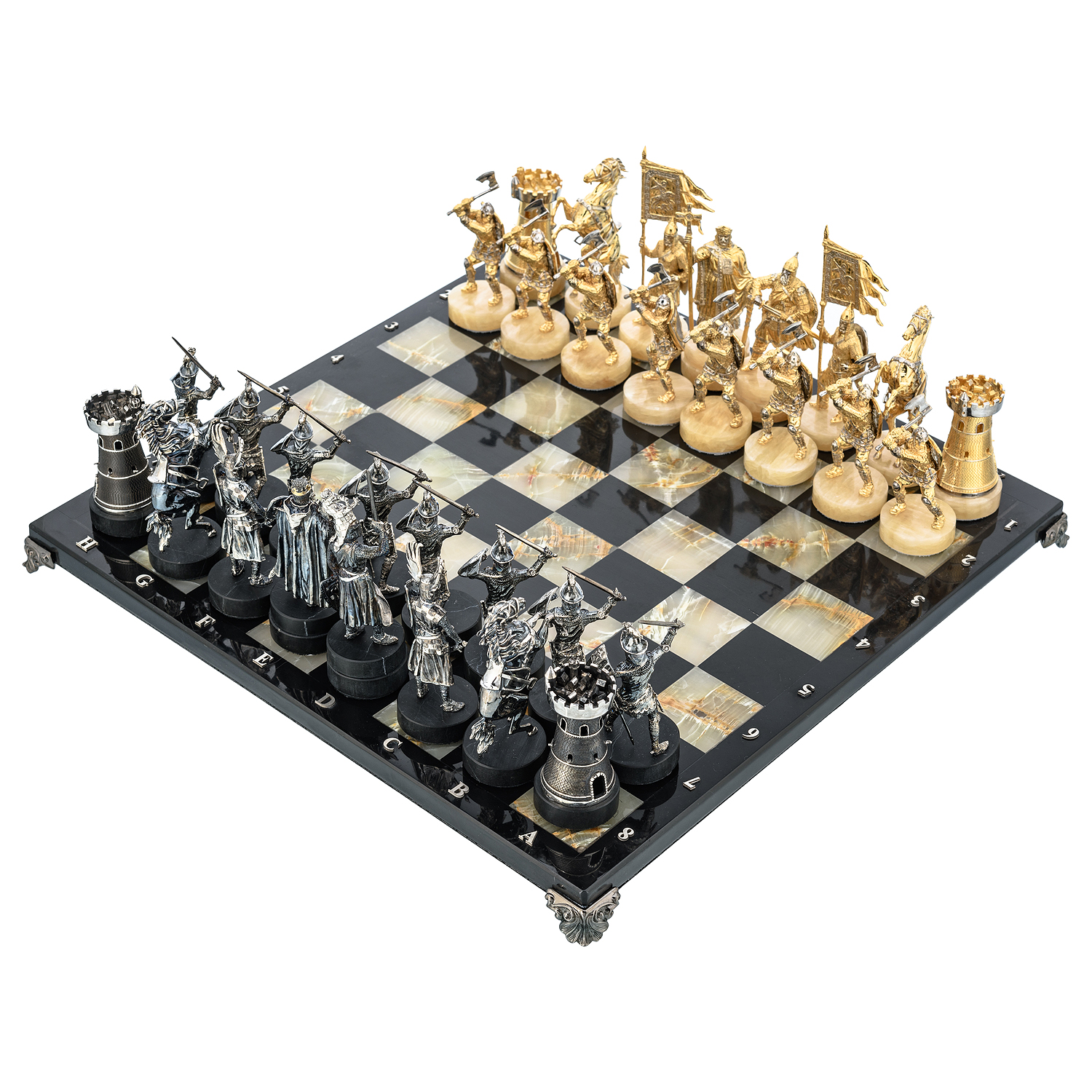 Шахматы с полем из камня и фигурами из серебра "Сражение" 35х35 см