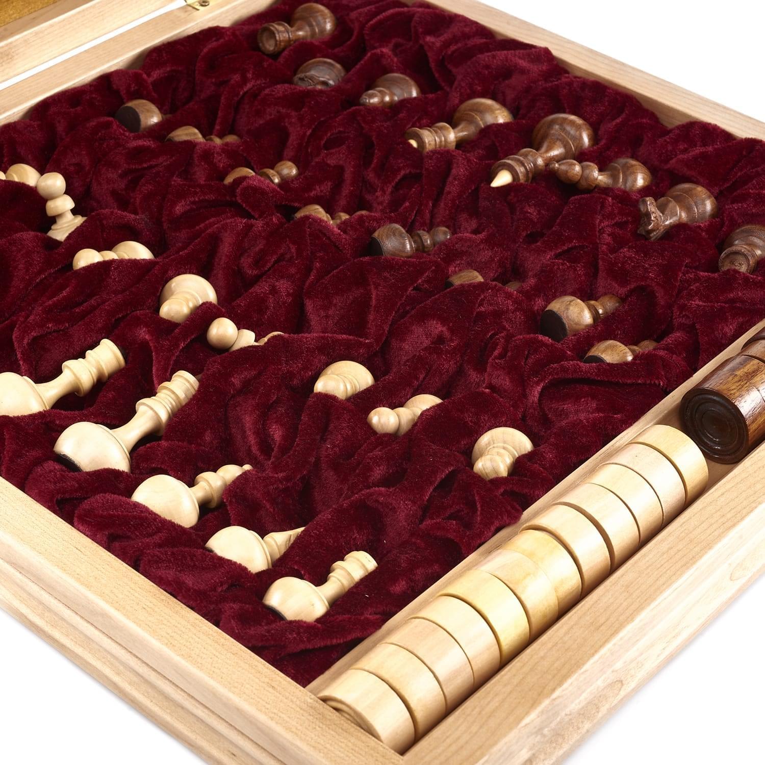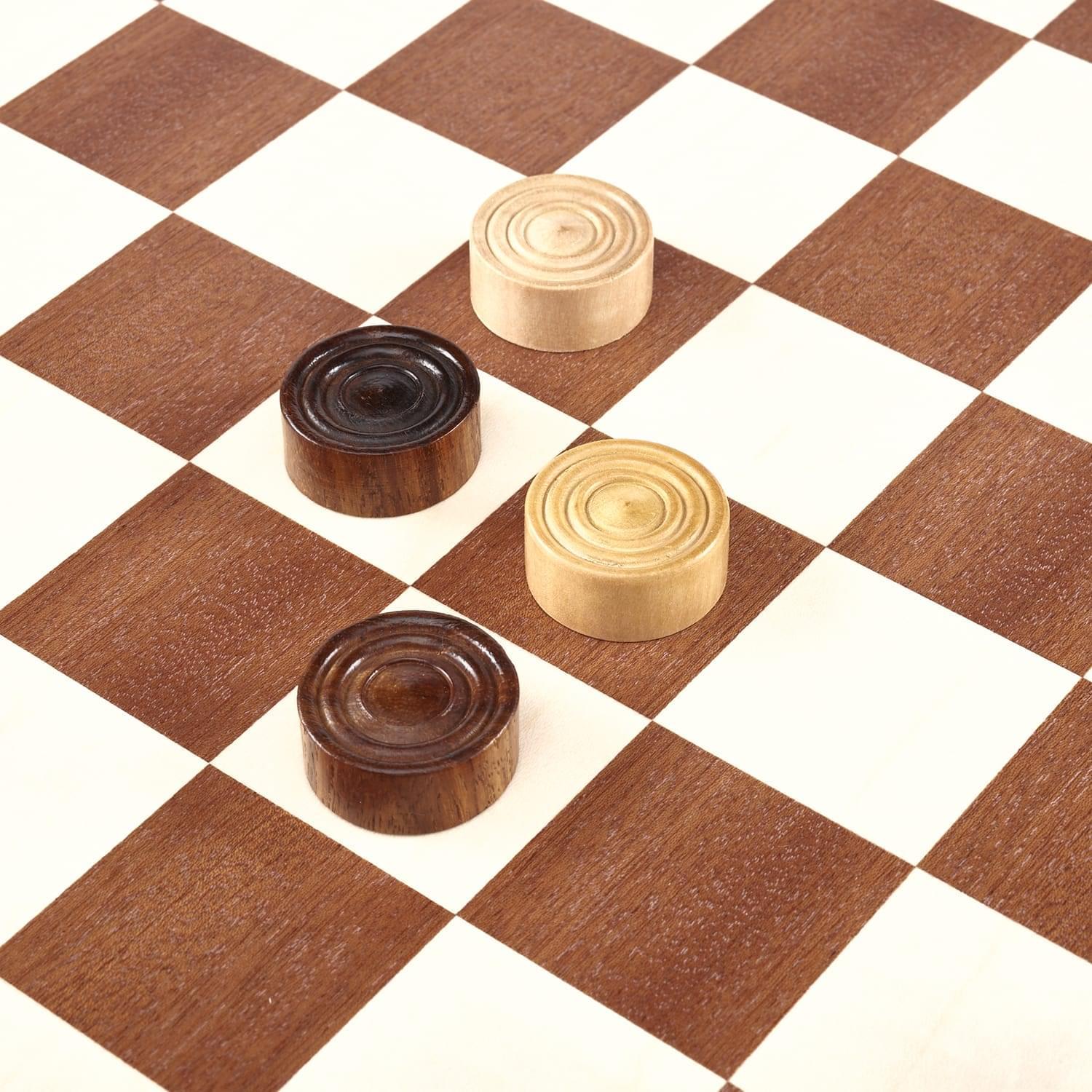 Шахматы и шашки в одном составляют оригинальный игровой набор. Сделан он из нескольких видов древесины, включая розовое дерево. Другие его названия: баи́я, буа де роз, тюльпановое дерево. Это древесина, получаемая от субтропического дерева из рода Дальбергия, произрастающего в Бразилии.Деревья рода Дальбергия дают также большую часть древесины палисандр.