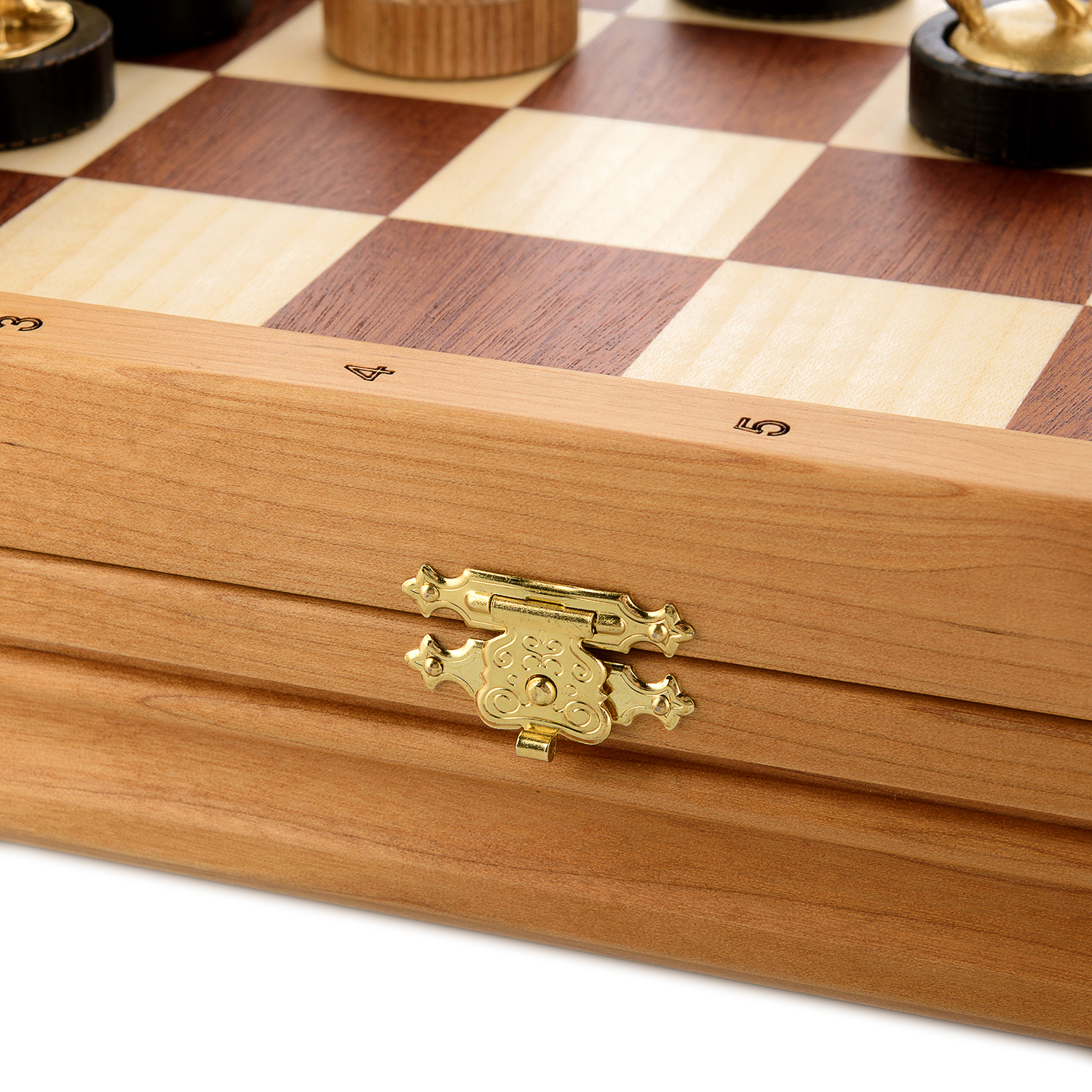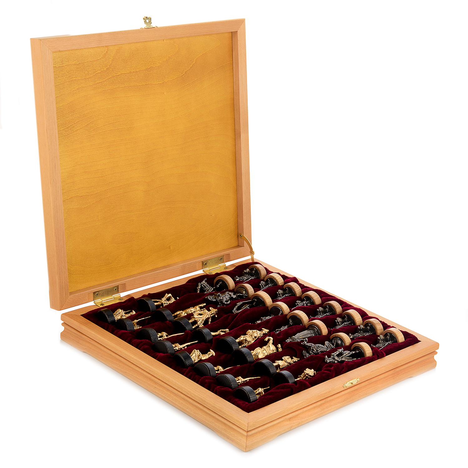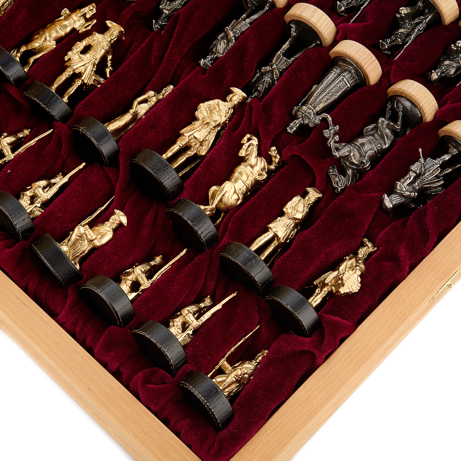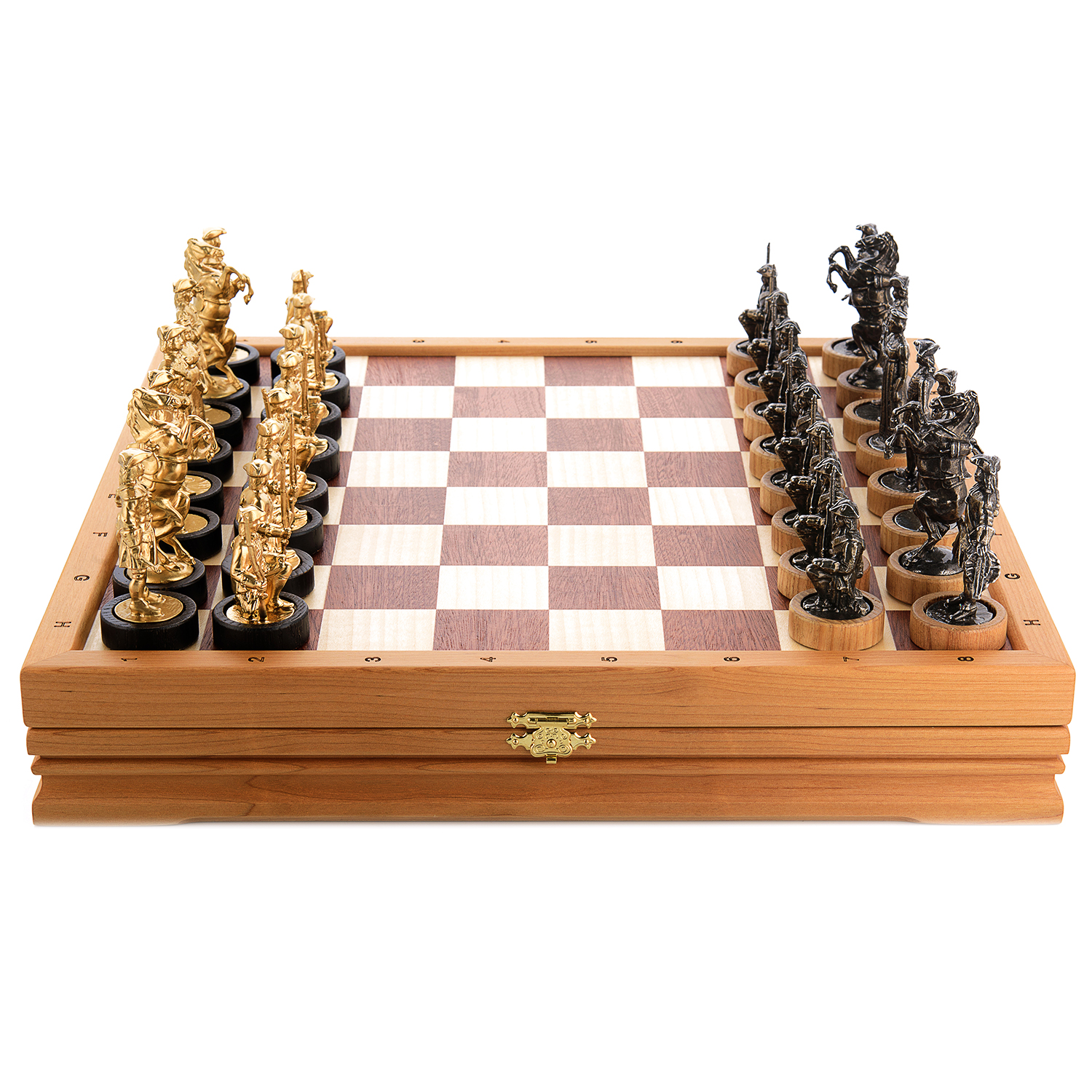Деревянный шахматный ларец с металлическими фигурами станет отличным подарком для образованного человека, интереесующегося историей. Внутри подарочных шахмат установлен ложемент с атлассной тканью, каждая фигурка ложится в свою ячейку. Такие эксклюзивные деревянные шахматы непременно станут ярким акцентом Вашего интерьера.