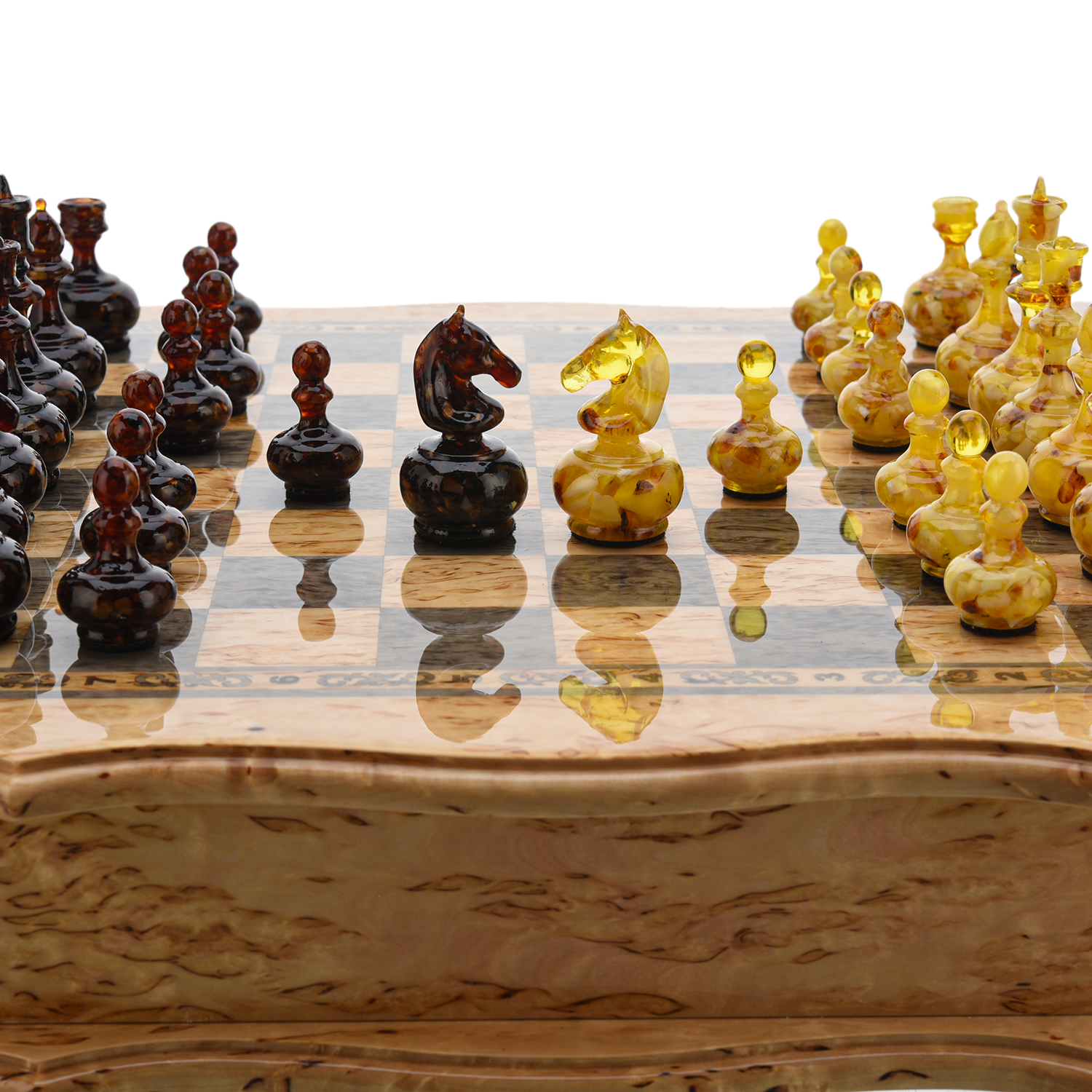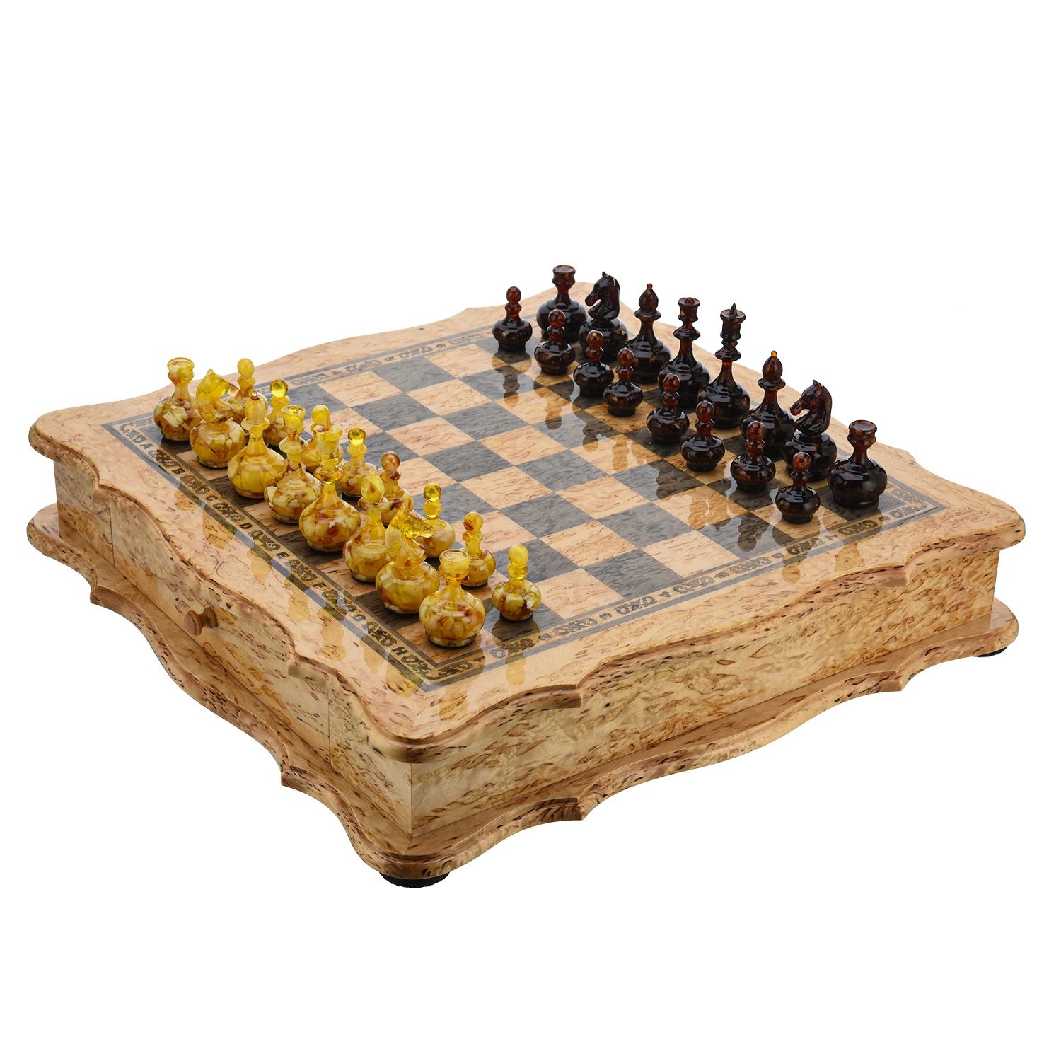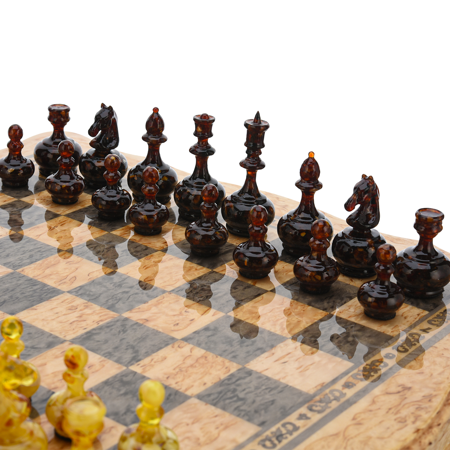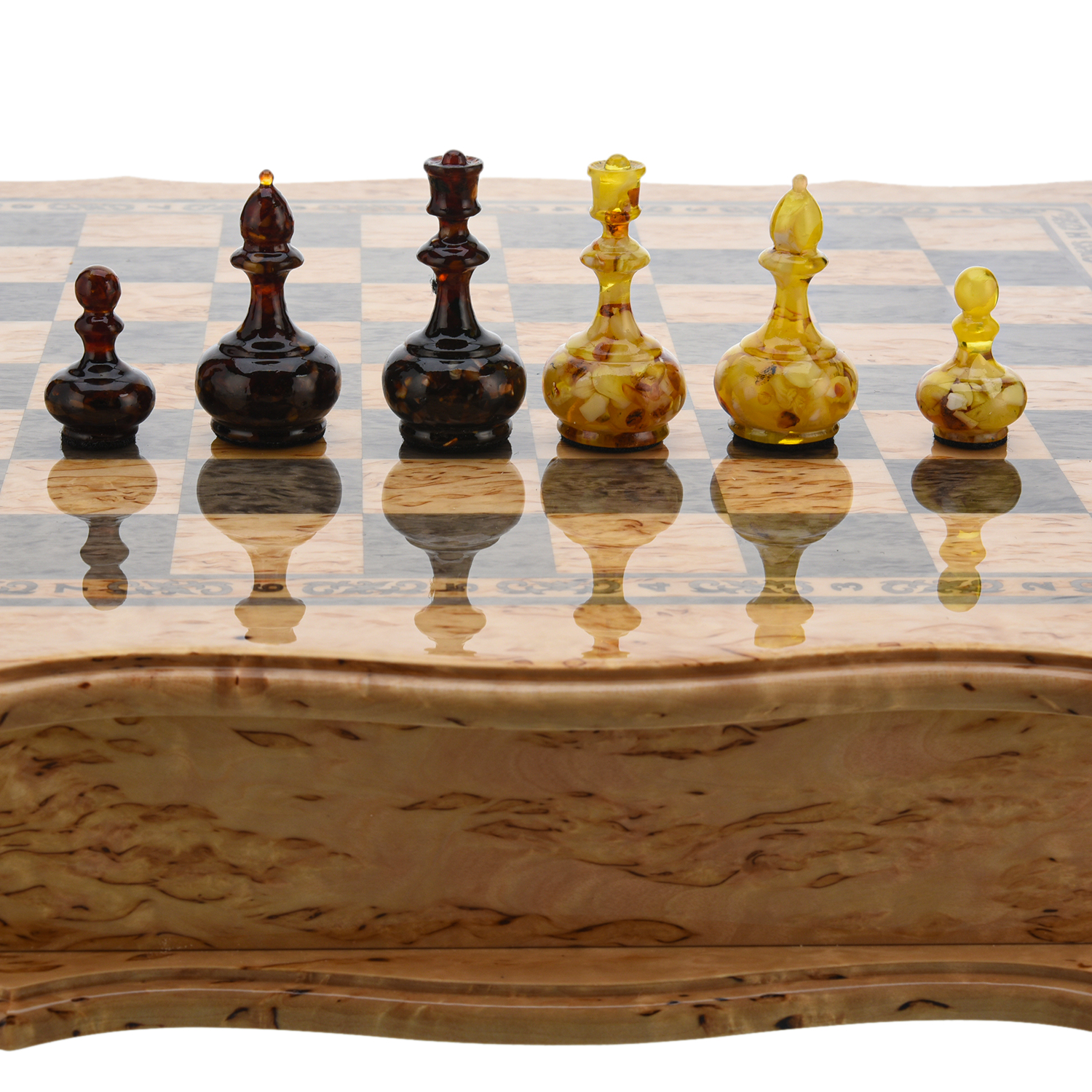 Шахматы из карельской березы с фигурами из янтаря 53х53 см