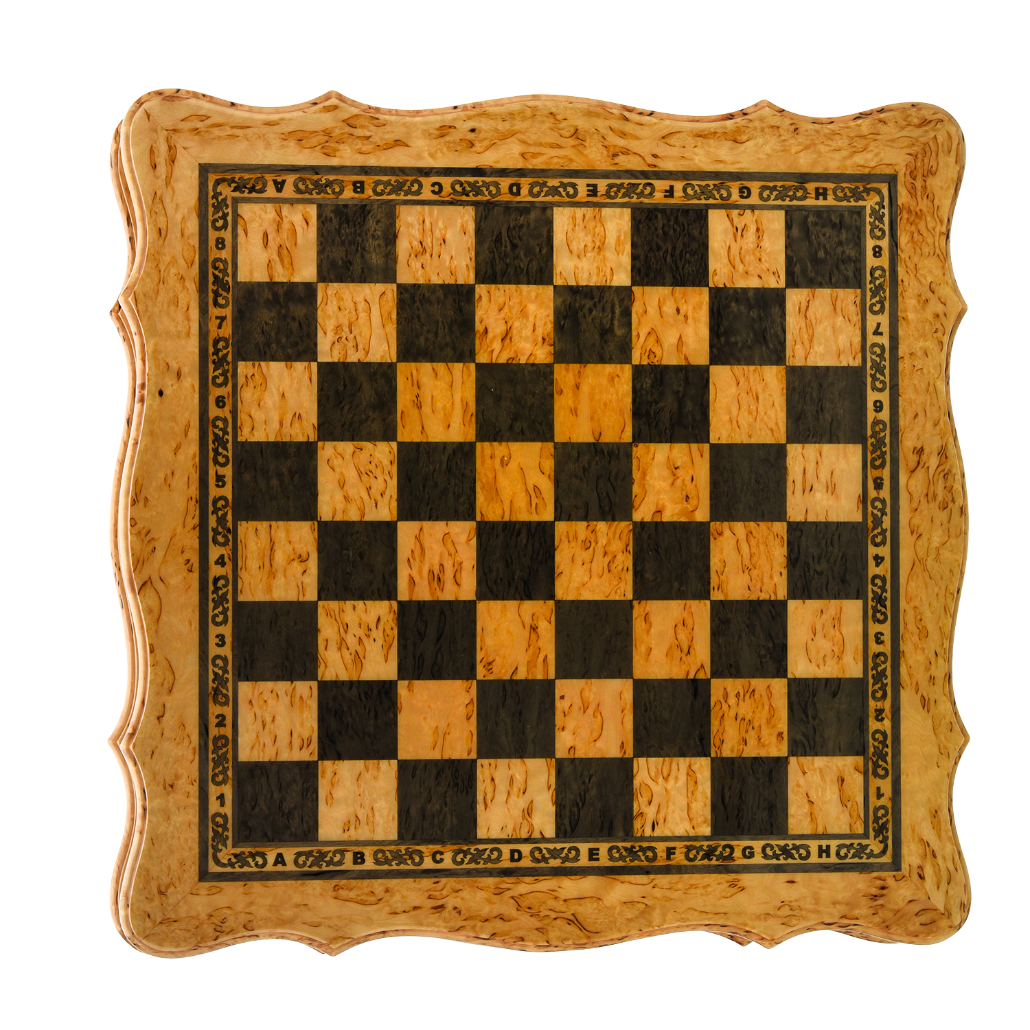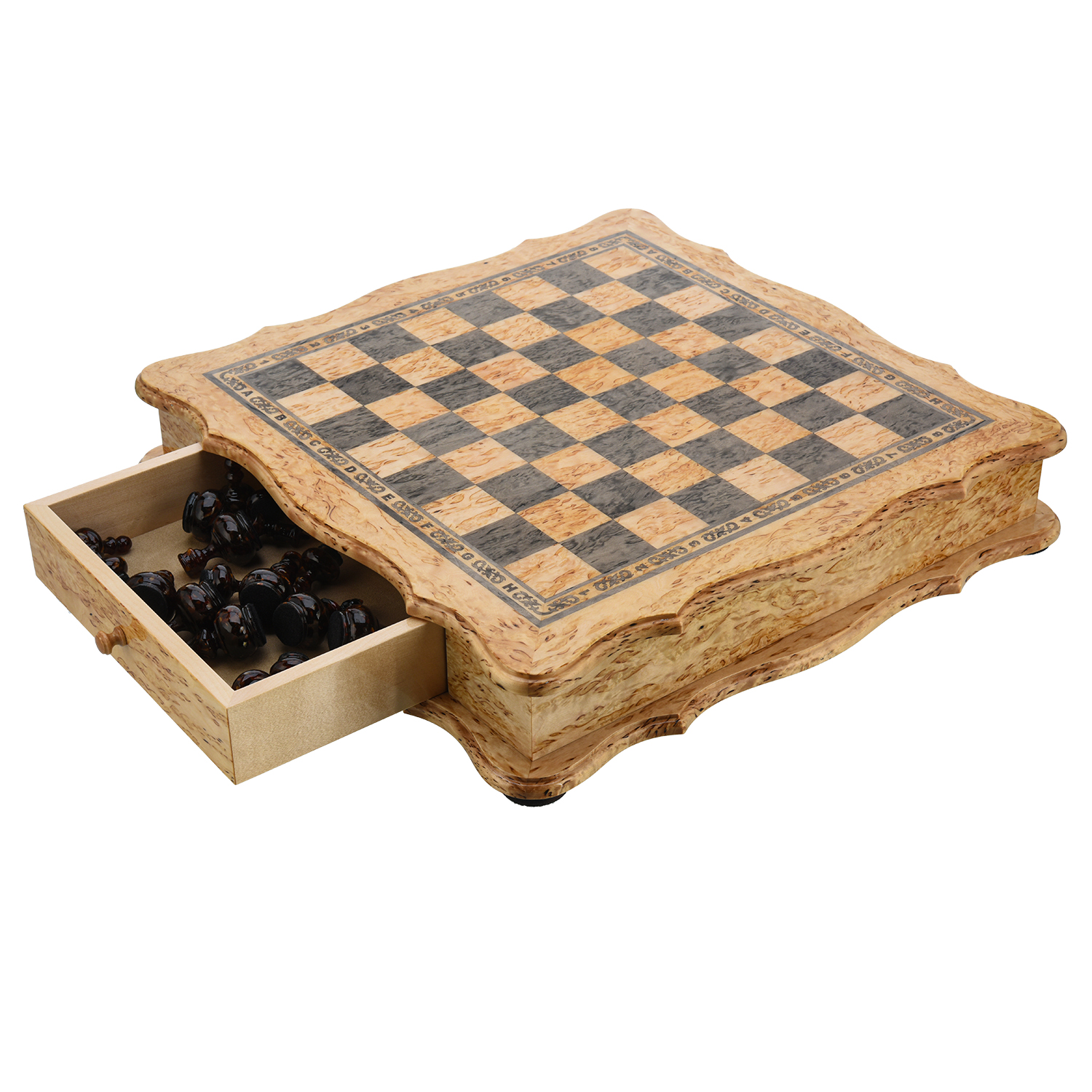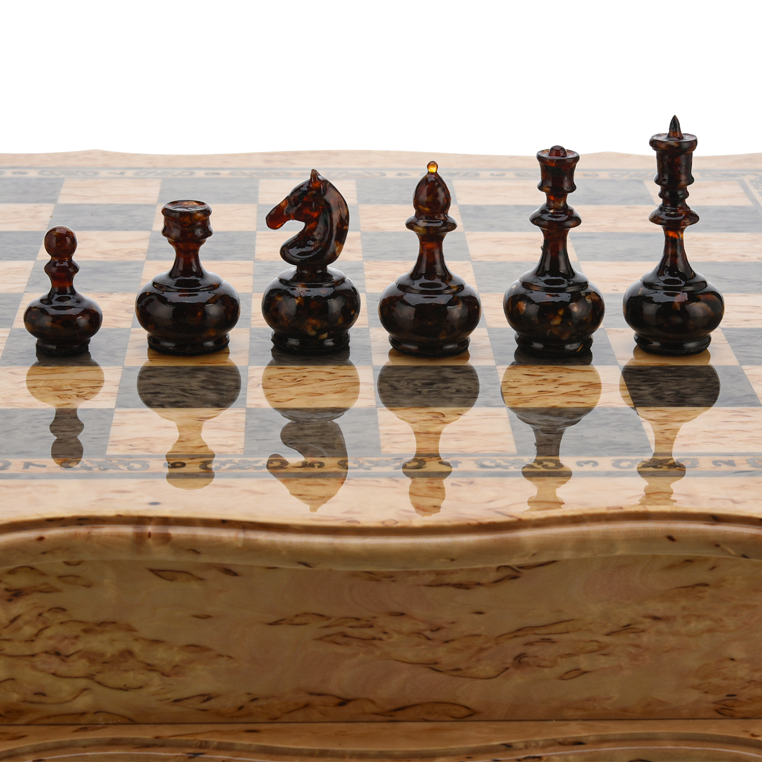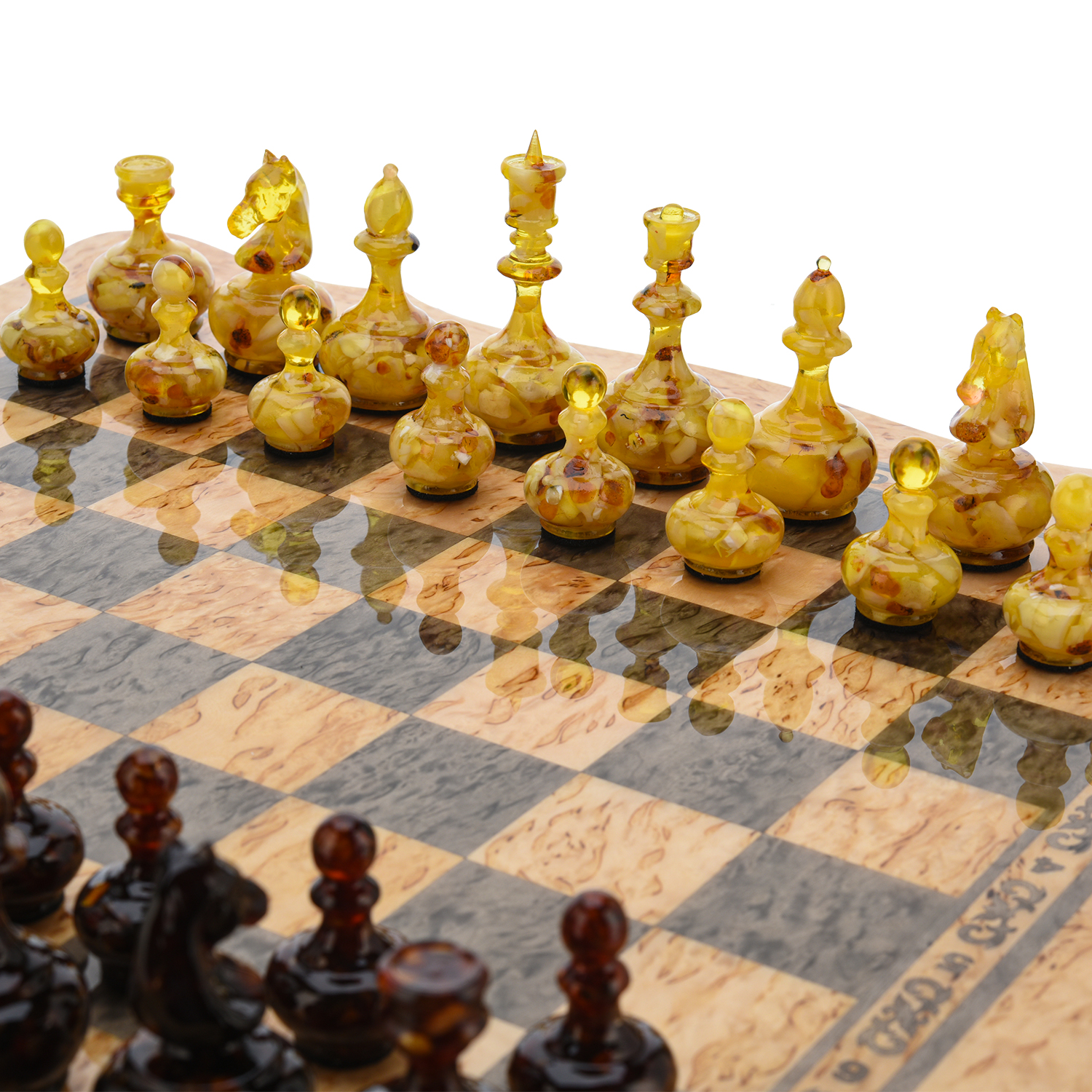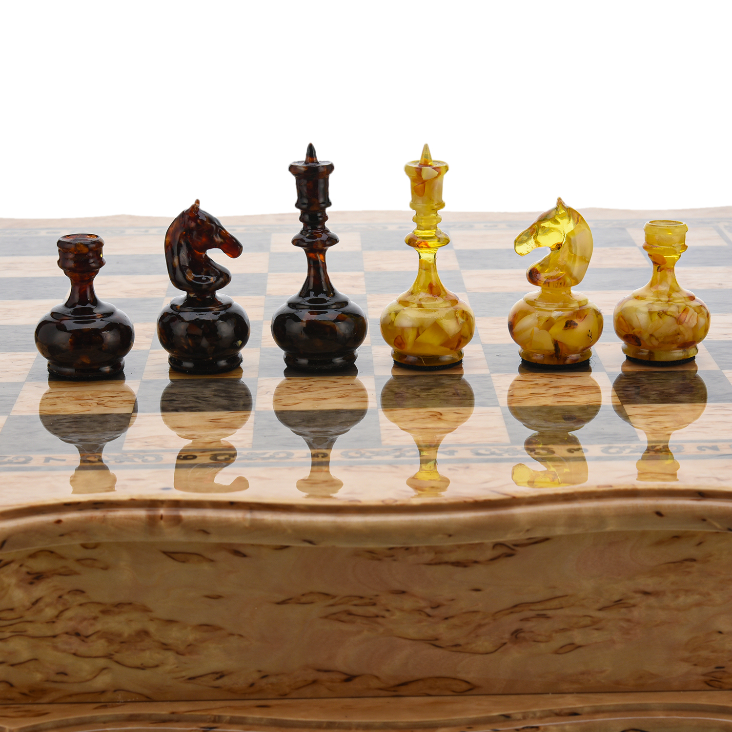Шахматы из карельской березы с фигурами из янтаря 53х53 см