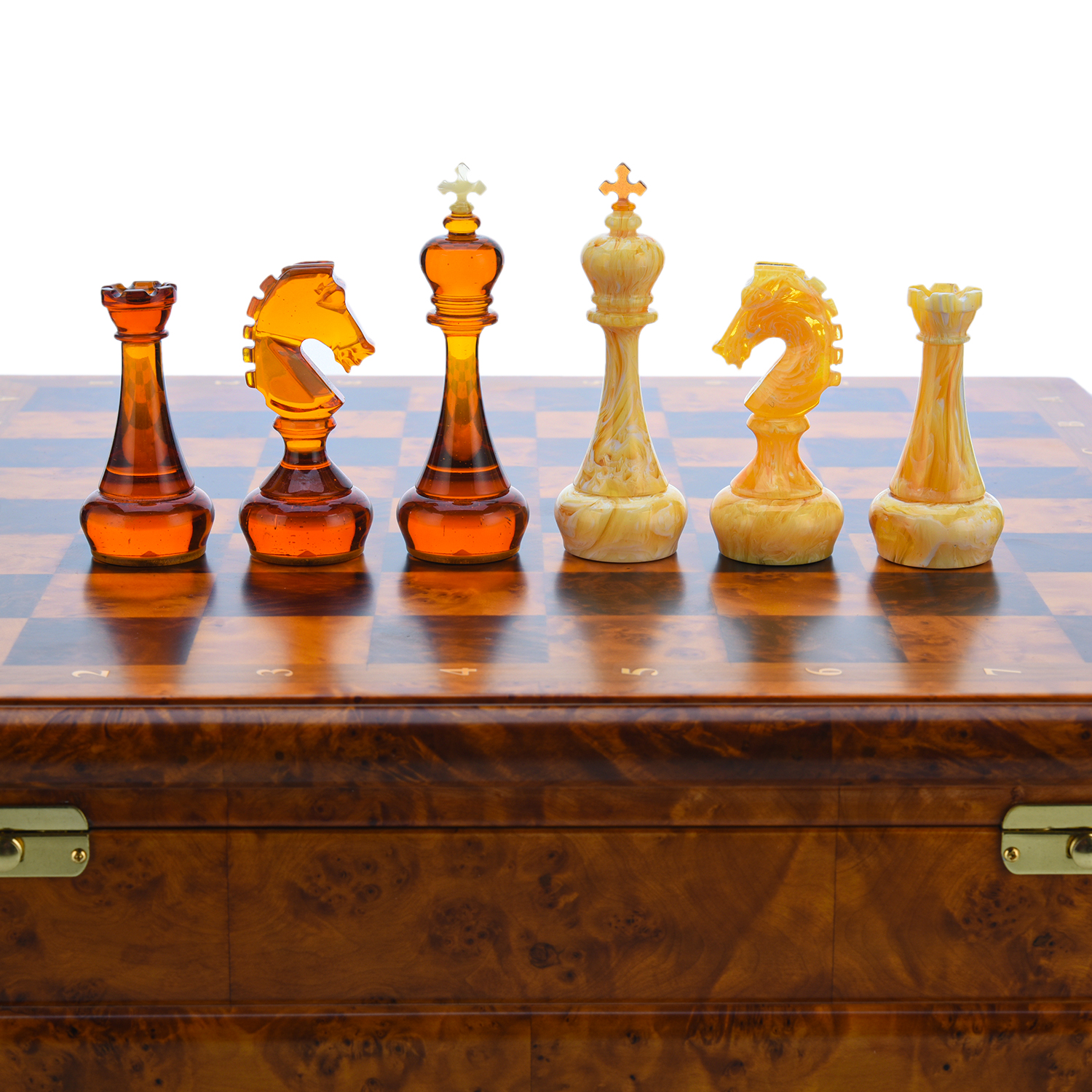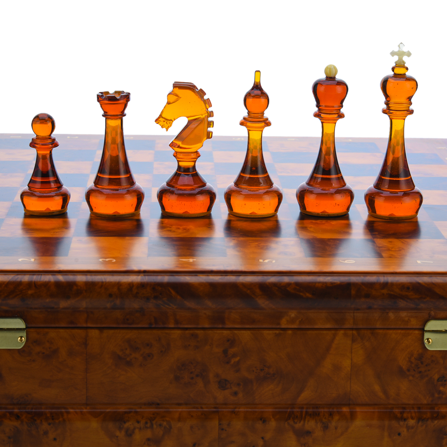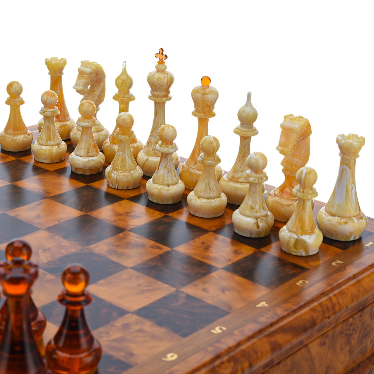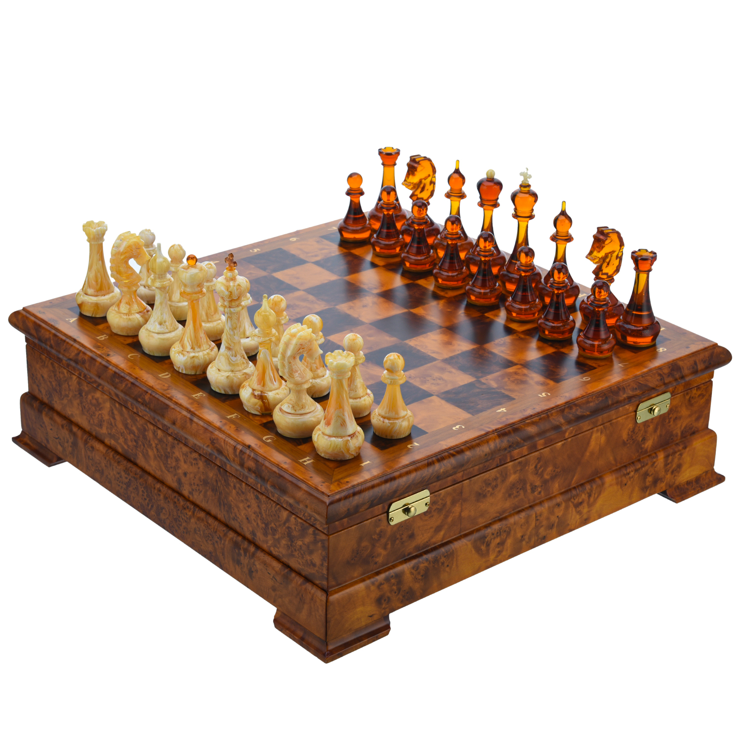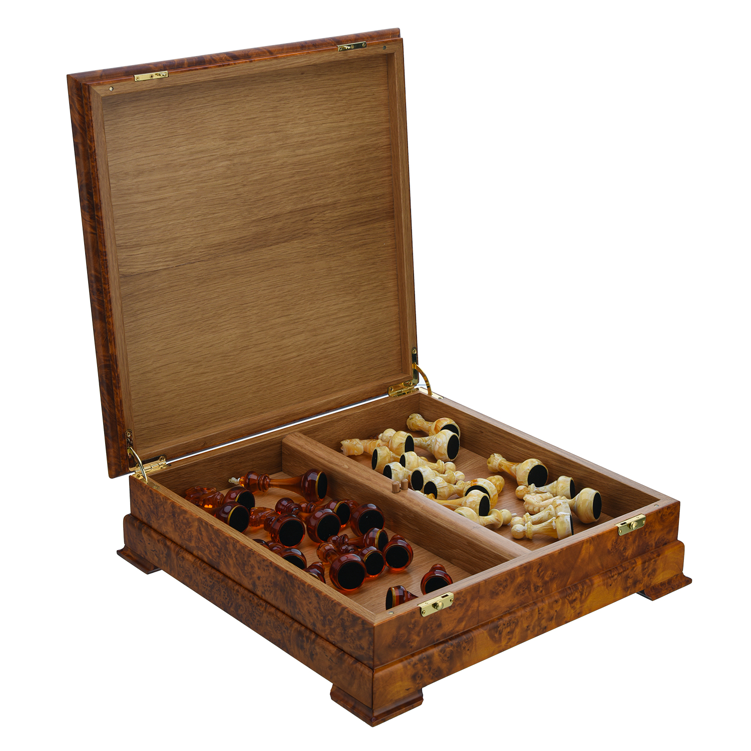 Шахматный ларец из капа с фигурами из янтаря 38х38 см