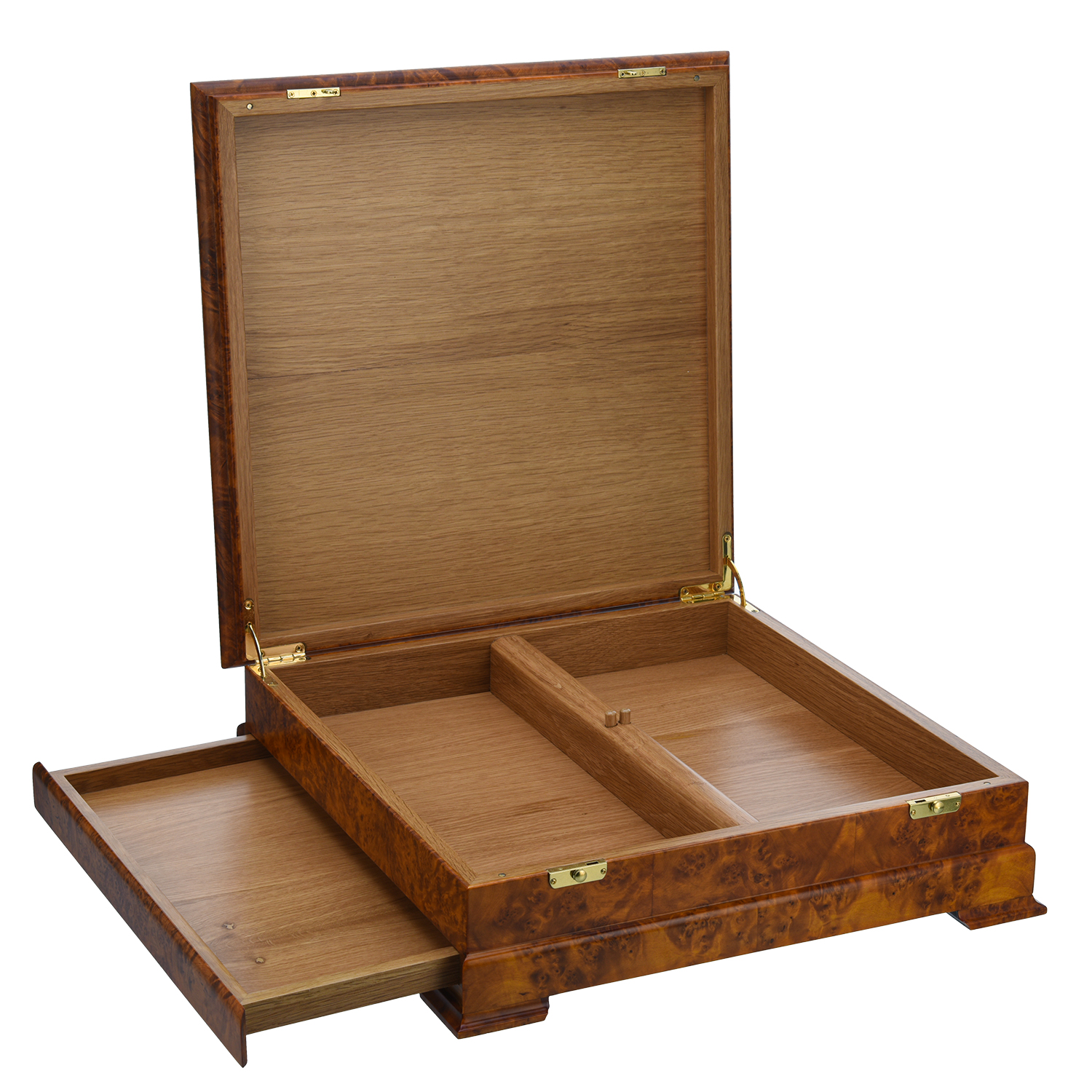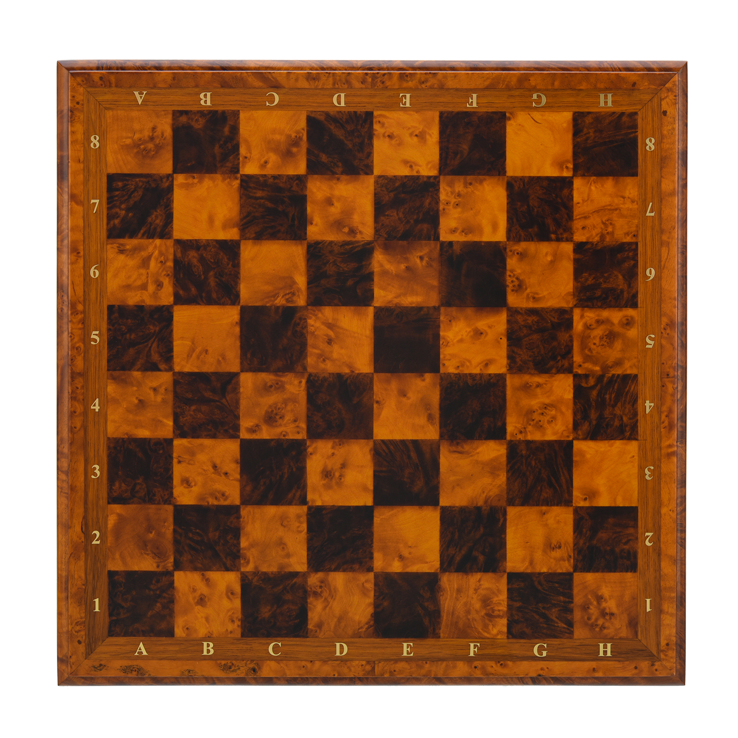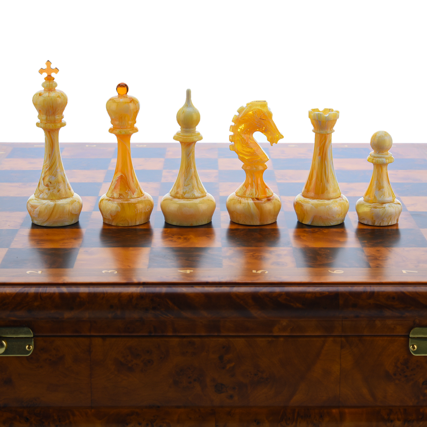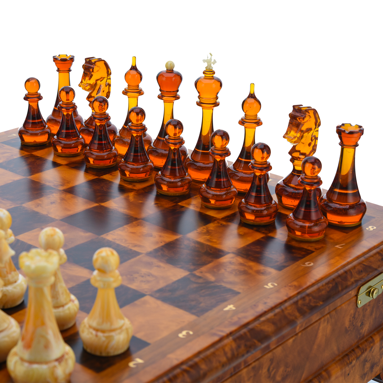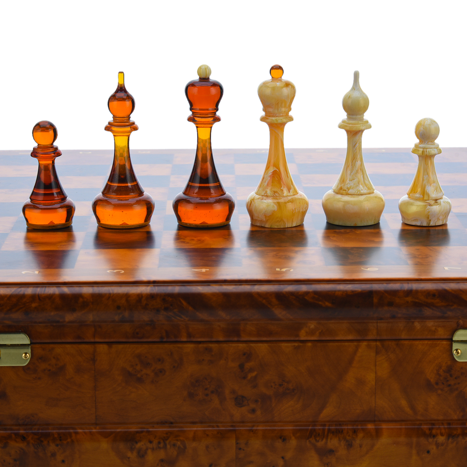 Шахматный ларец из капа с фигурами из янтаря 38х38 см