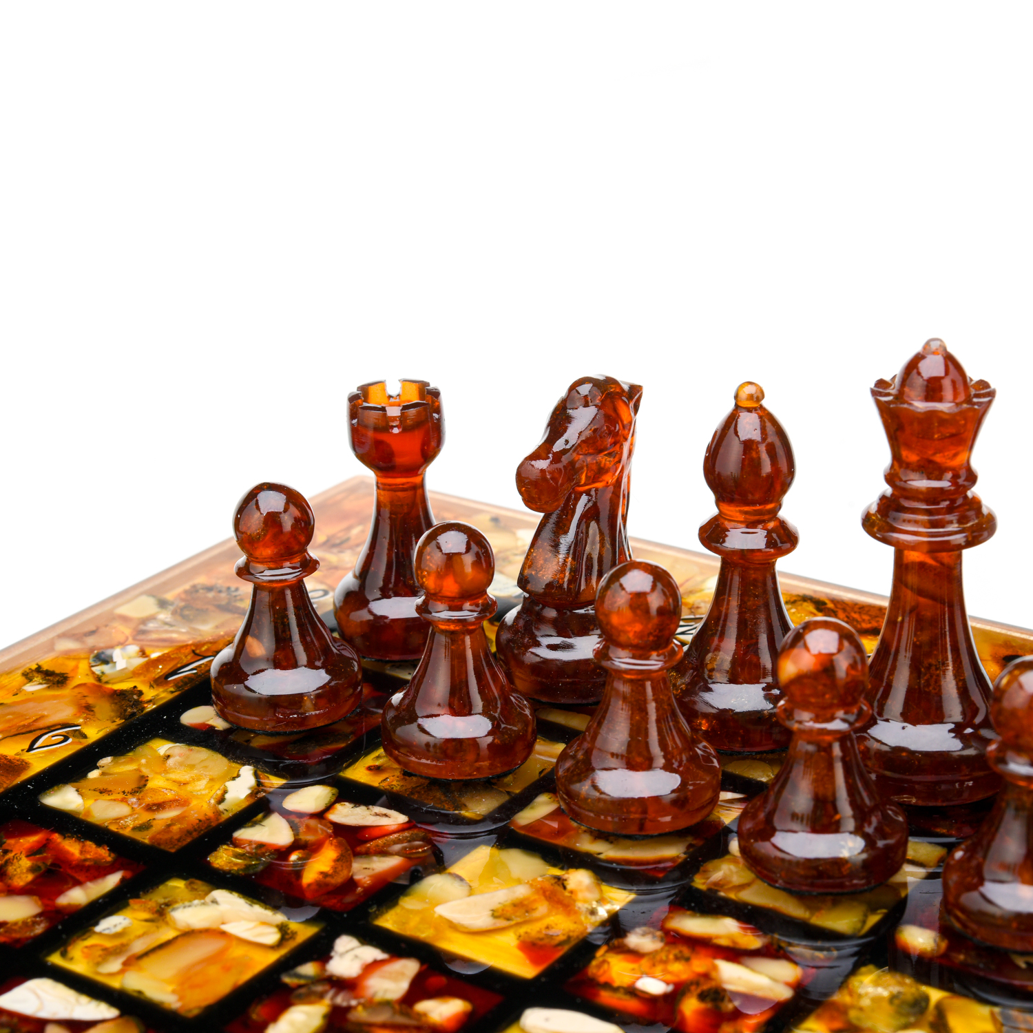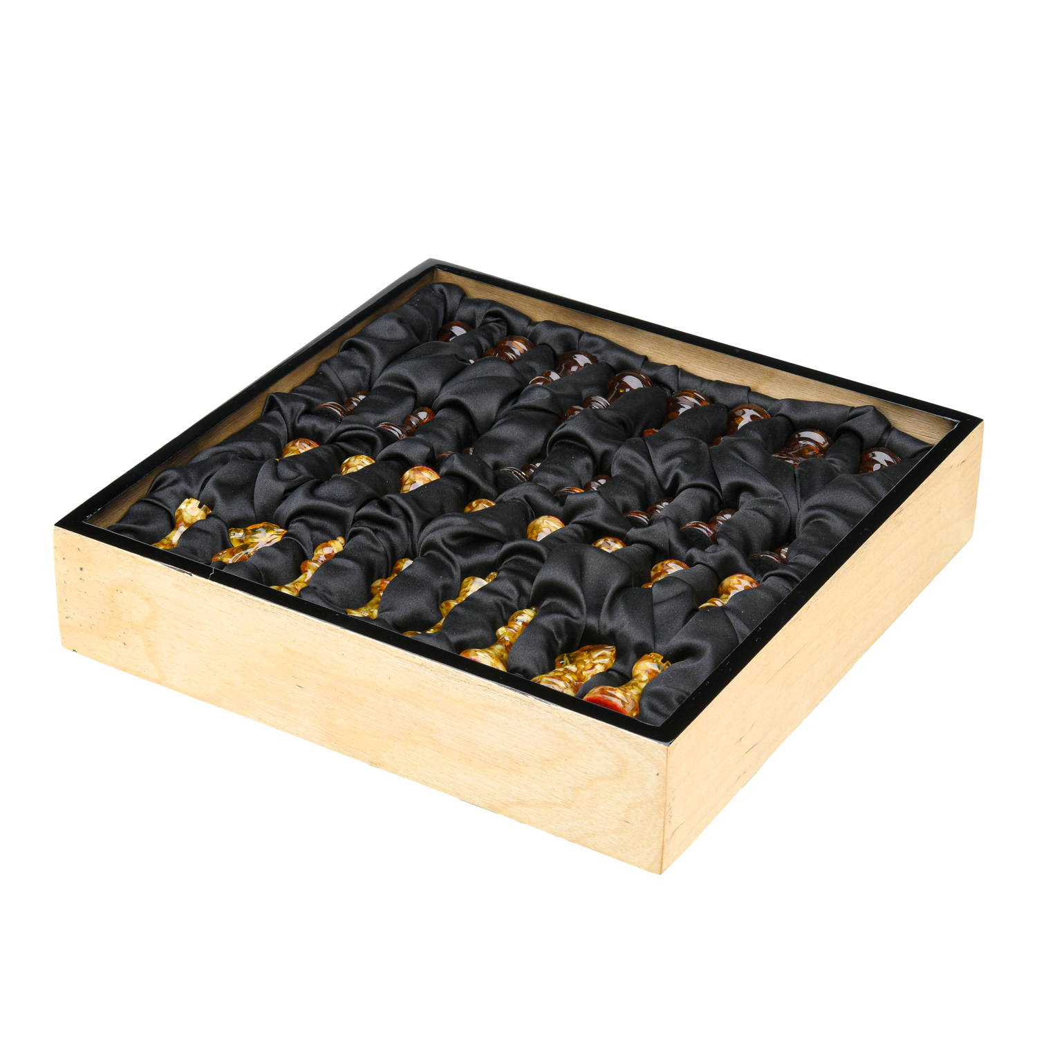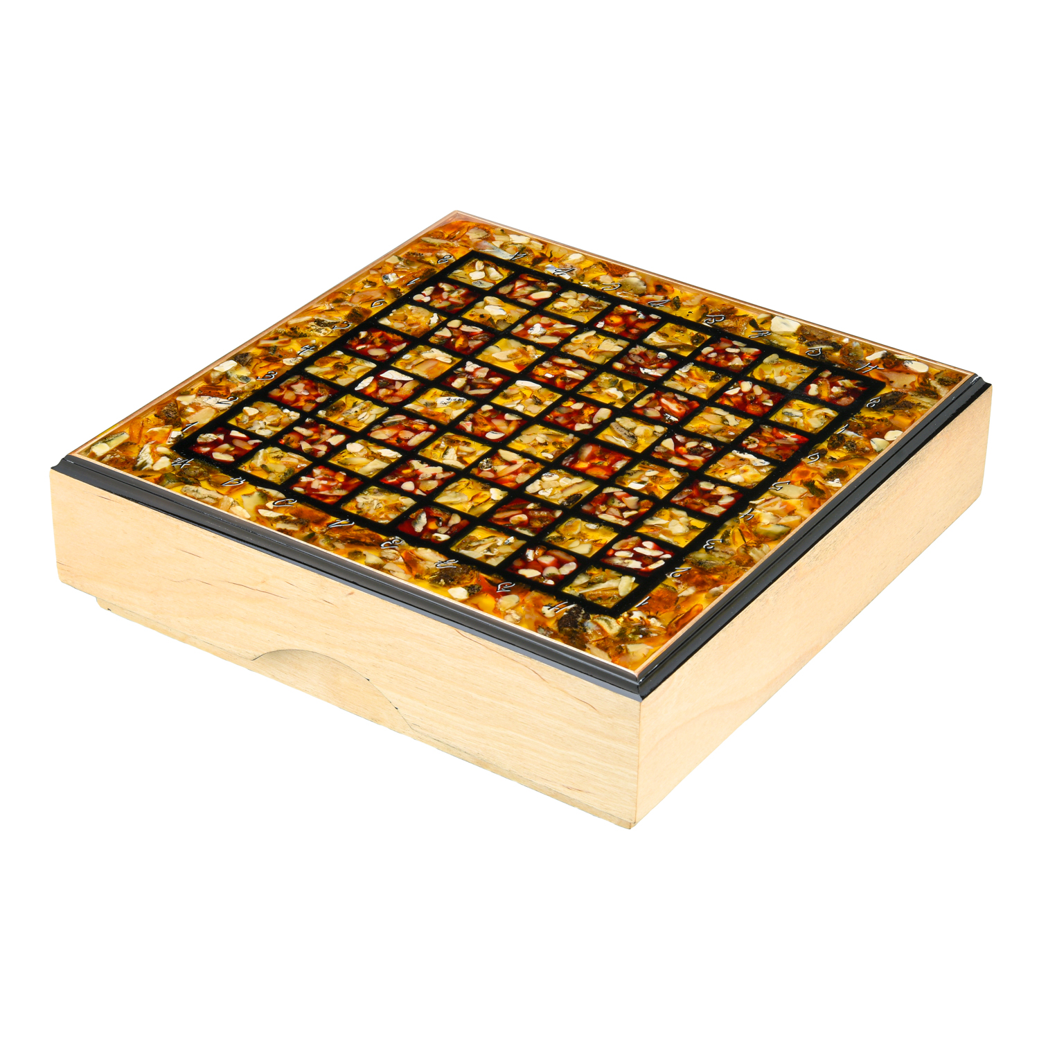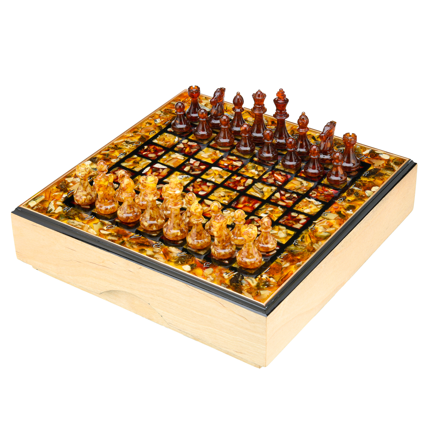 Шахматный ларец с инкрустацией и фигурами из янтаря 30х30 см