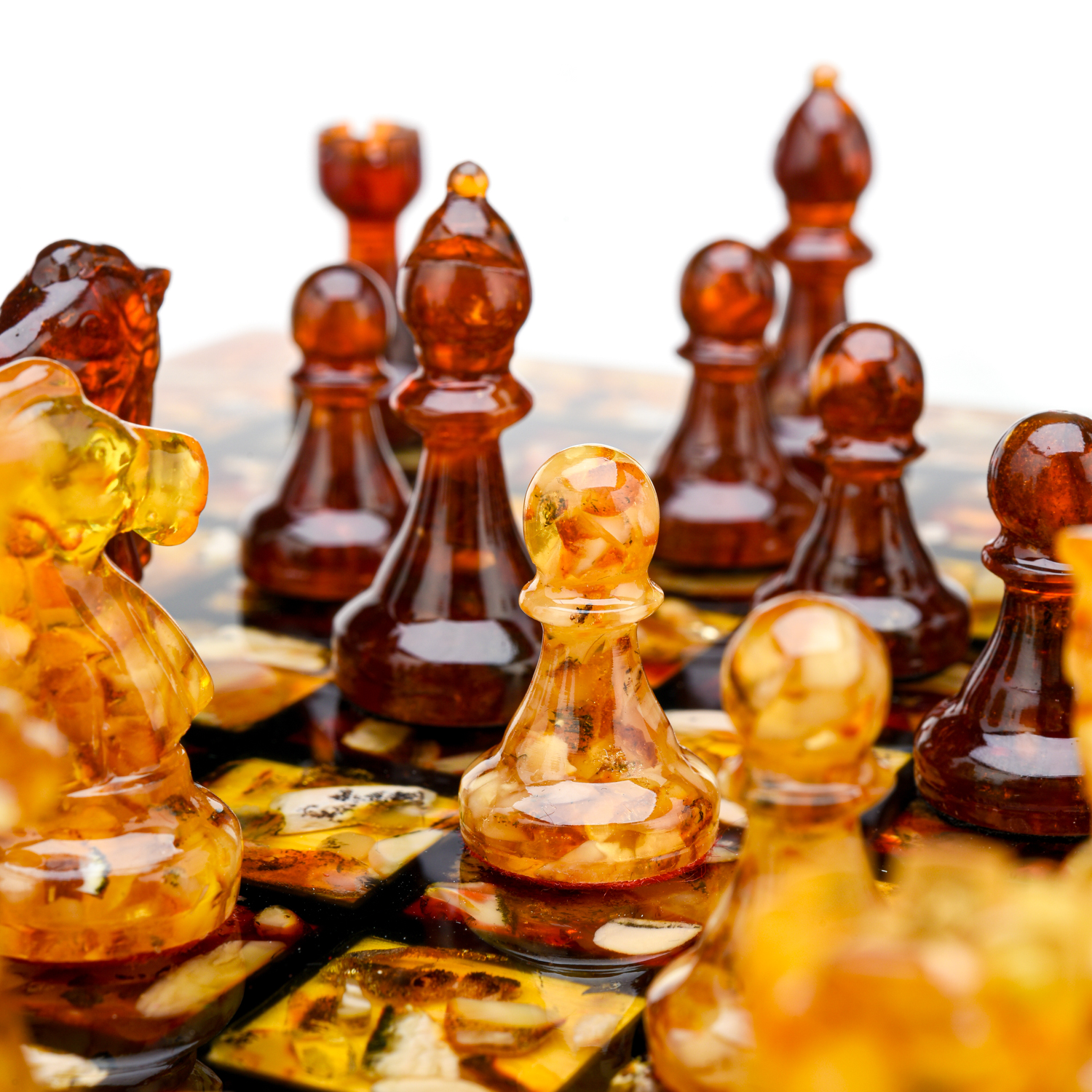 Шахматный ларец с инкрустацией и фигурами из янтаря.Материалы: дерево, янтарь, полиэфирная смола.