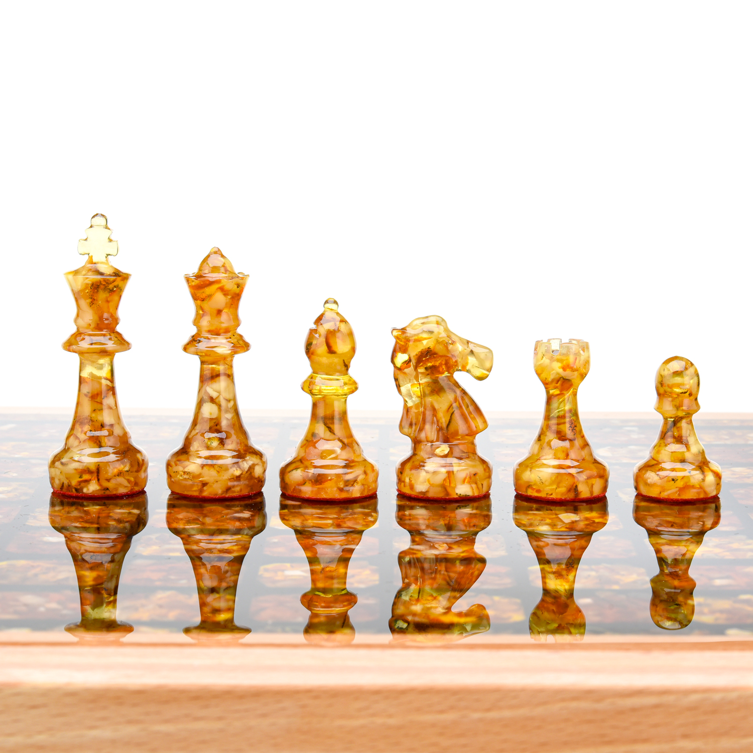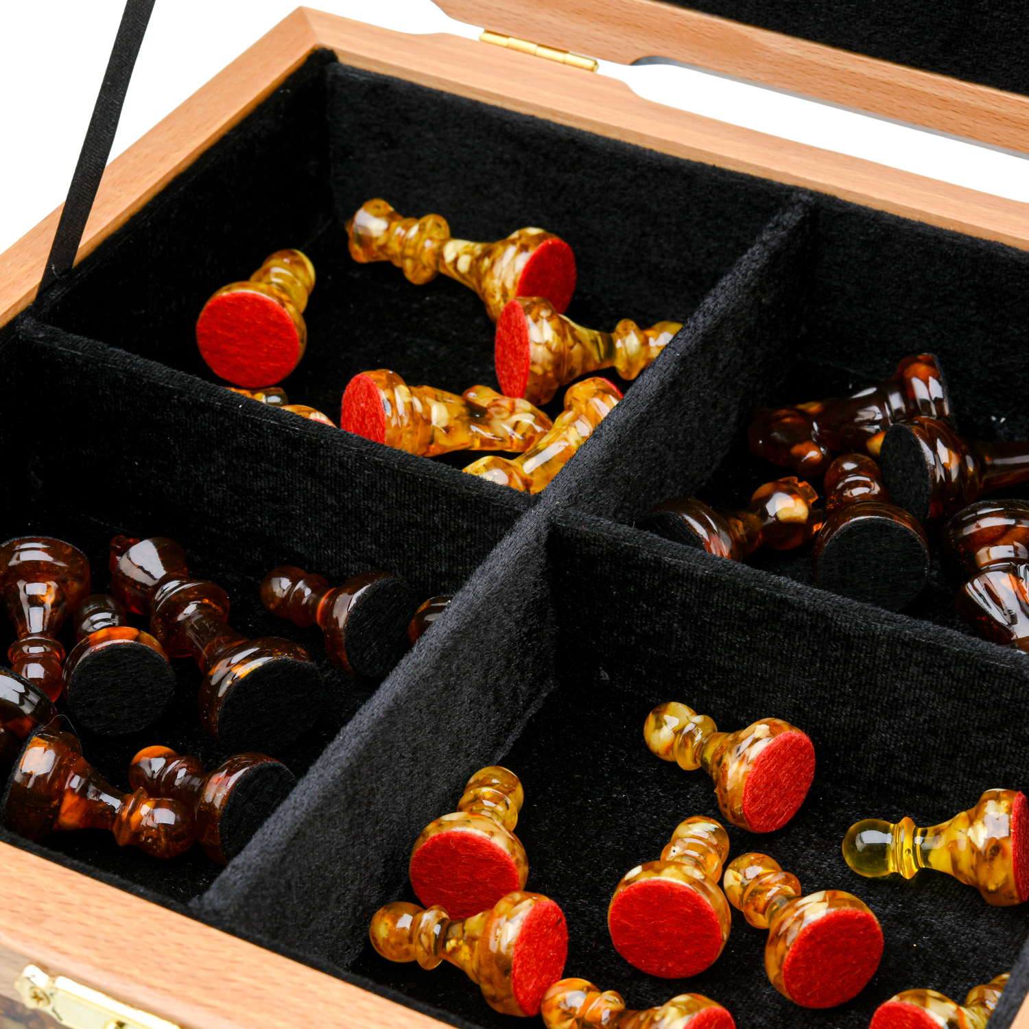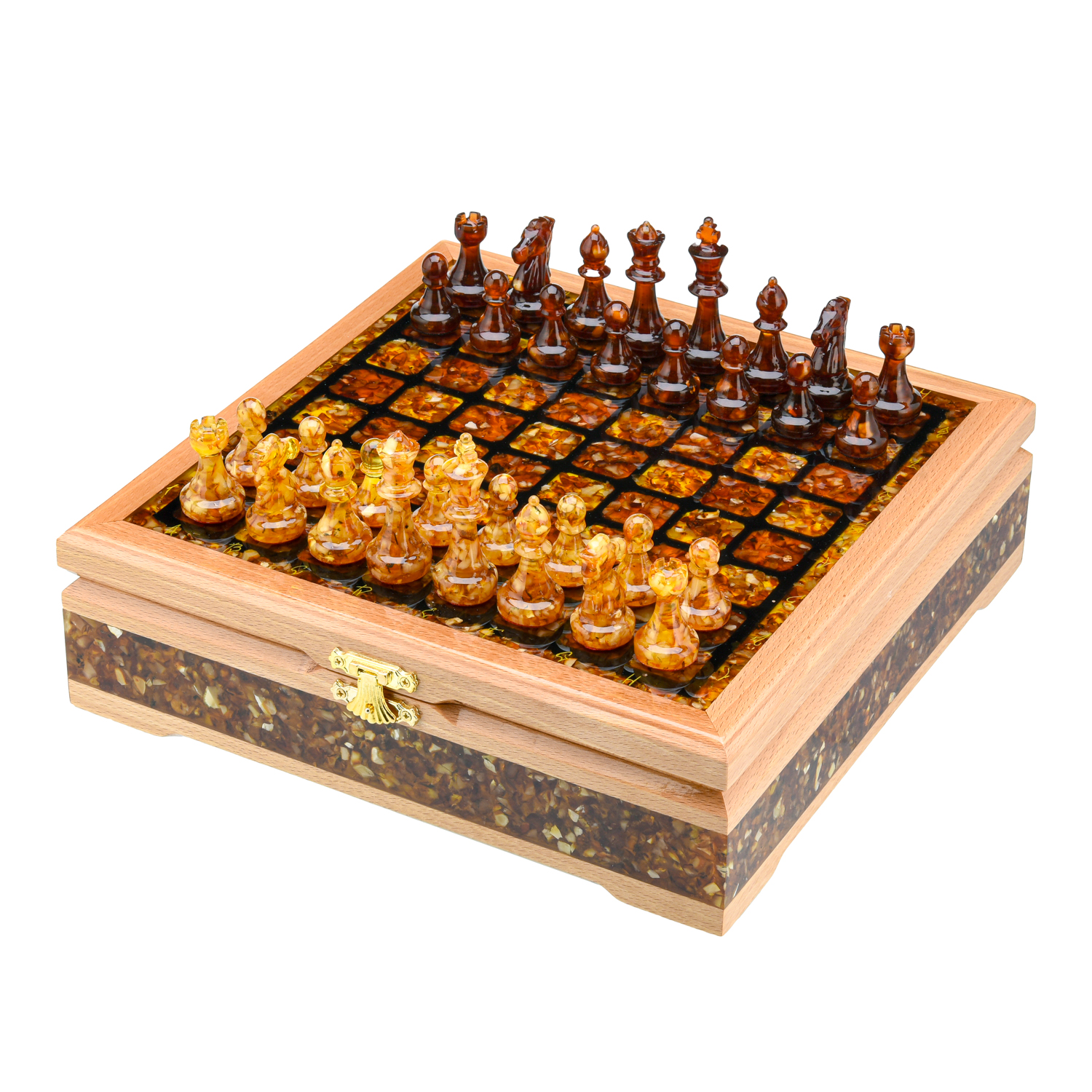 Шахматный ларец с инкрустацией и фигурами из янтаря 28х28 см