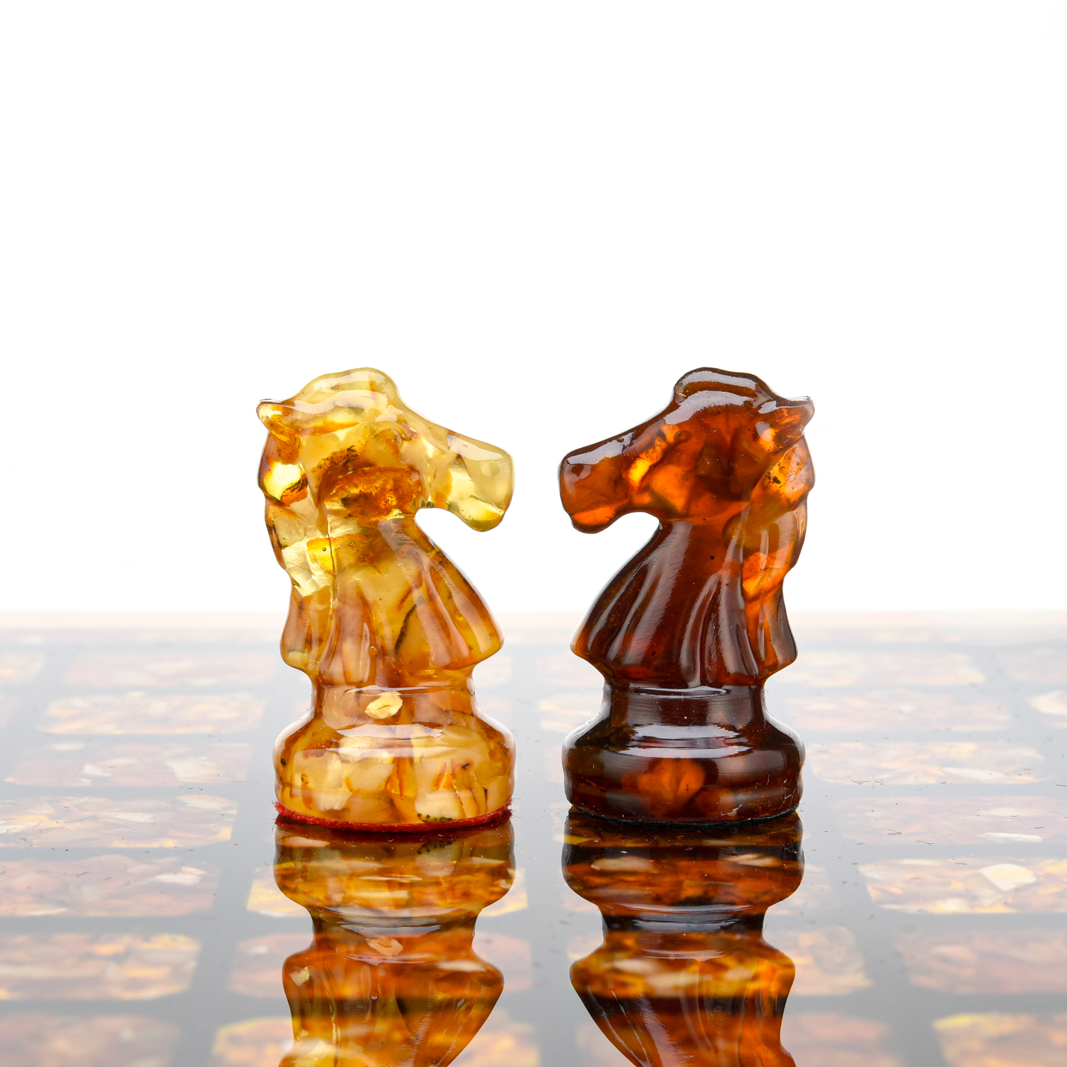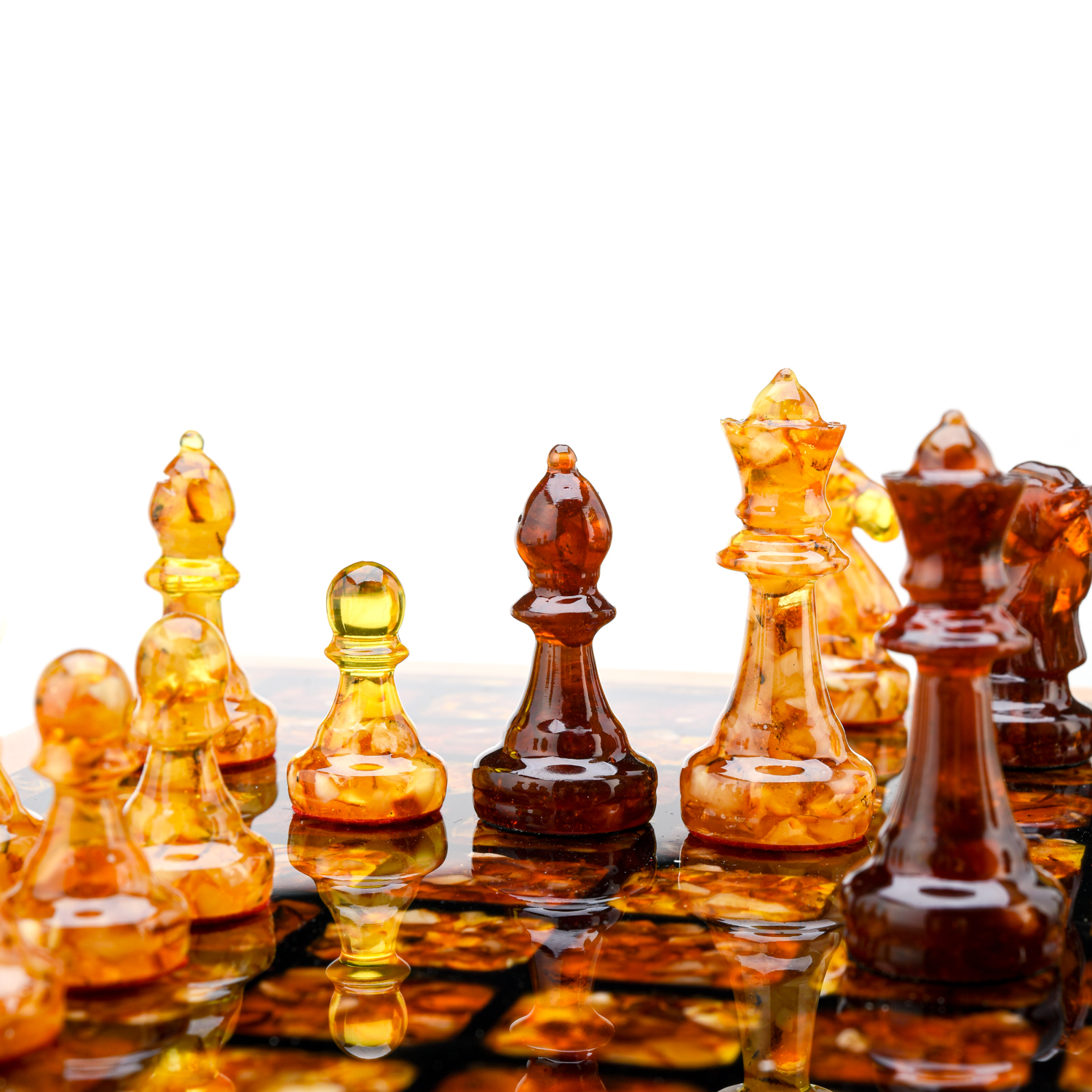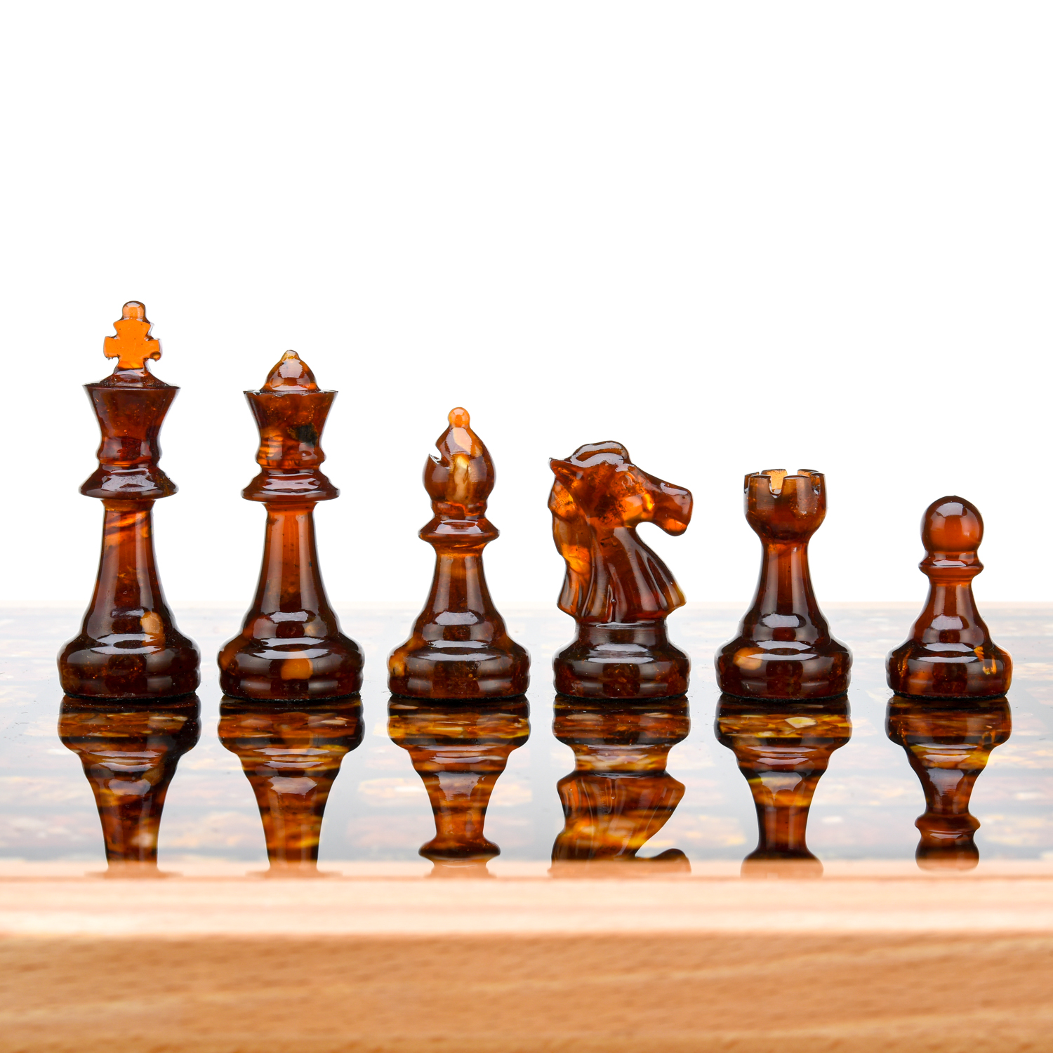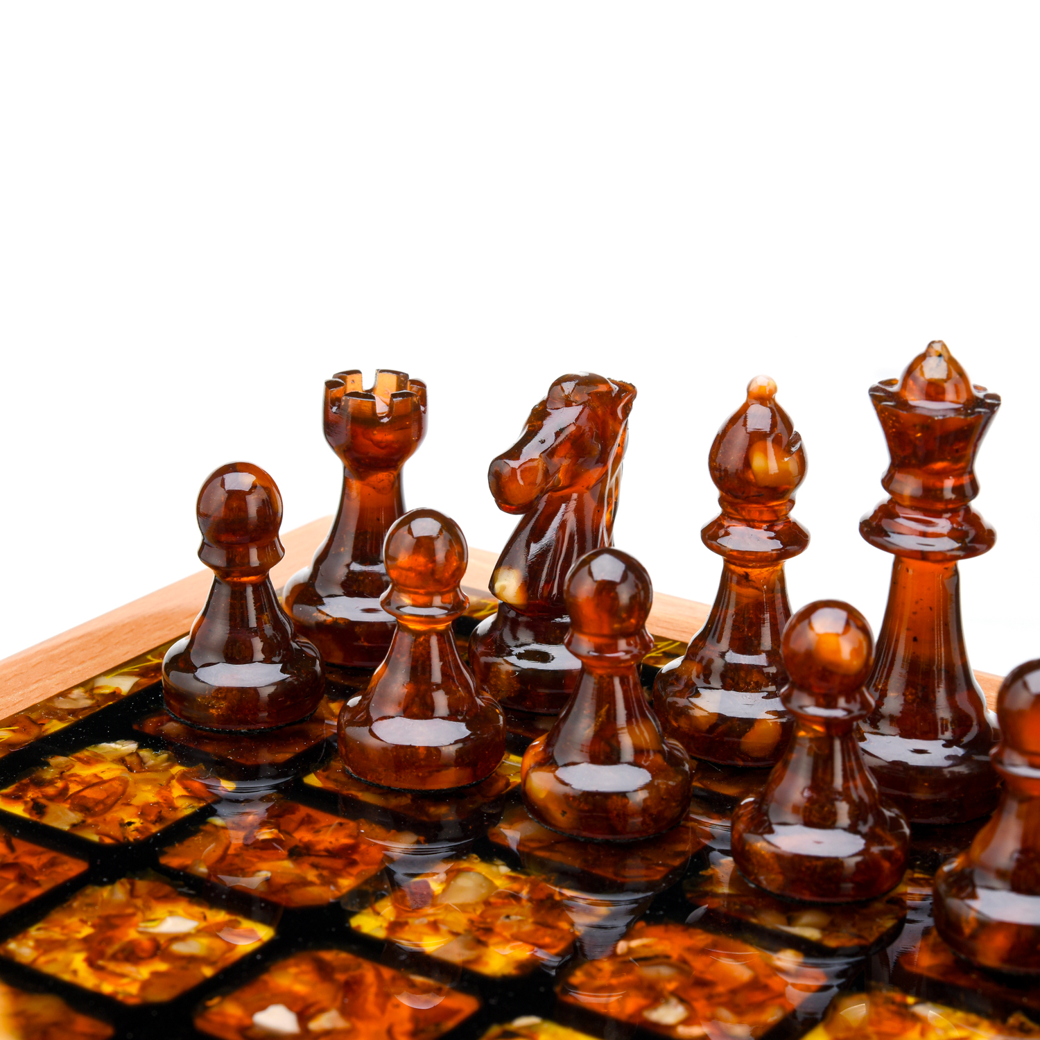 Шахматный ларец с инкрустацией и фигурами из янтаря 28х28 см