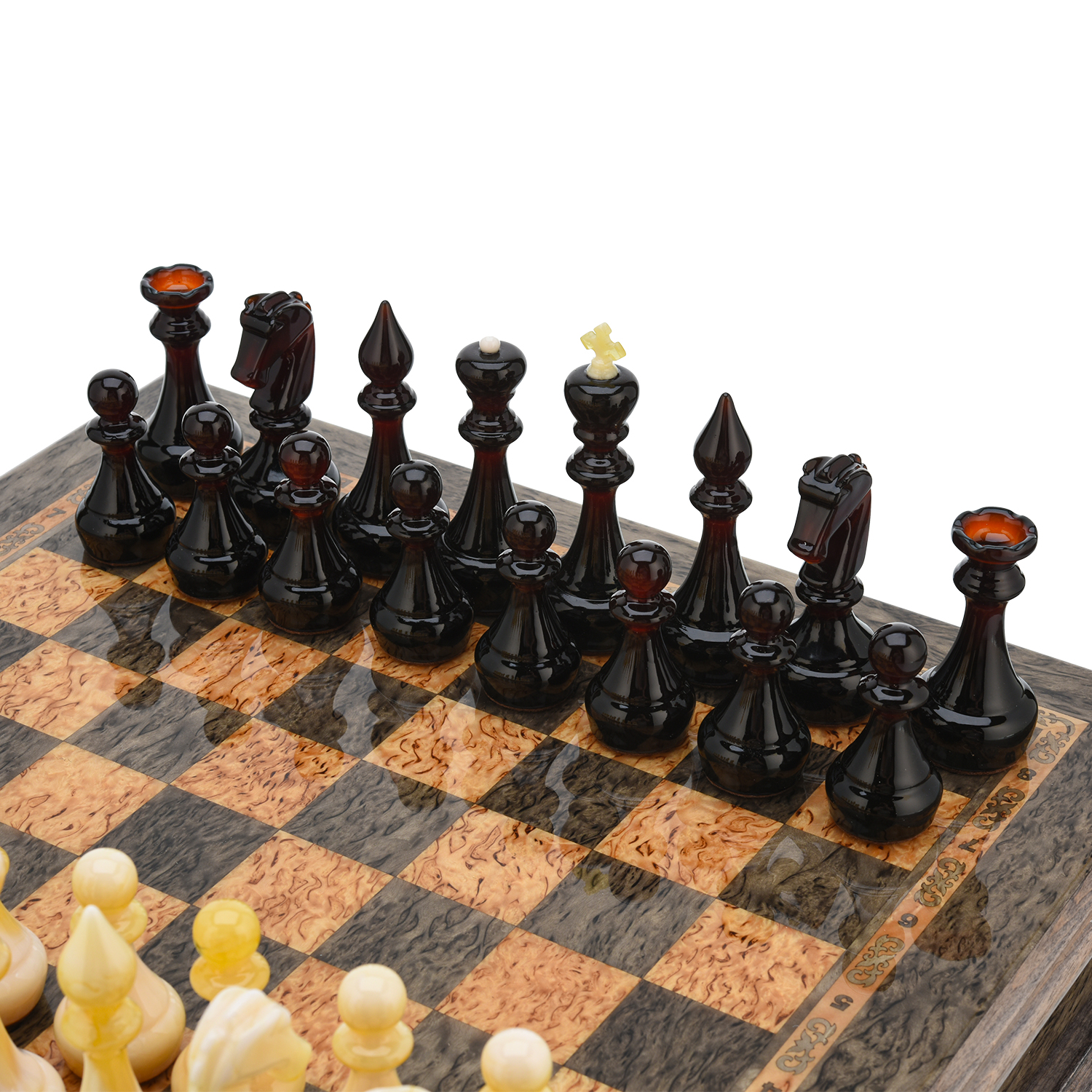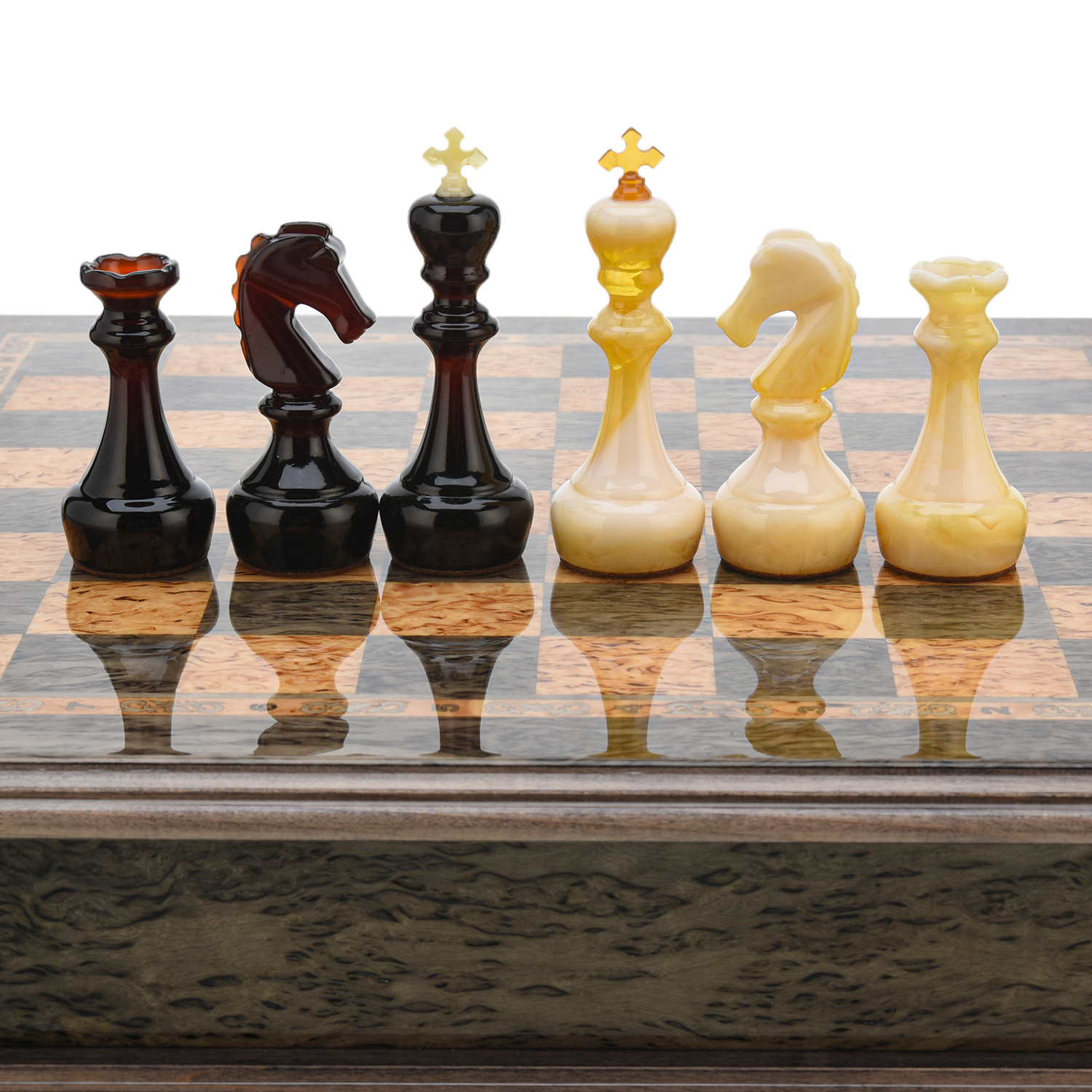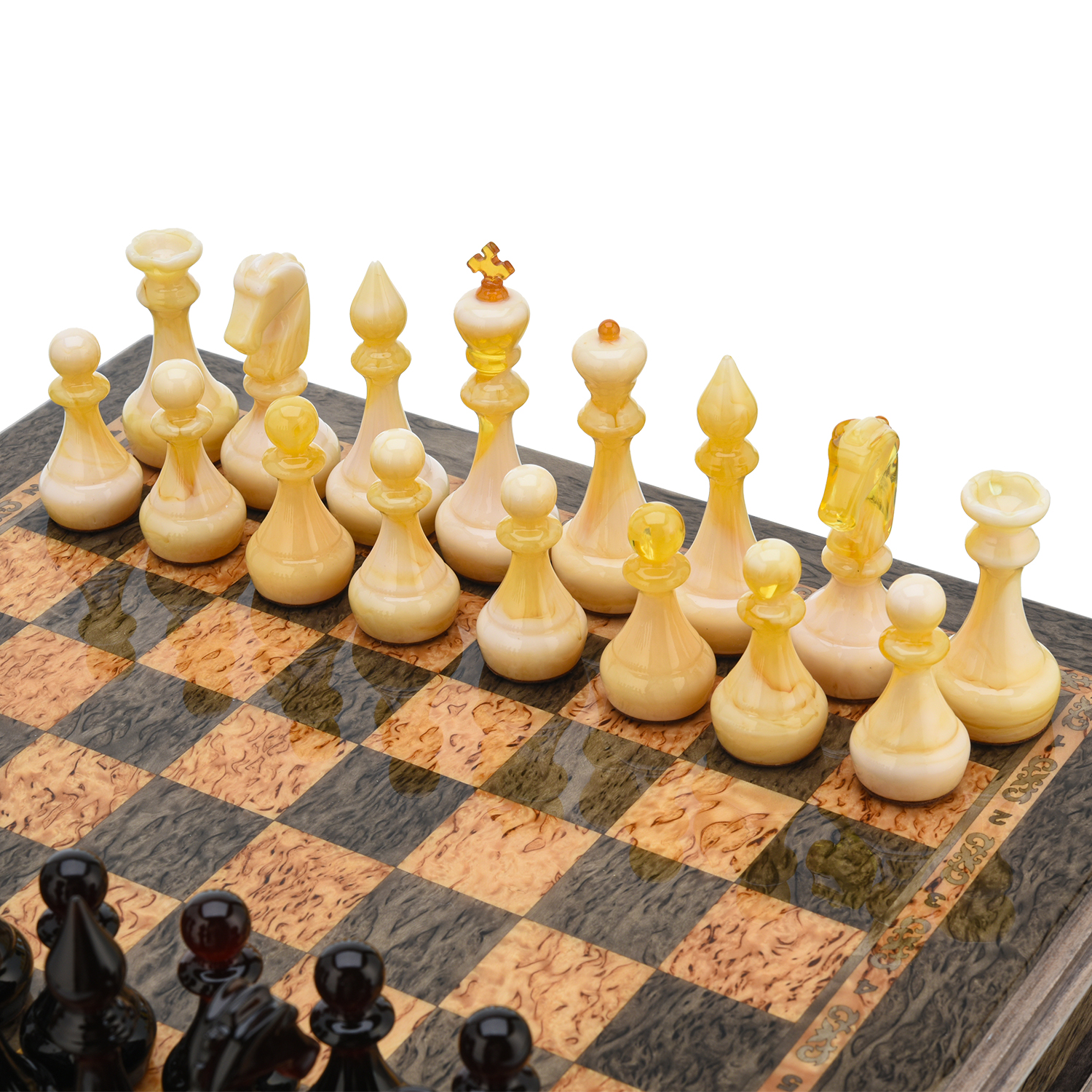 Шахматы из карельской березы с янтарными фигурами 38х38 см