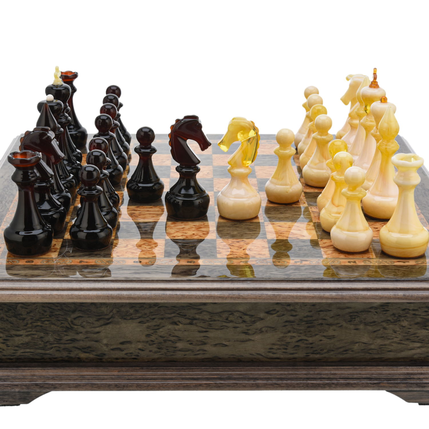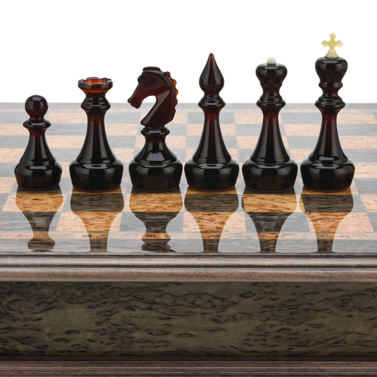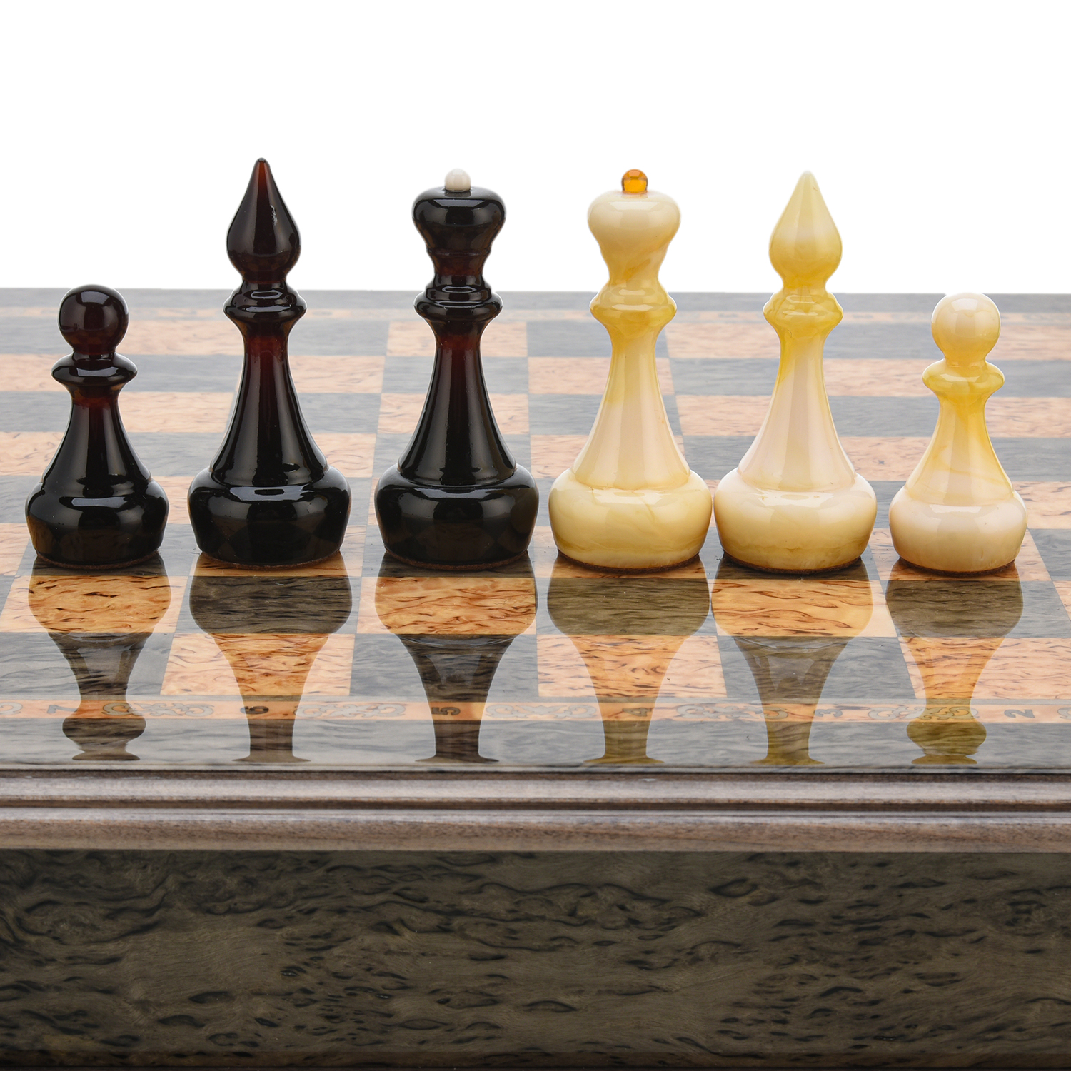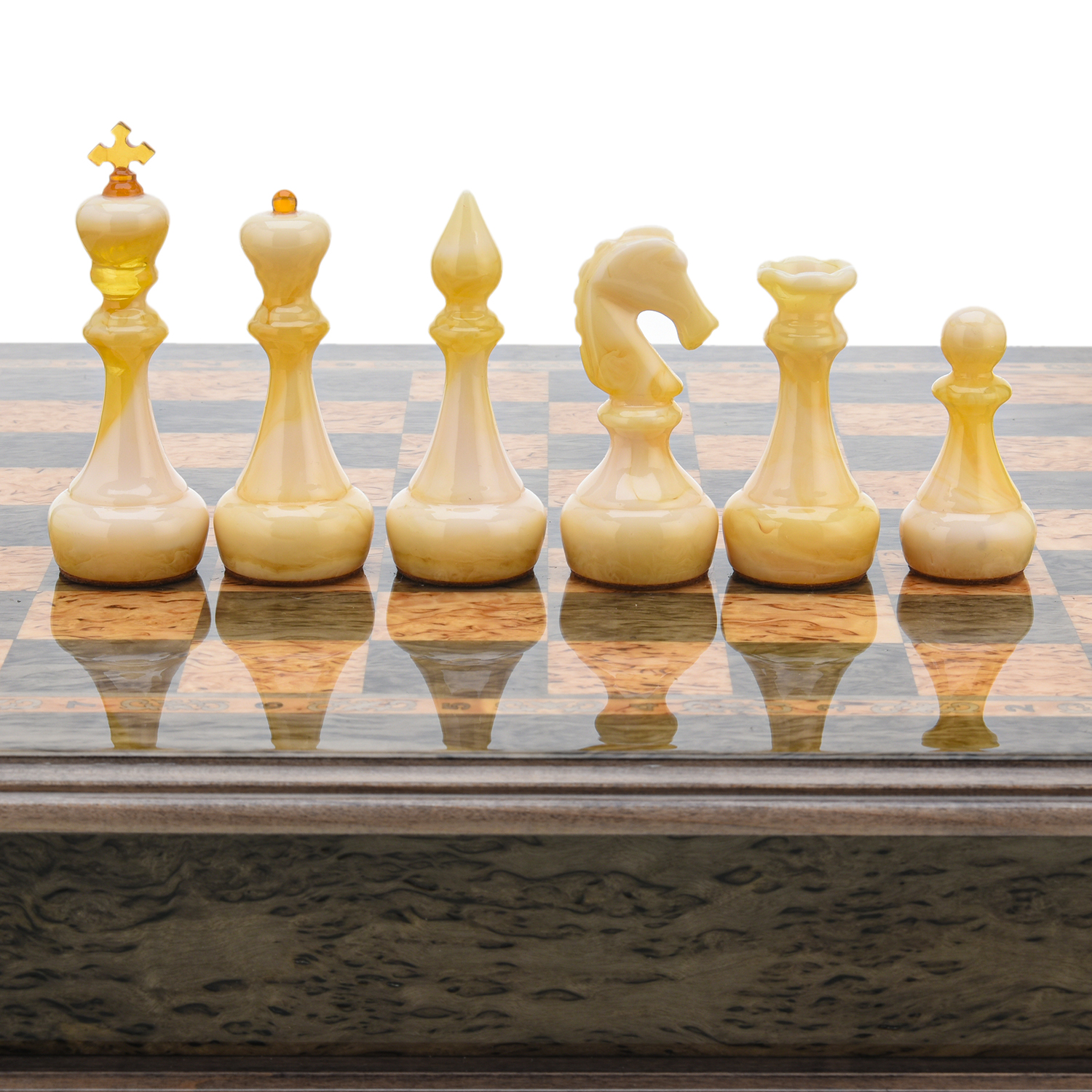Шахматы из карельской березы с янтарными фигурами 38х38 см