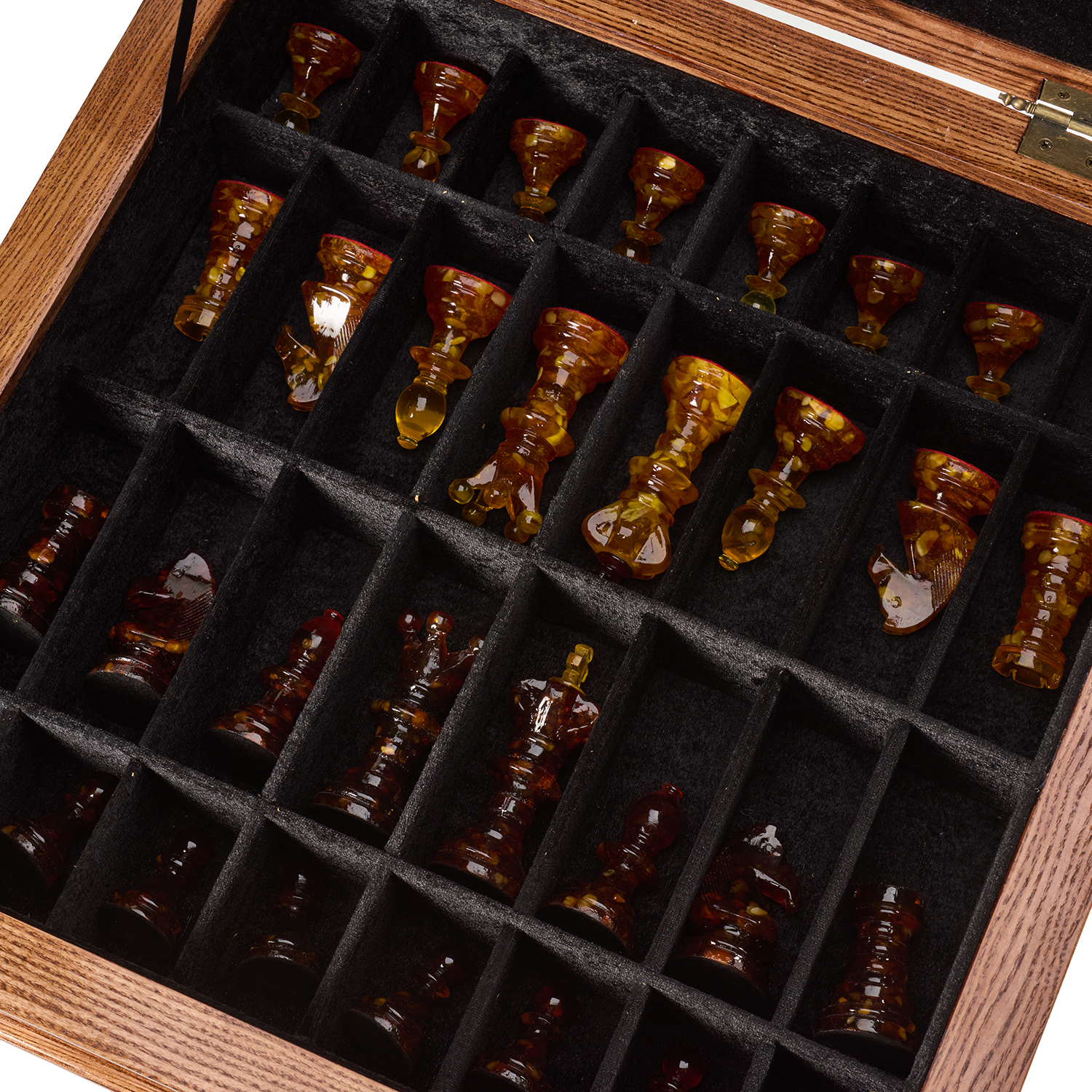 Шахматный ларец с инкрустацией и фигурами из янтаря.