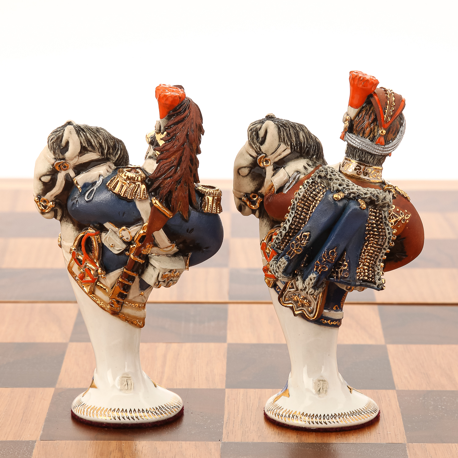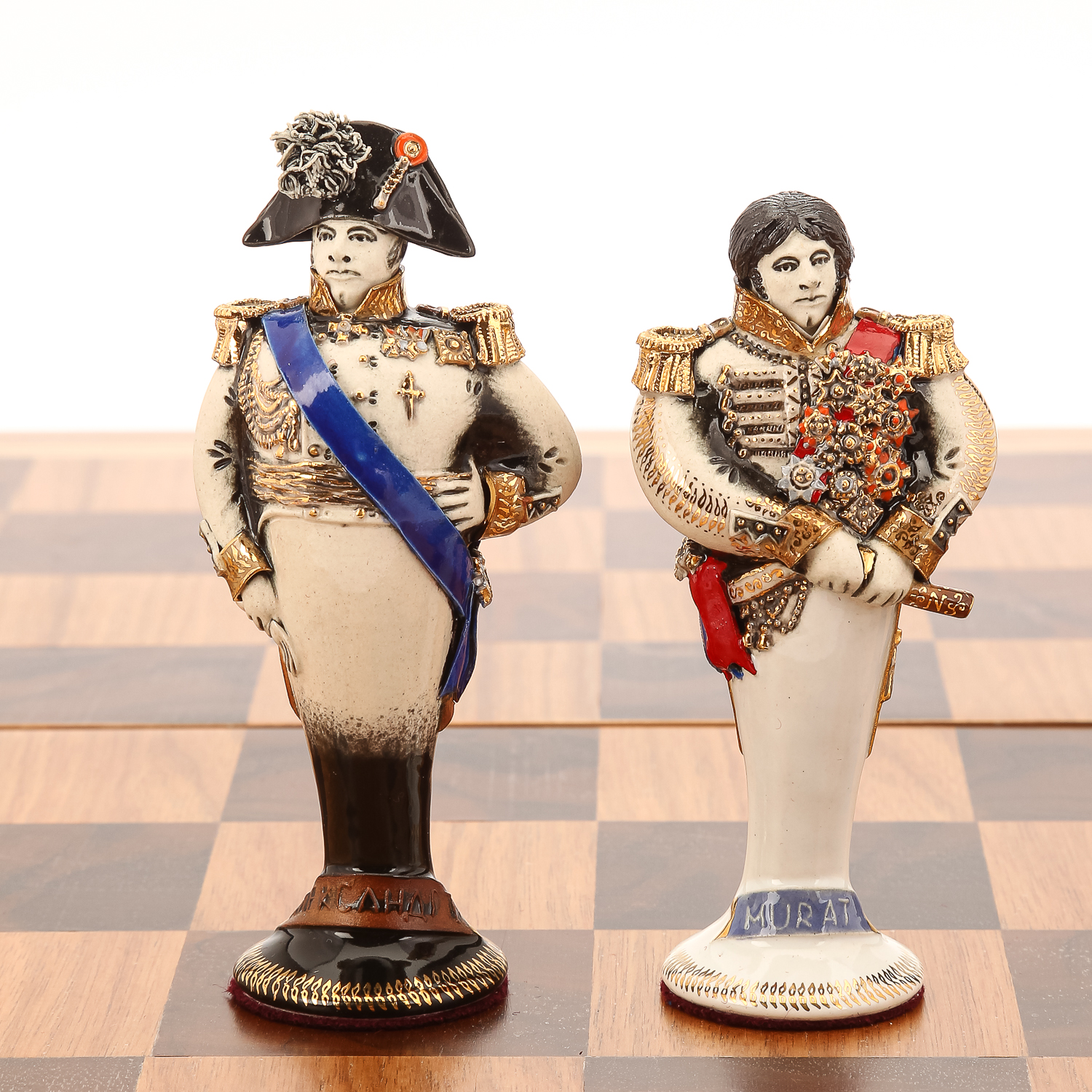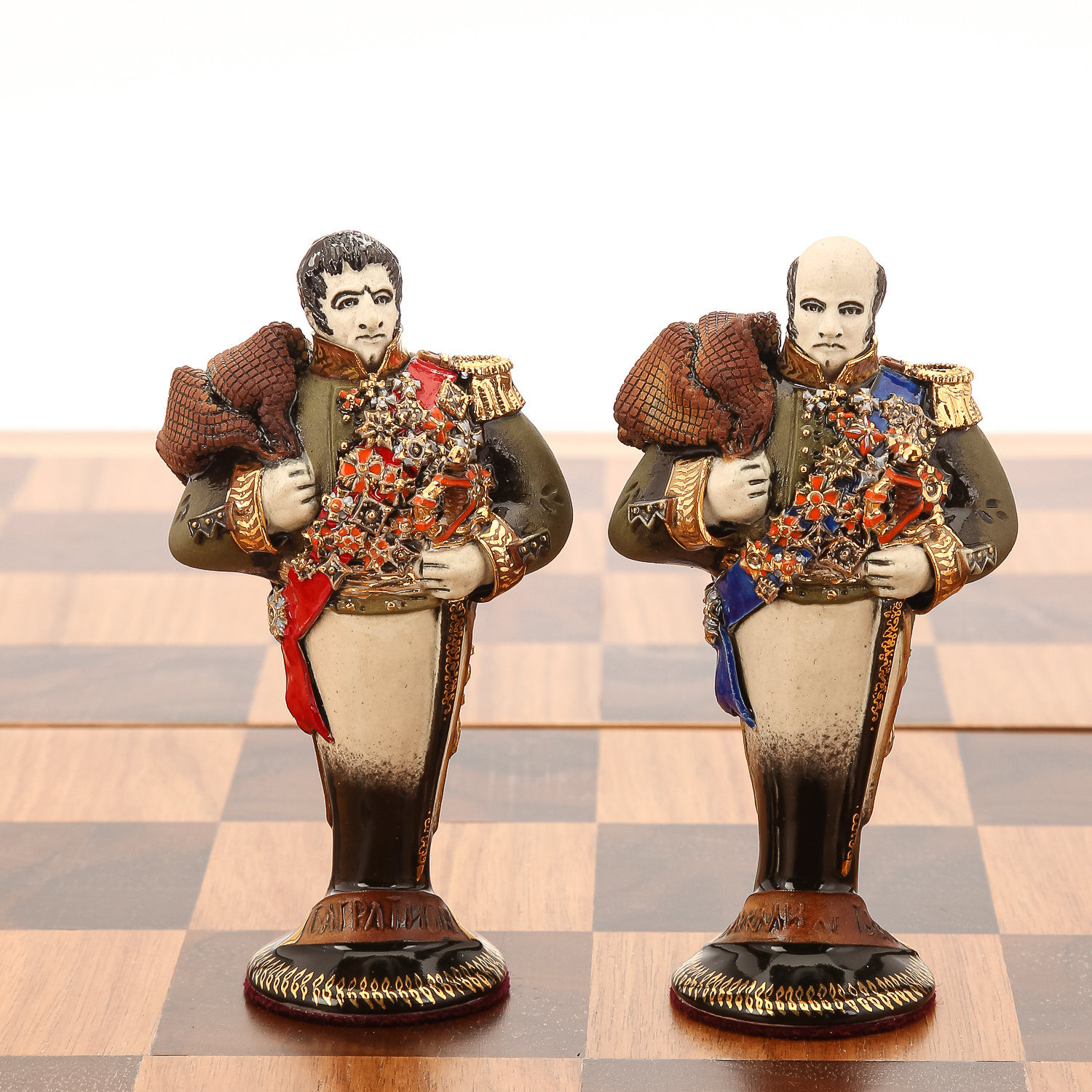 Оригинальная художественная  концепция этих шахмат и мастерство исполнения определяют их стоимость. Шахматные фигуры - это высококлассные образцы работы российского художника по фарфору. На  поле доски  -  войска Наполеона и Александра I. Образы воинов русской и французской армий отличаются высокой детализацией.  Фигурки являются штучными интерьерными аксессуарами.