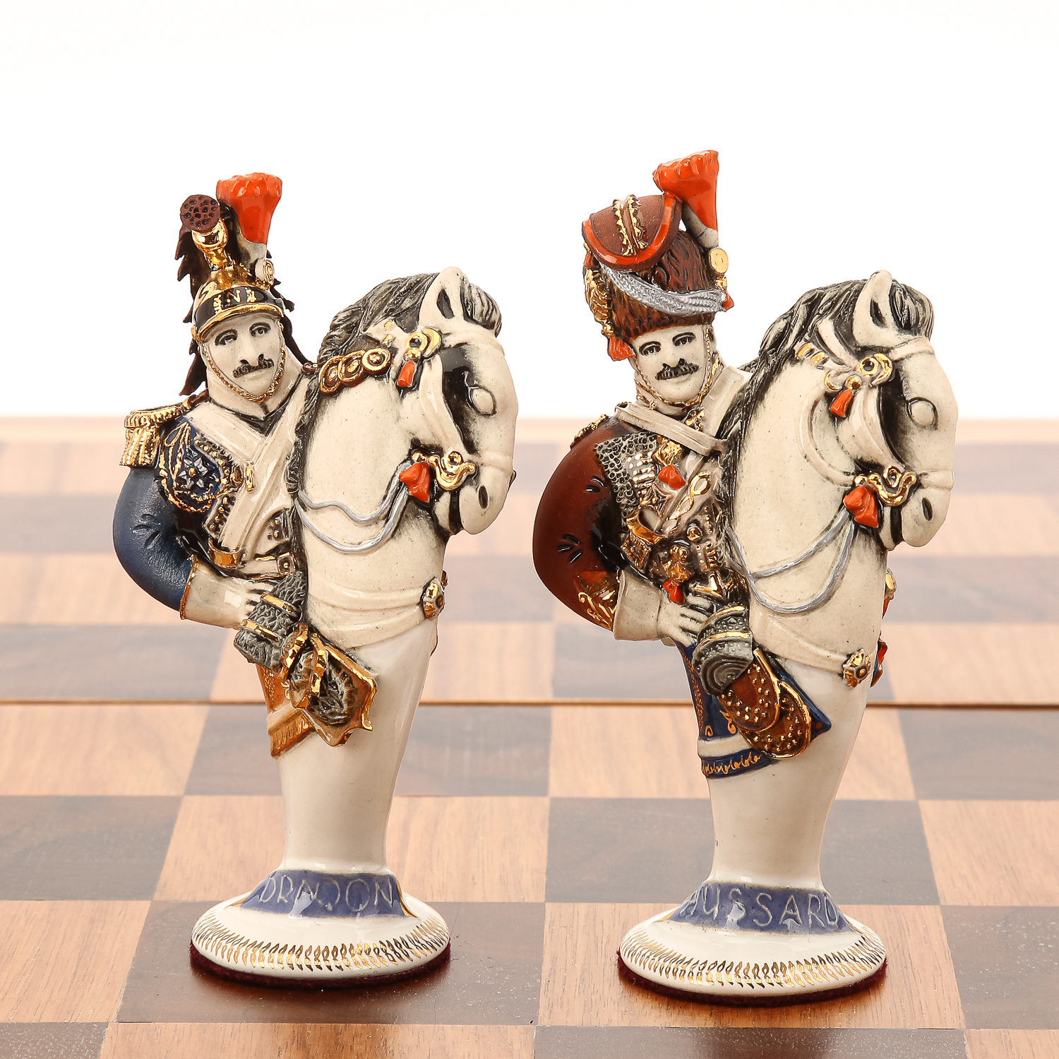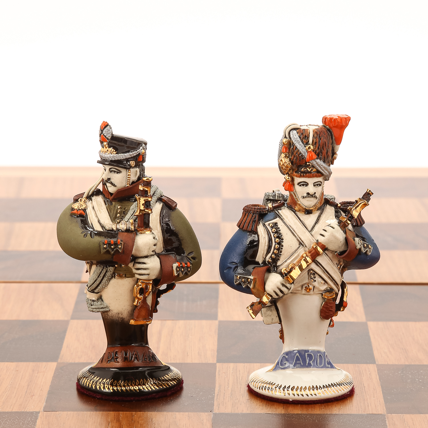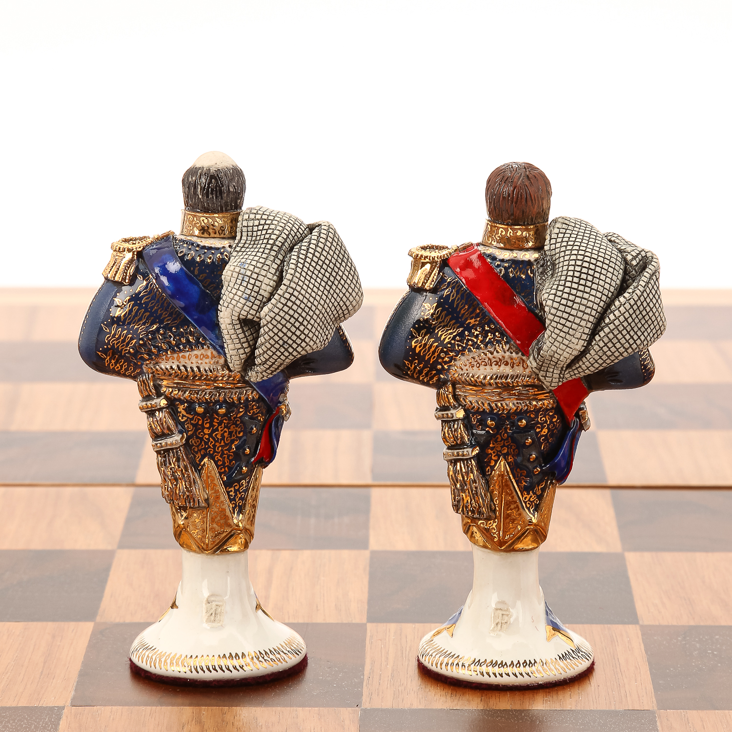 Оригинальная художественная  концепция этих шахмат и мастерство исполнения определяют их стоимость. Шахматные фигуры - это высококлассные образцы работы российского художника по фарфору. На  поле доски  -  войска Наполеона и Александра I. Образы воинов русской и французской армий отличаются высокой детализацией.  Фигурки являются штучными интерьерными аксессуарами.
